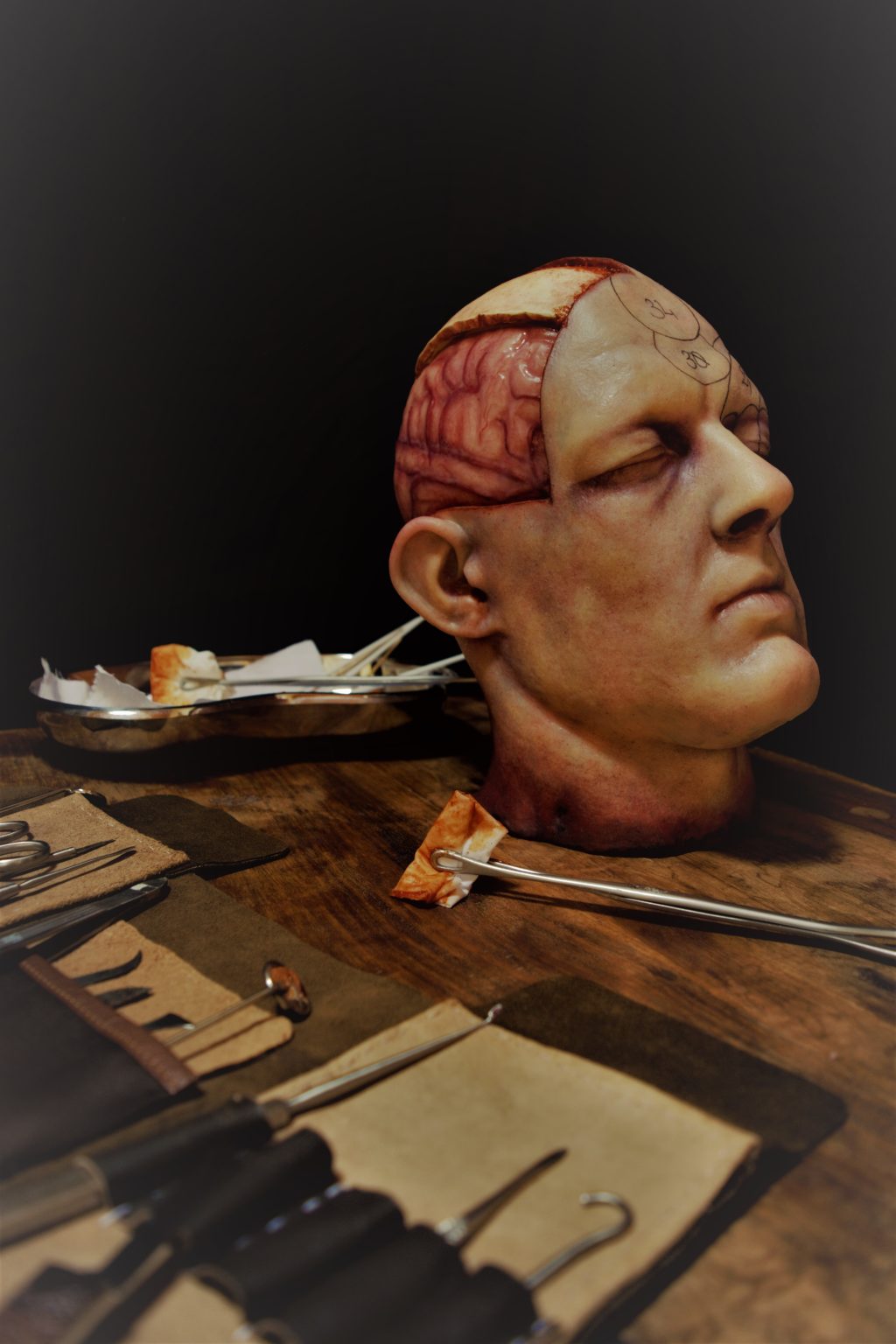 This piece has been fabricated for a theoretical film. In the story a 19th century anatomist-artist has been arrested and condemned to death for stealing body parts from a dissection room over a period of time, then fashioning them into a chess set. Upon presenting the set to his piers, students and colleagues, they decide he has lost his mind to create such a grotesque piece of art and is condemned to death for the mistreatment of the corpses he had been trusted to and for being a dangerous criminal.