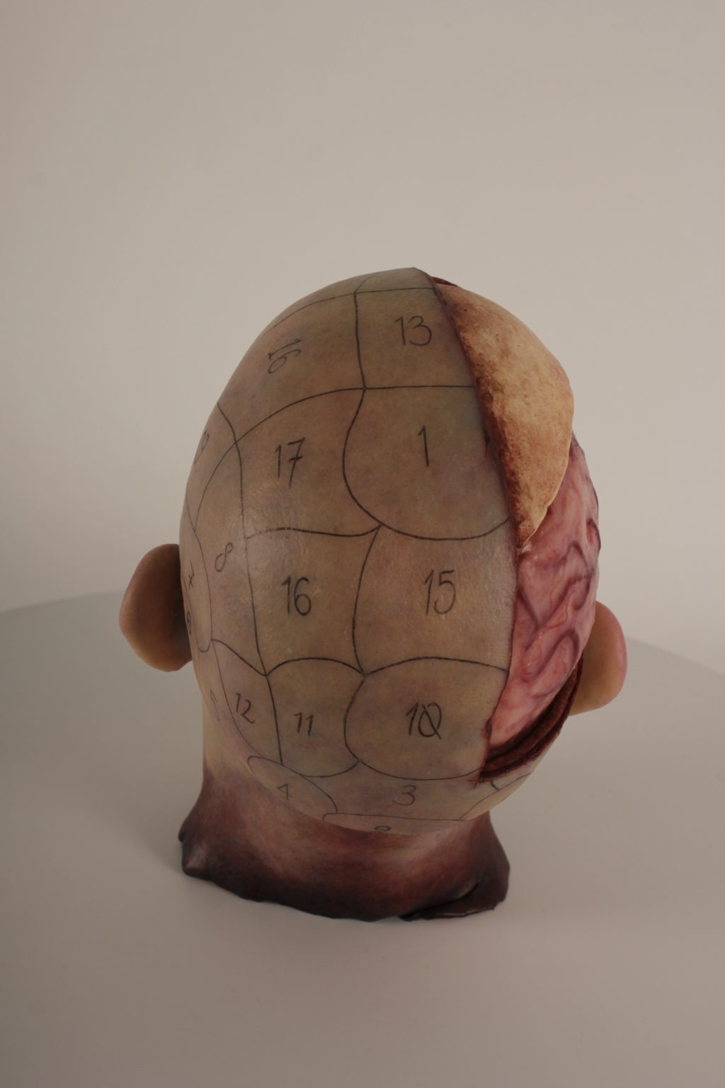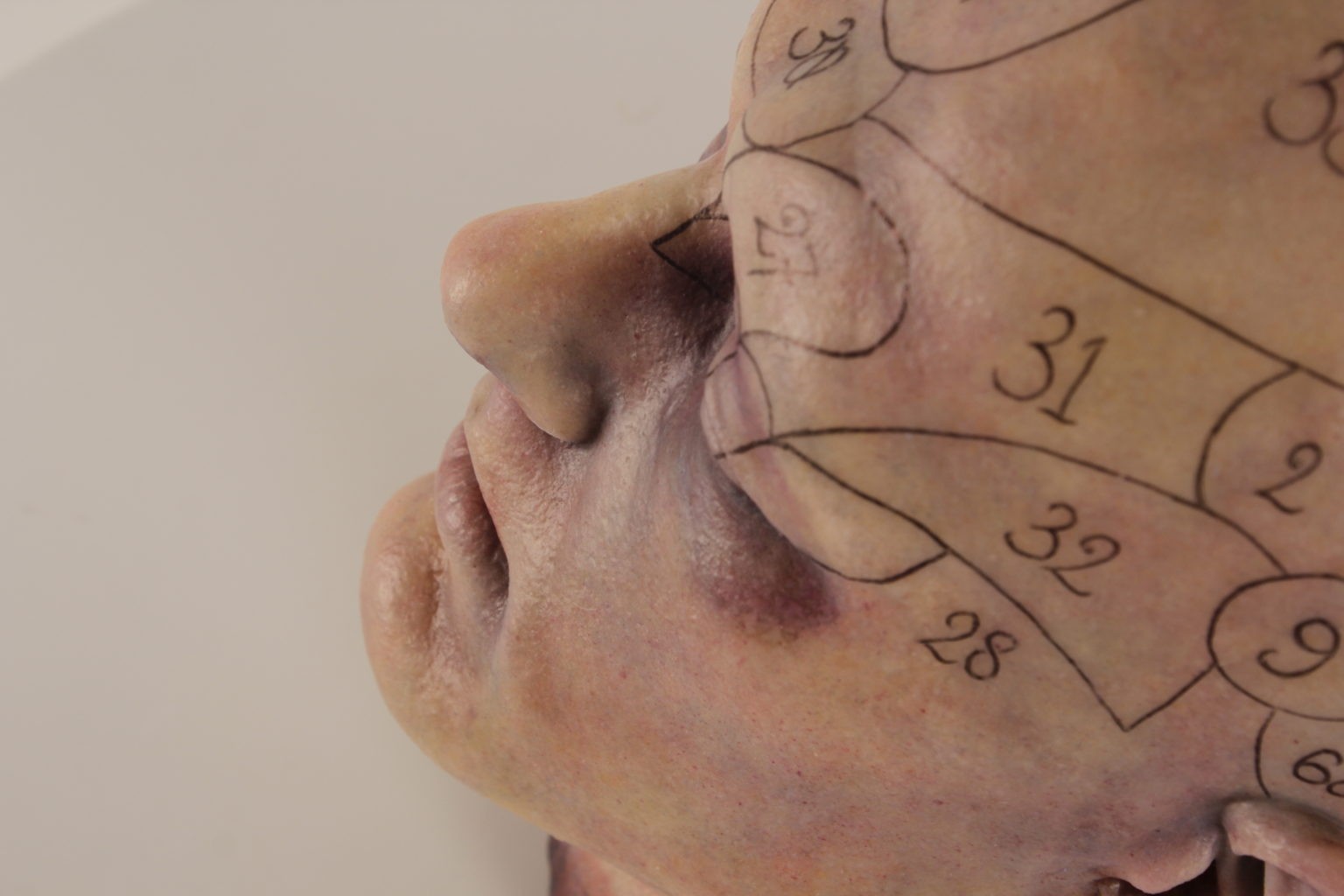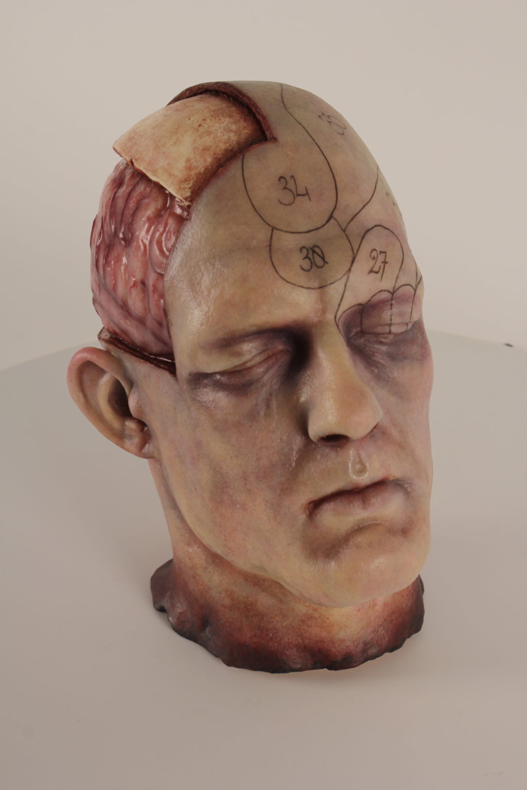 This piece involved creating a monster clay life cast of my model's head, sculpting into this, moulding, then casting this in platinum silicone and painting, the skull section was cast in resin.