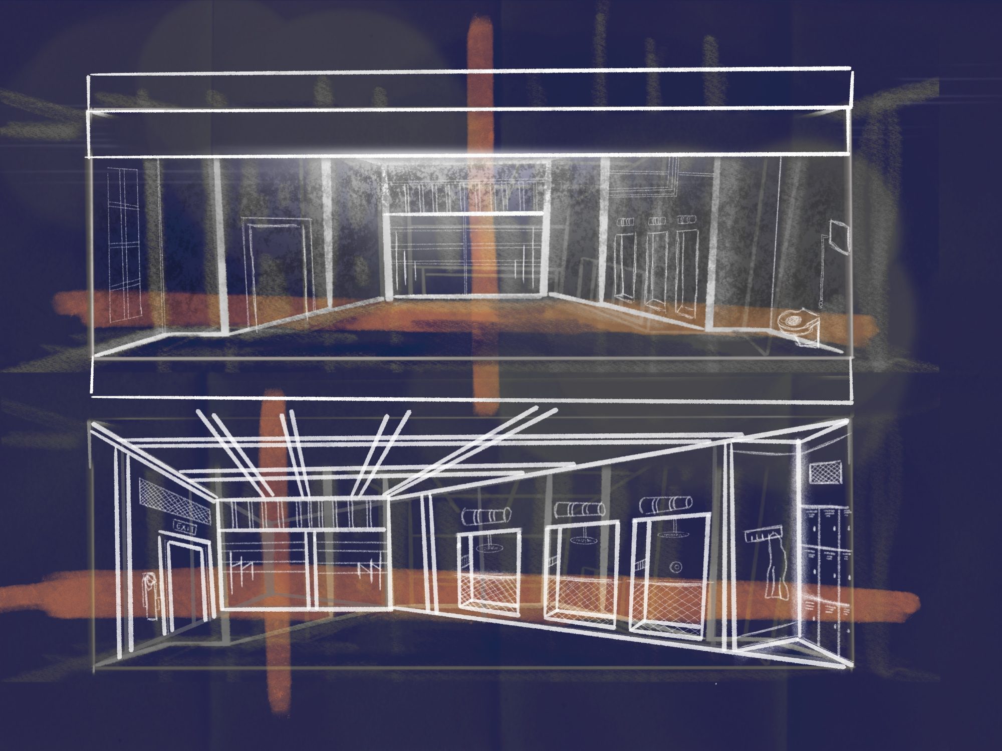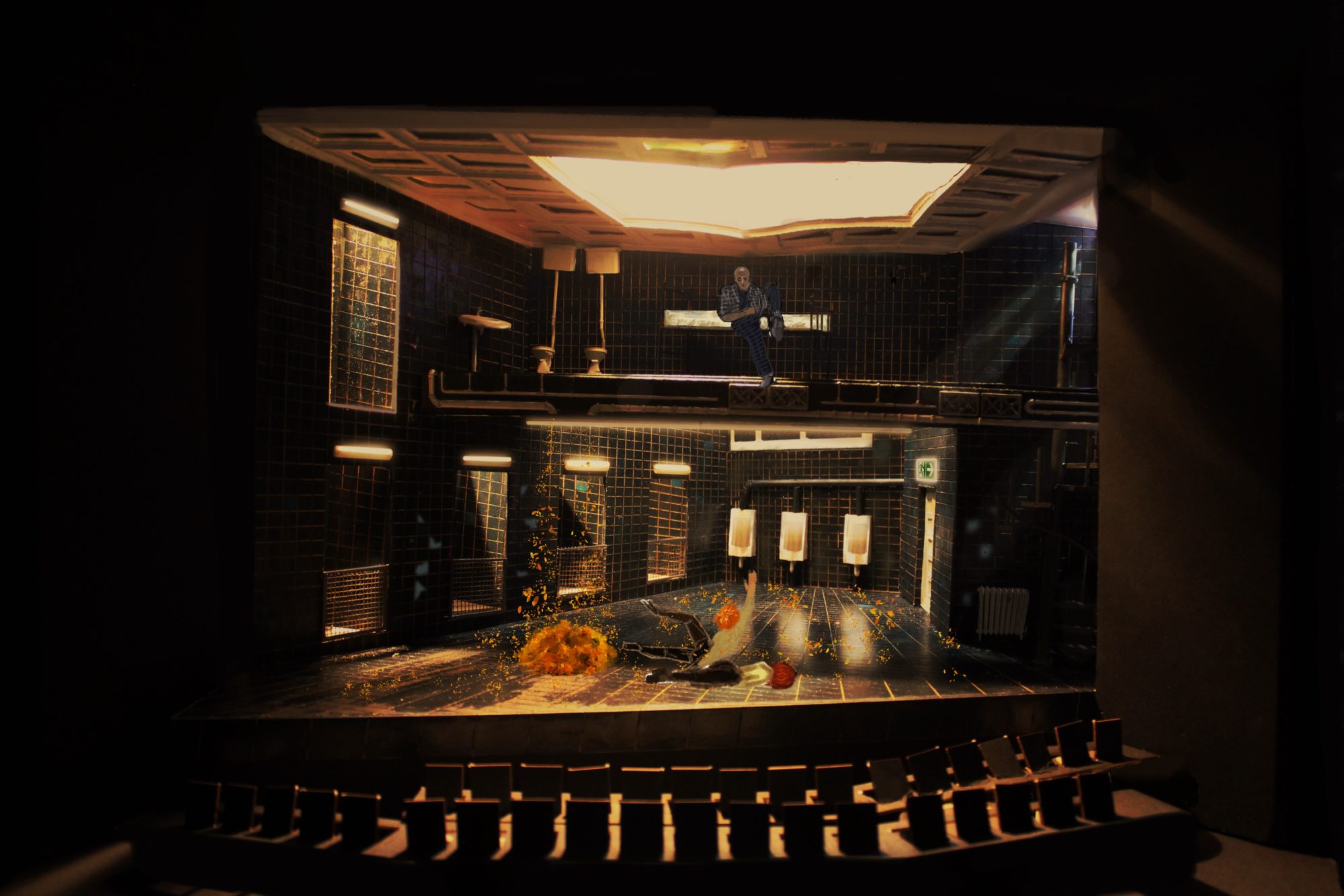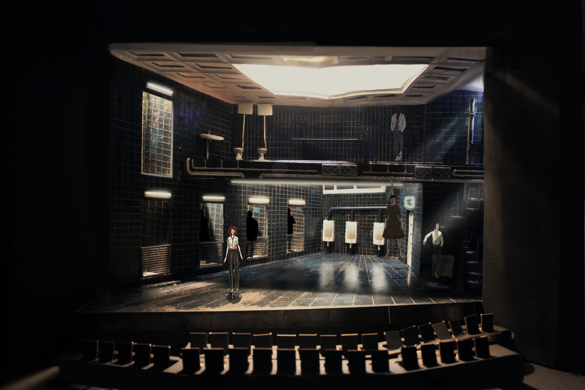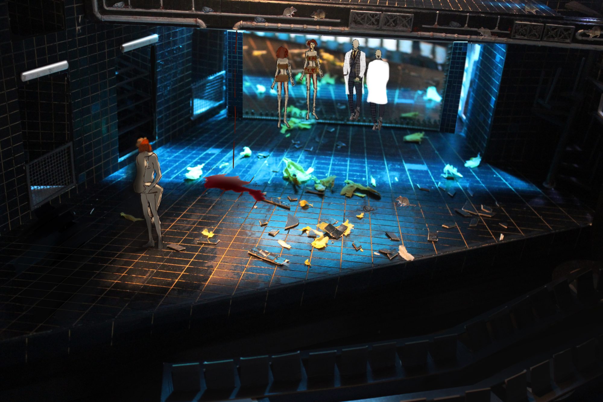 ‘Cleansed’ a story about a sadistic doctor testing the boundaries and extremities of love with inhuman methods. My design explores the concept ‘spaces of trauma’ which encapsulates Kane’s work. The story treads a balance between horrific acts and tender moments of love. The claustrophobic traumatic space induces a sense of discomfort and unease. The design is created with elements of mental asylums, torture chambers and abandoned universities with hidden crevasses and their secrets. From damp cage showers, to mortuary fridges and rat infested rafters the design enhances the shock factor the piece demands and that Kane strived for. ‘Cleansed’ written by Sarah Kane. Designed for the Abbey Theatre in Dublin. Major Project.