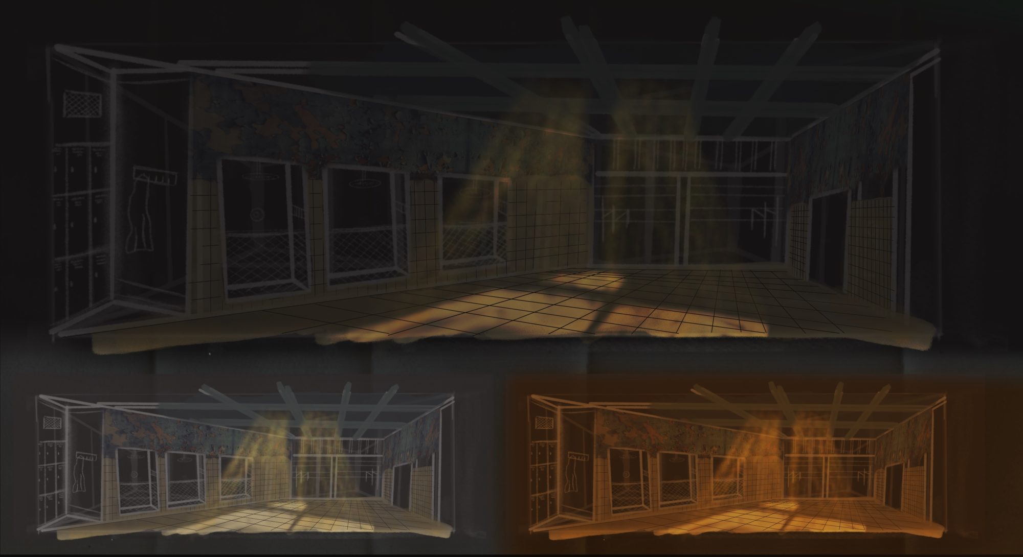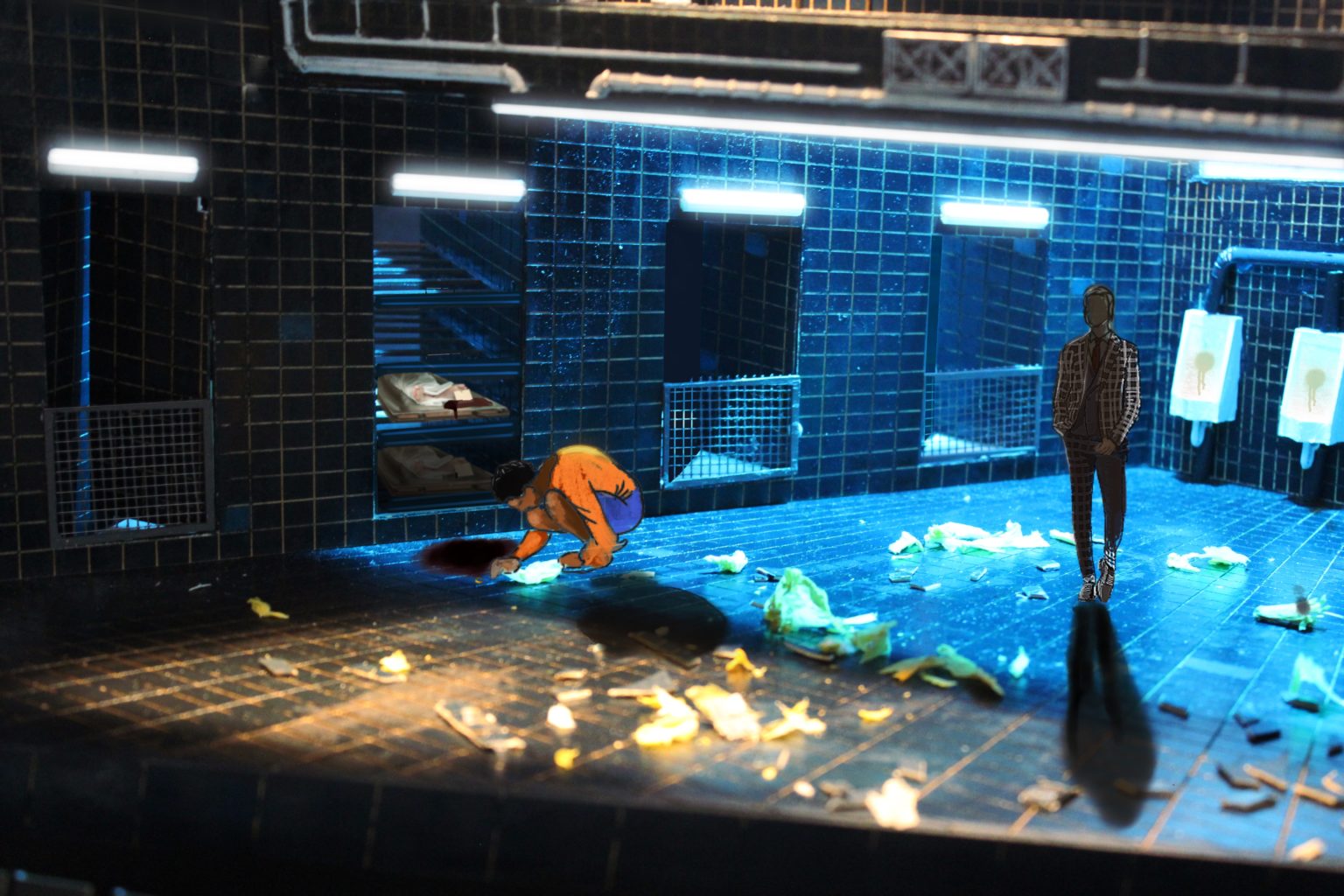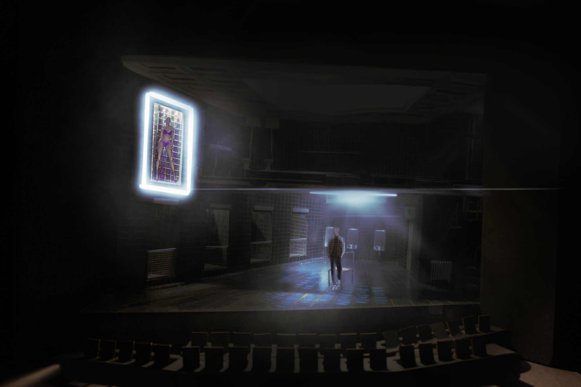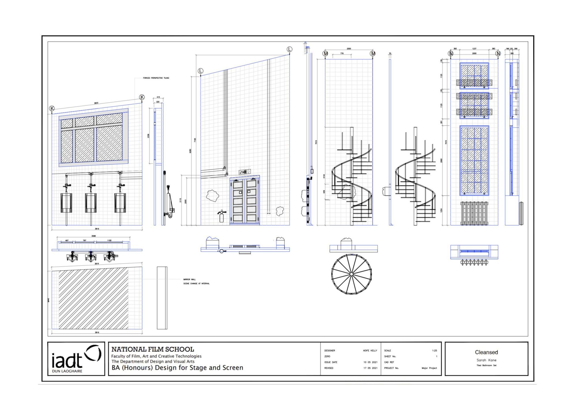 ‘Cleansed’ a story about a sadistic doctor testing the boundaries and extremities of love with inhuman methods. My design explores the concept ‘spaces of trauma’ which encapsulates Kane’s work. The story treads a balance between horrific acts and tender moments of love. The claustrophobic traumatic space induces a sense of discomfort and unease. The design is created with elements of mental asylums, torture chambers and abandoned universities with hidden crevasses and their secrets. From damp cage showers, to mortuary fridges and rat infested rafters the design enhances the shock factor the piece demands and that Kane strived for. ‘Cleansed’ written by Sarah Kane. Designed for the Abbey Theatre in Dublin. Major Project.