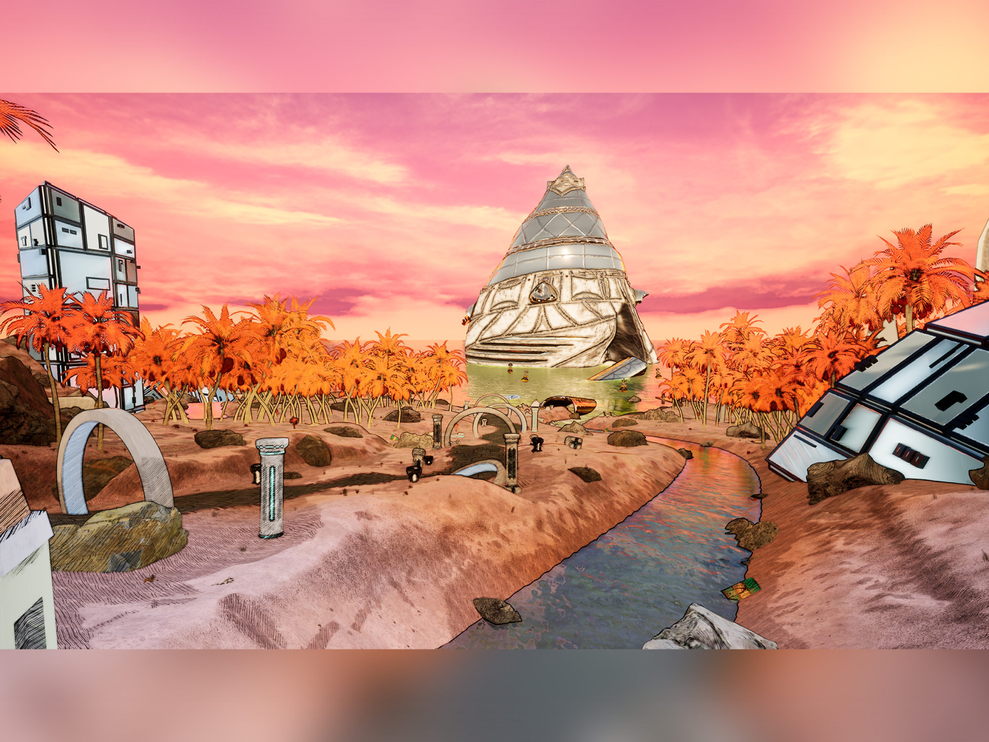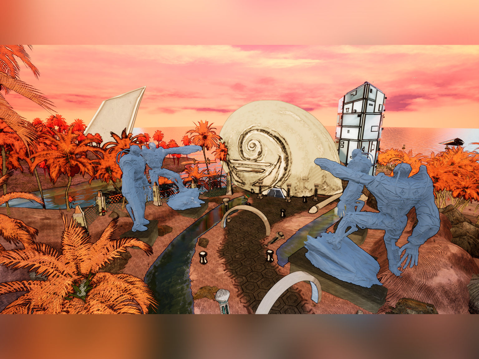 I wanted to convey this world using a vibrant colour palette and cel-shaded art style. I took inspiration from the natural, flowing shapes of seashells when designing some of my buildings. The main programs I used were 3DS Max, Substance Painter and Unreal Engine.