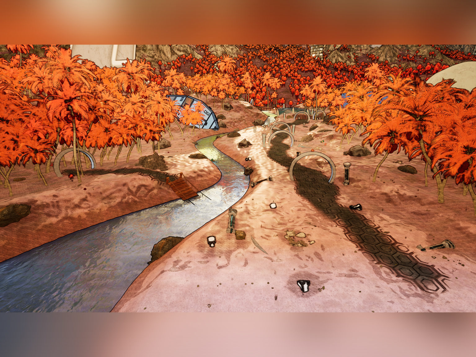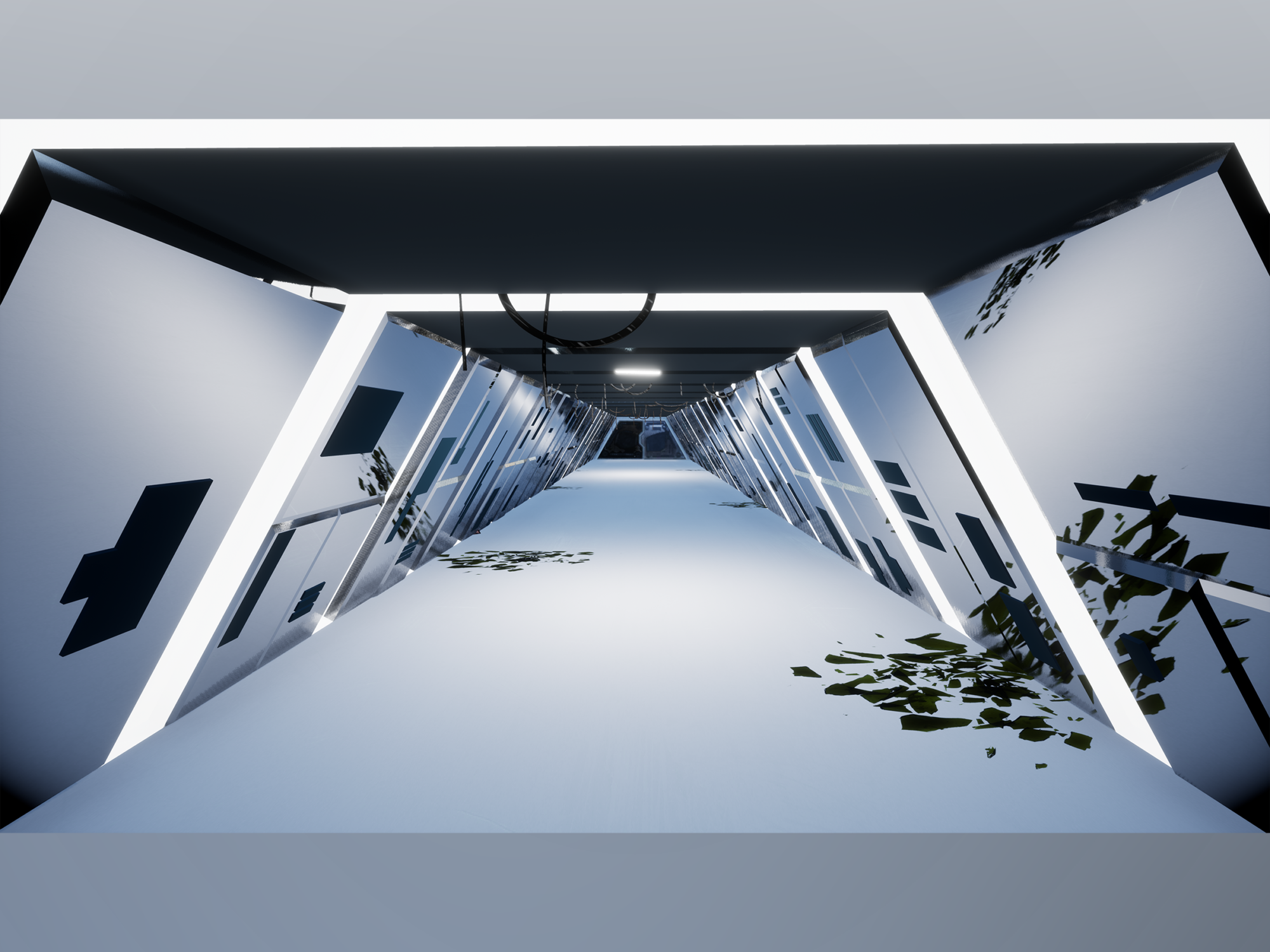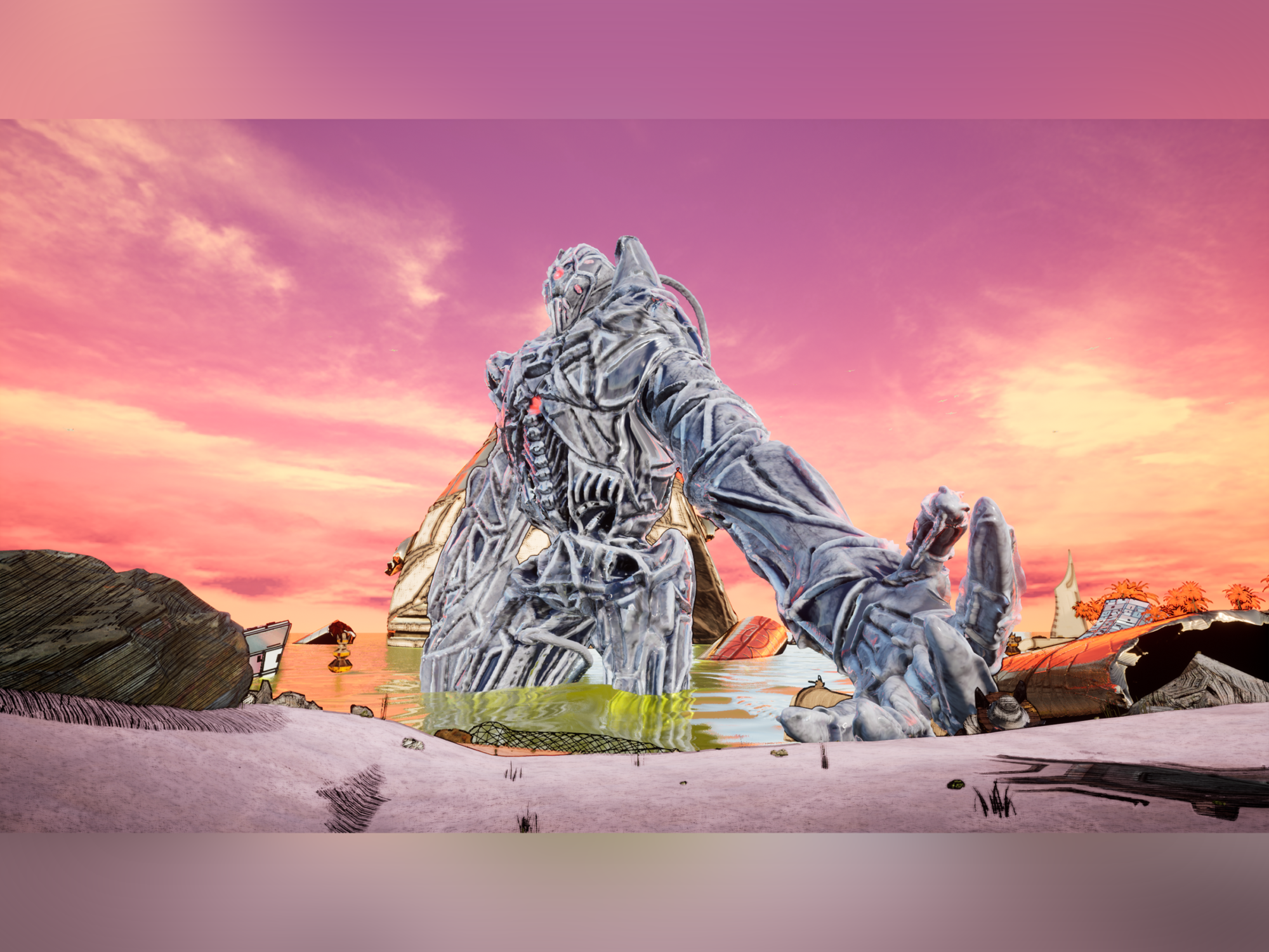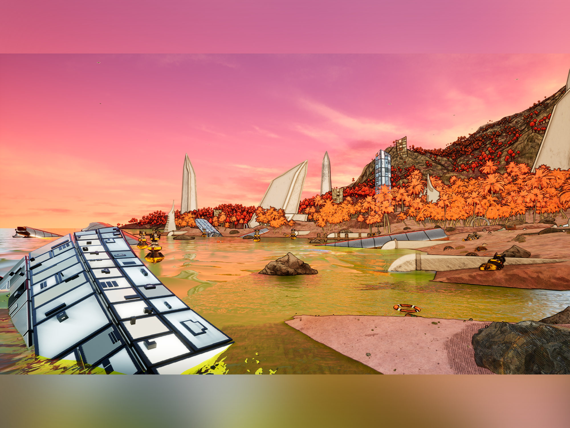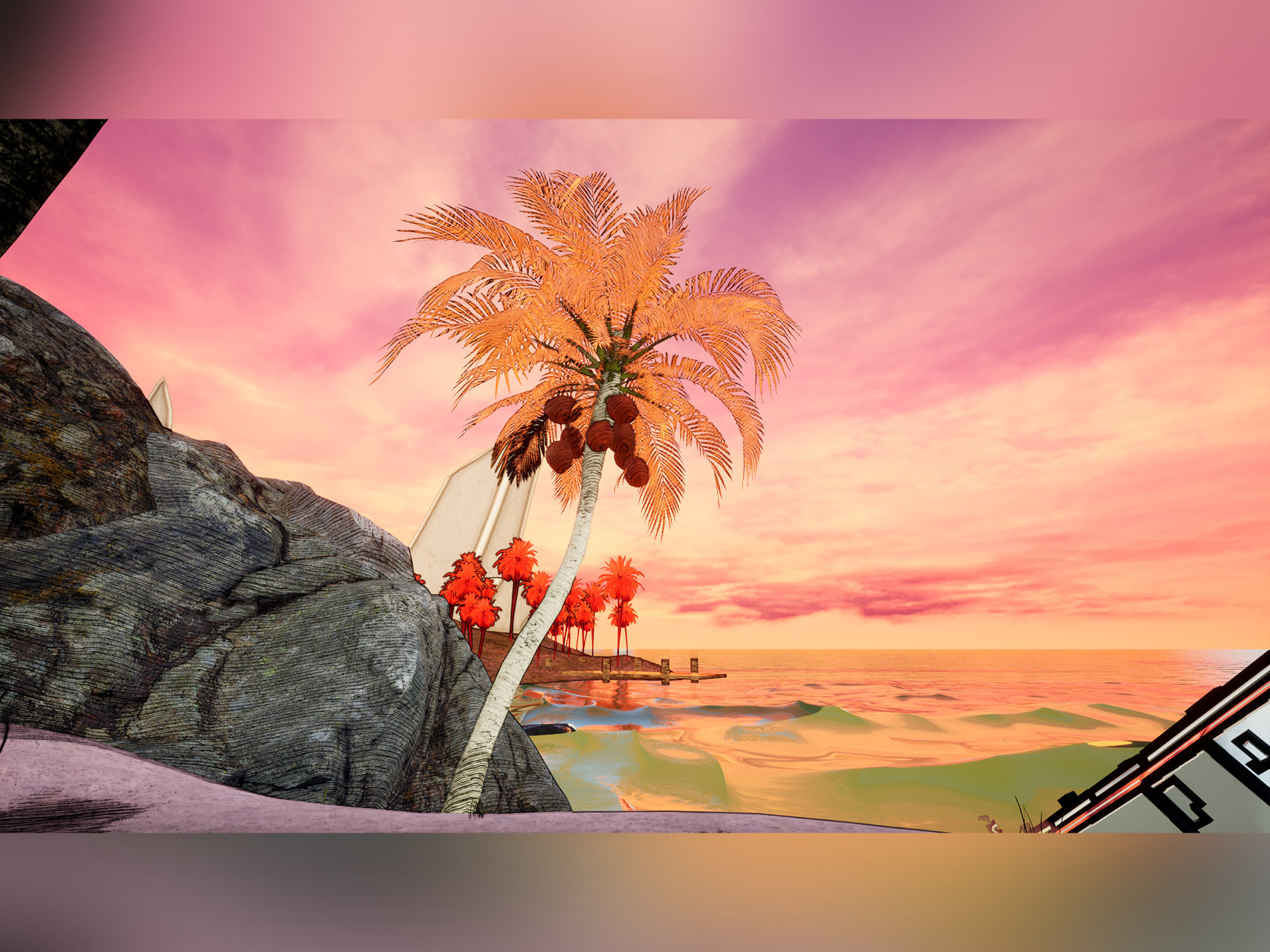 Golden Tide Island is a game level set on a sci-fi tropical island. I wanted to explore the juxtaposition of this peaceful natural landscape against the backdrop of towering ruins of manmade architecture. It is set in a near future where biological warfare has forced the remainder of the human race to live in remote colonies. The player wakes up after a coma to find the living facility empty. They explore the island, walking down to the beach. Suddenly, a large combat robot emerges from the sea. Although the situation seems dangerous, the robot extends a hand for the player to climb onto…