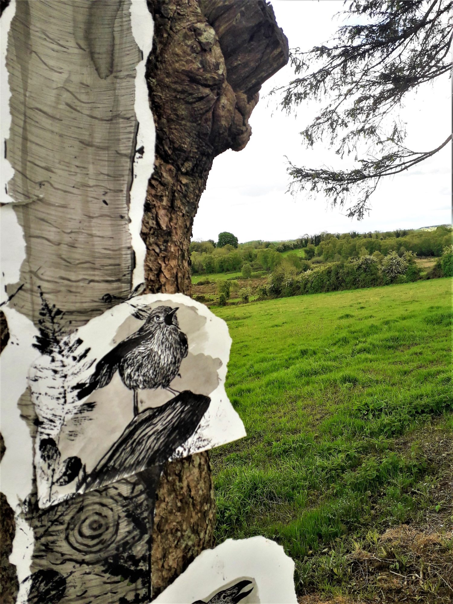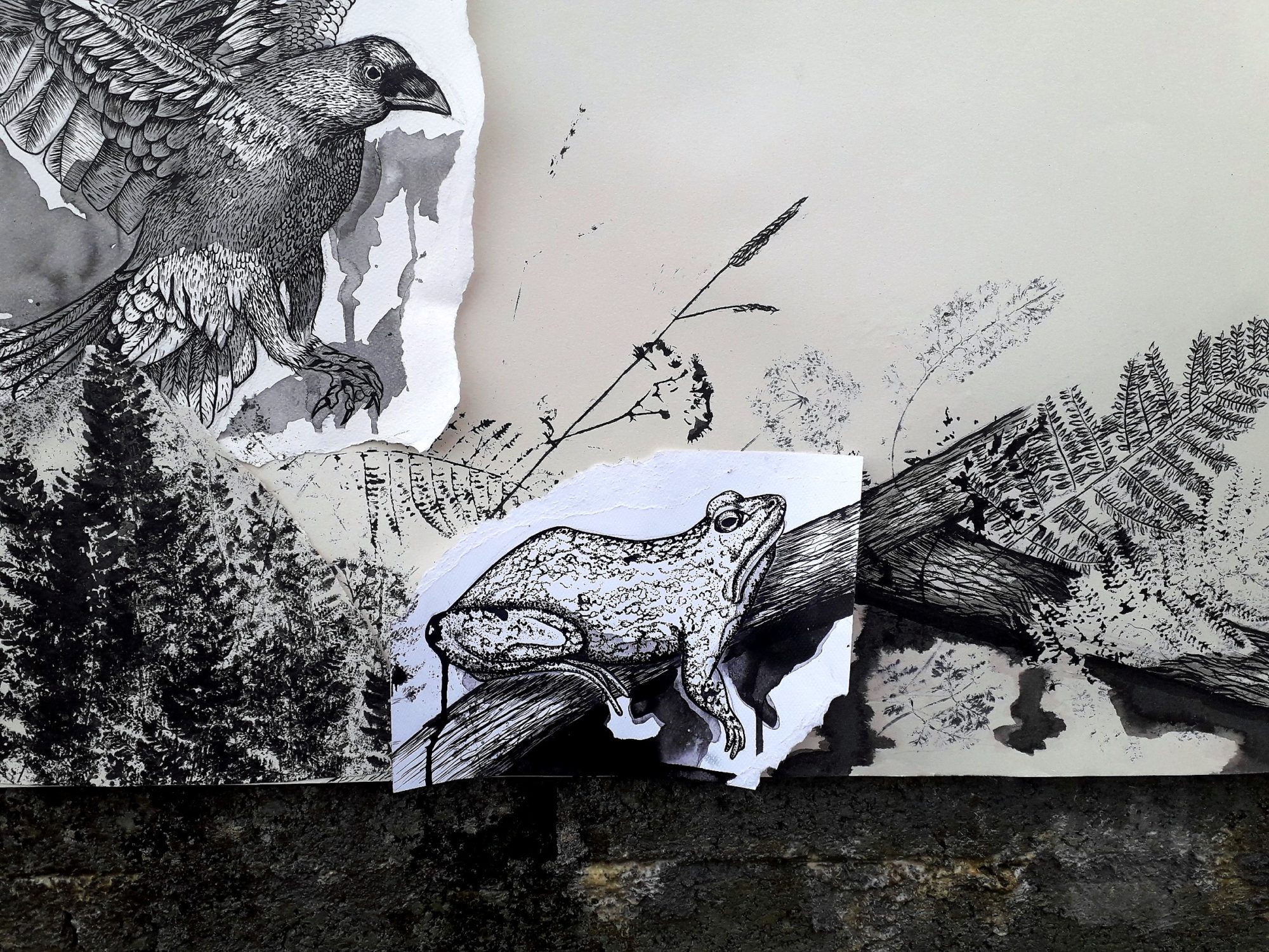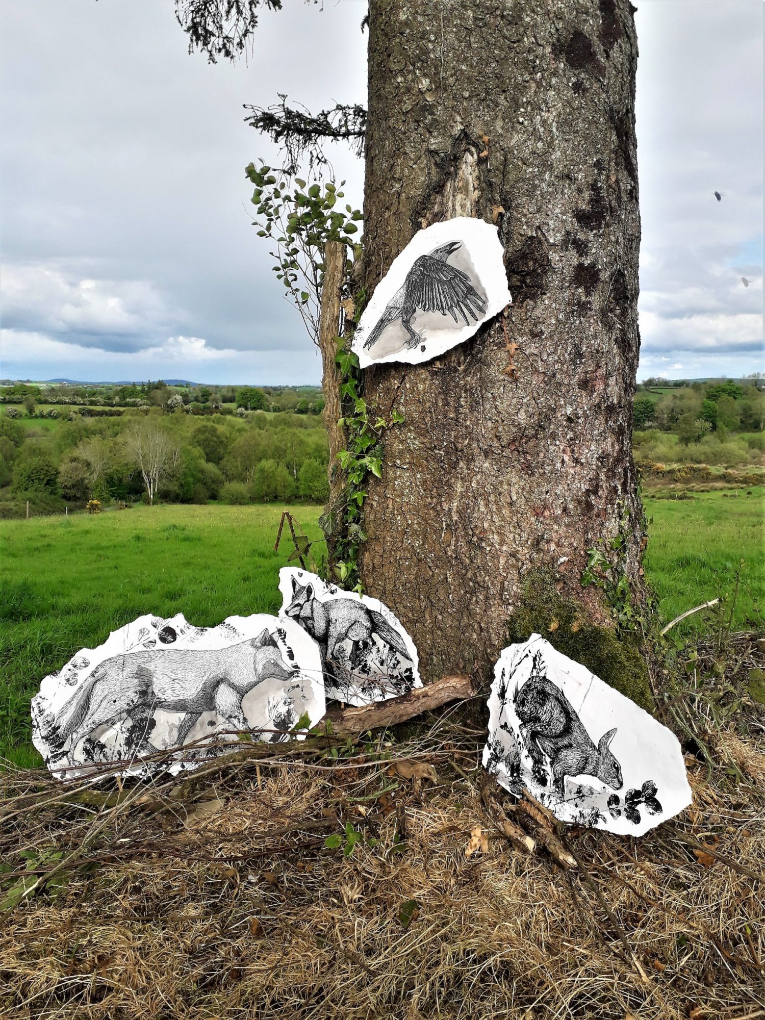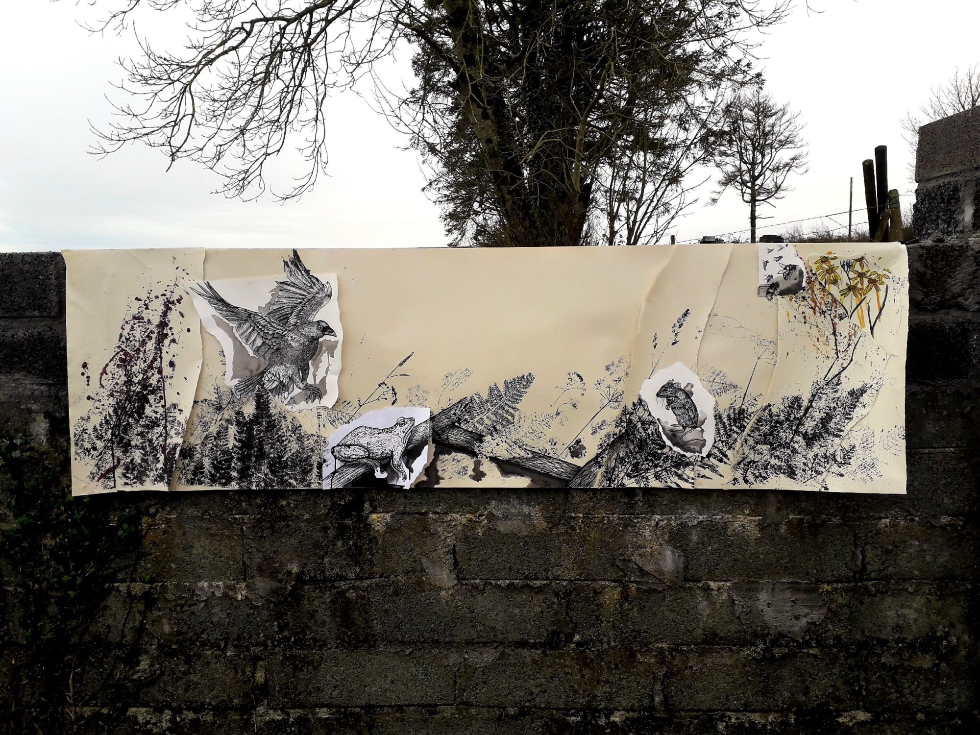 2021, Installation, Paper, Ink, Paint, Dimensions VariableMy project offers a visual experience of rural Ireland, focusing on the thriving flora and fauna found there. The research process involved a continuous study of my outdoor environment, including photographing wildlife, gathering plant samples and locating animal tracks to pick the best location for a motion camera. The works are made up of various layers, collaged together, creating a sense of depth as well as demonstrating the complexity of the environment I have studied. To integrate my research process into the work, I have installed and photographed my drawings in the natural environment. I have also experimented with scanning and digitally editing elements of my drawings and research images. My works incorporates printed elements that have been made directly from plants. The animals are represented in a more graphic and intense way, drawn onto torn scraps of paper, bringing them into focus.