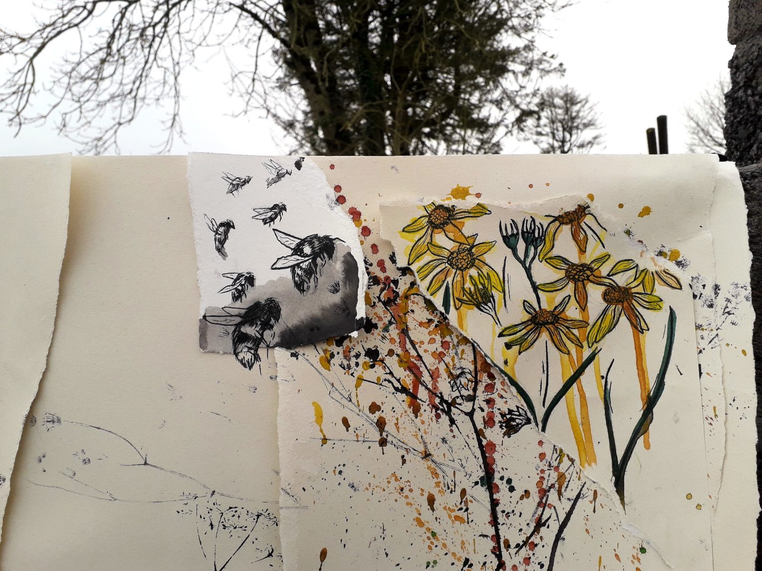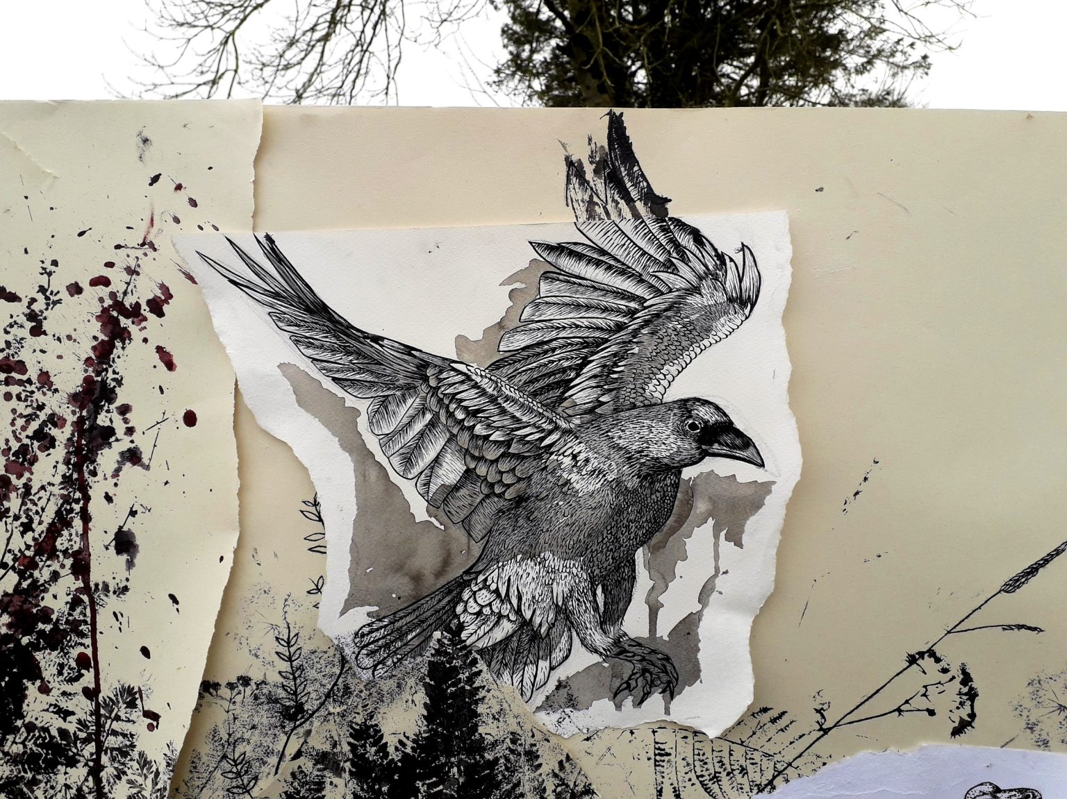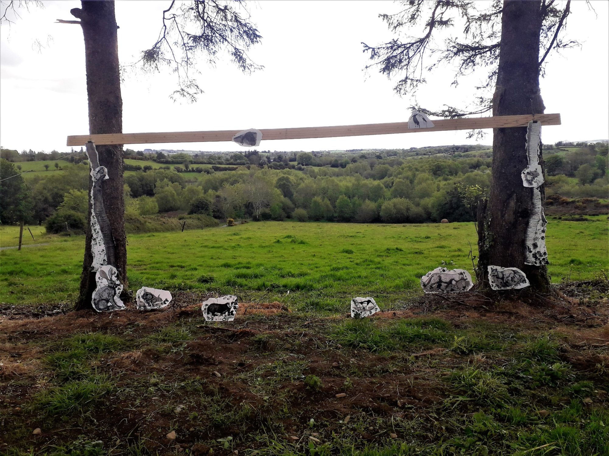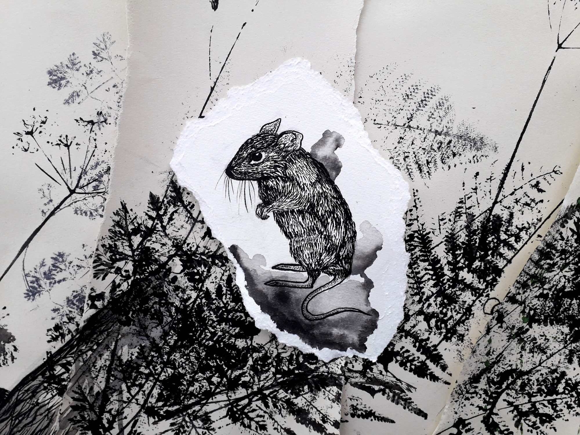 2021, Installation, Paper, Ink, Paint, Dimensions VariableMy project offers a visual experience of rural Ireland, focusing on the thriving flora and fauna found there. The research process involved a continuous study of my outdoor environment, including photographing wildlife, gathering plant samples and locating animal tracks to pick the best location for a motion camera. The works are made up of various layers, collaged together, creating a sense of depth as well as demonstrating the complexity of the environment I have studied. To integrate my research process into the work, I have installed and photographed my drawings in the natural environment. I have also experimented with scanning and digitally editing elements of my drawings and research images. My works incorporates printed elements that have been made directly from plants. The animals are represented in a more graphic and intense way, drawn onto torn scraps of paper, bringing them into focus.