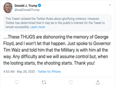On May 29th 2020, Donald Trump tweeted his support for Governor of Minnesota Tim Walz, in using the police and military in order to suppress Black Lives Matter protests. In this tweet Trump also quotes former Miami police chief Walter E. Headly, ‘when the looting starts the shooting starts.’ Twitter in response to Donald Trump’s tweet added a disclaimer: ‘This Tweet violated the Twitter Rules about glorifying violence. However, Twitter has determined that it may be in the public interest for the tweet to remain accessible.’