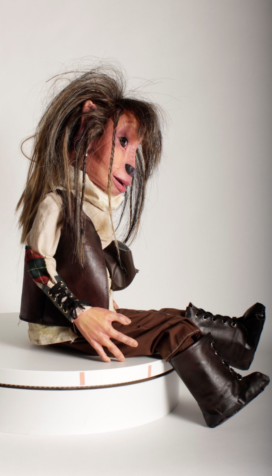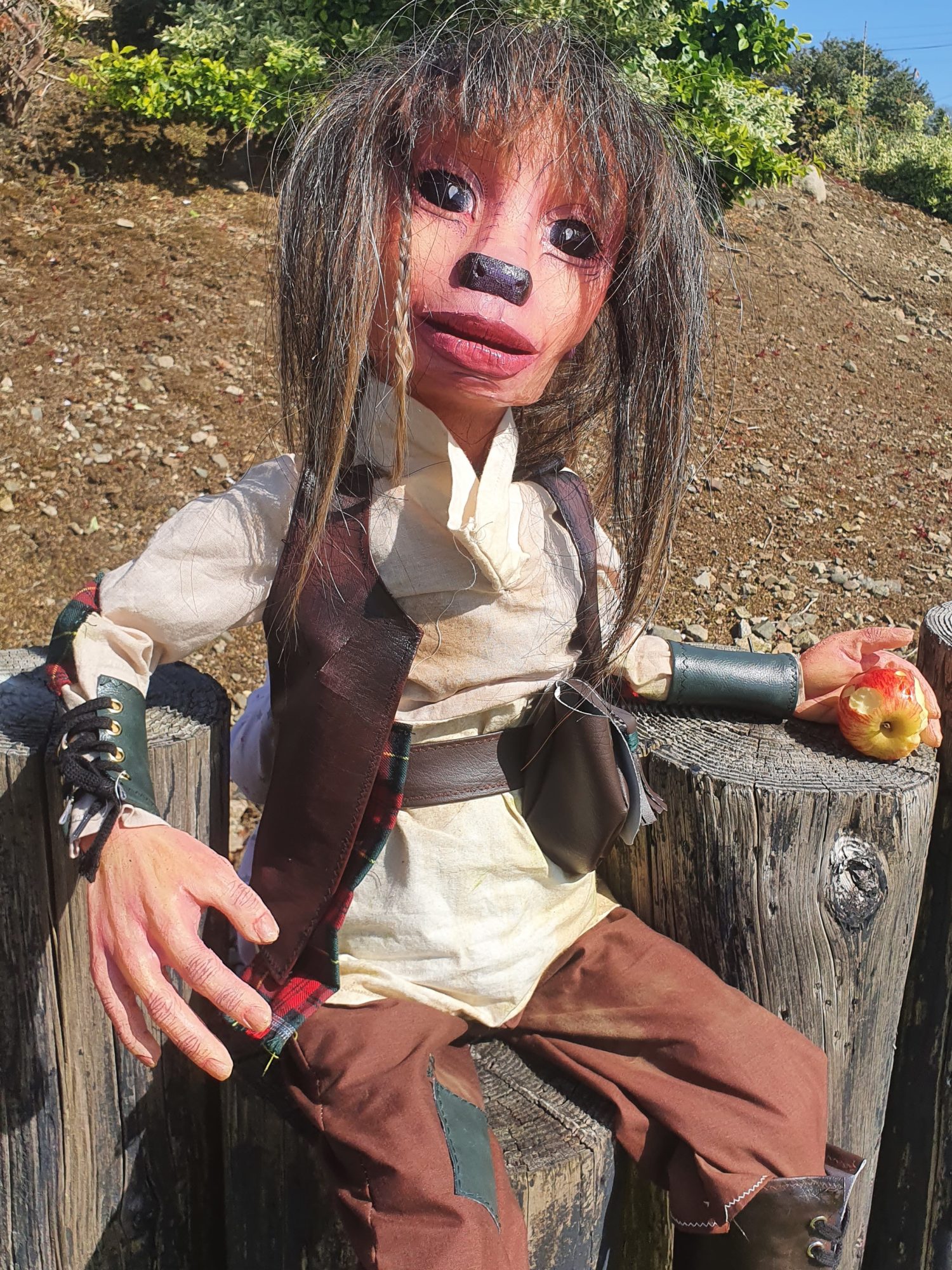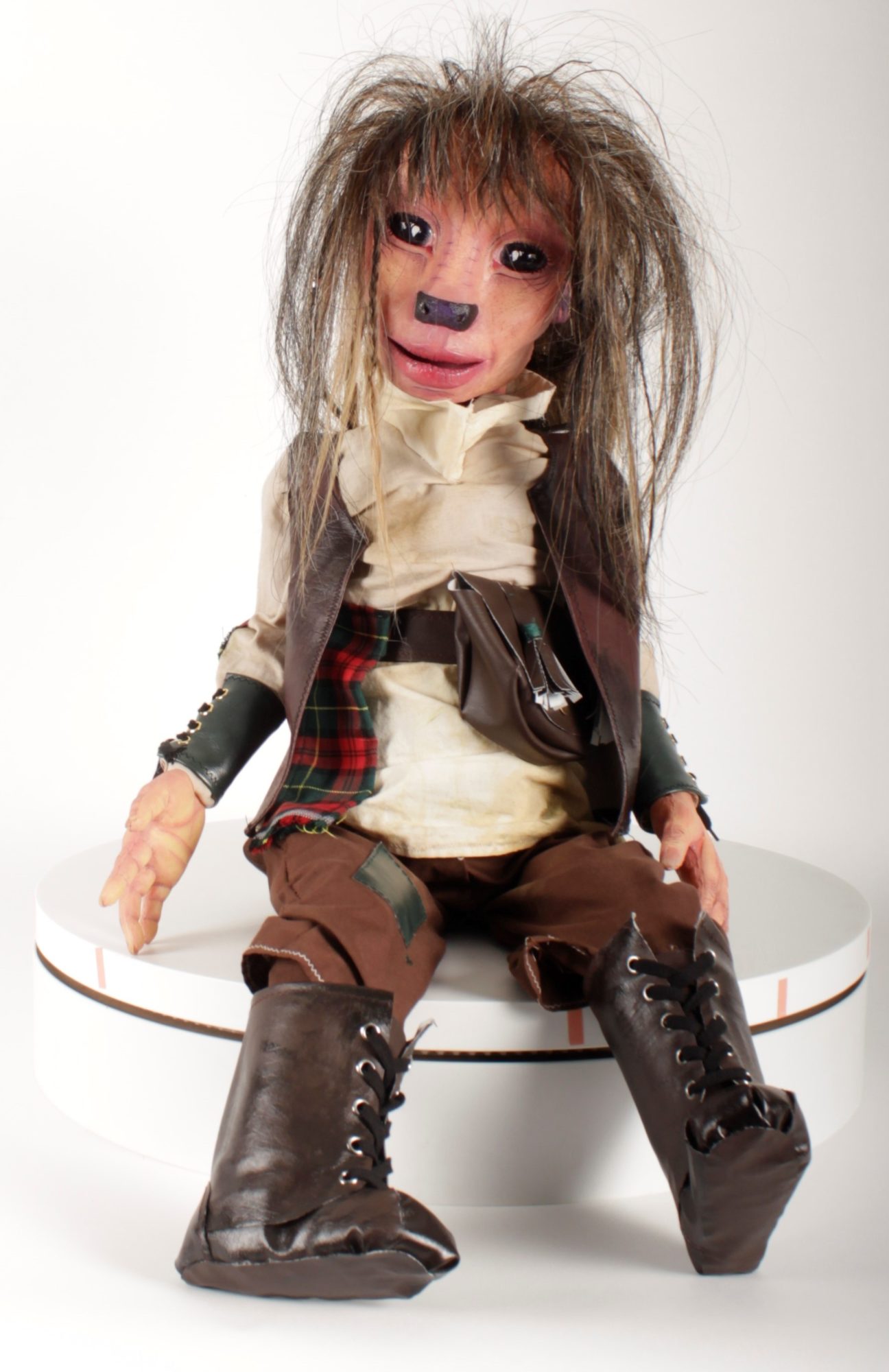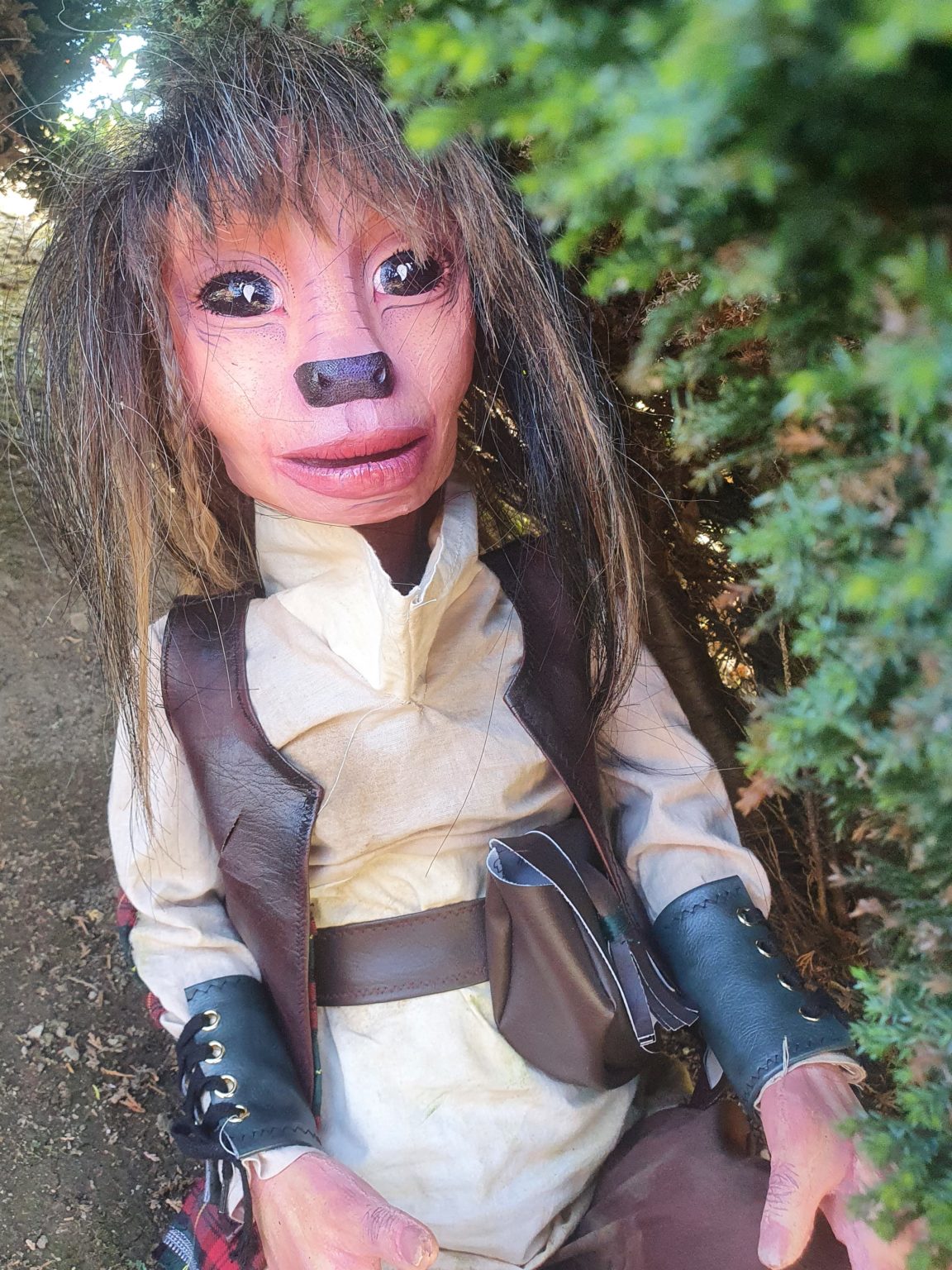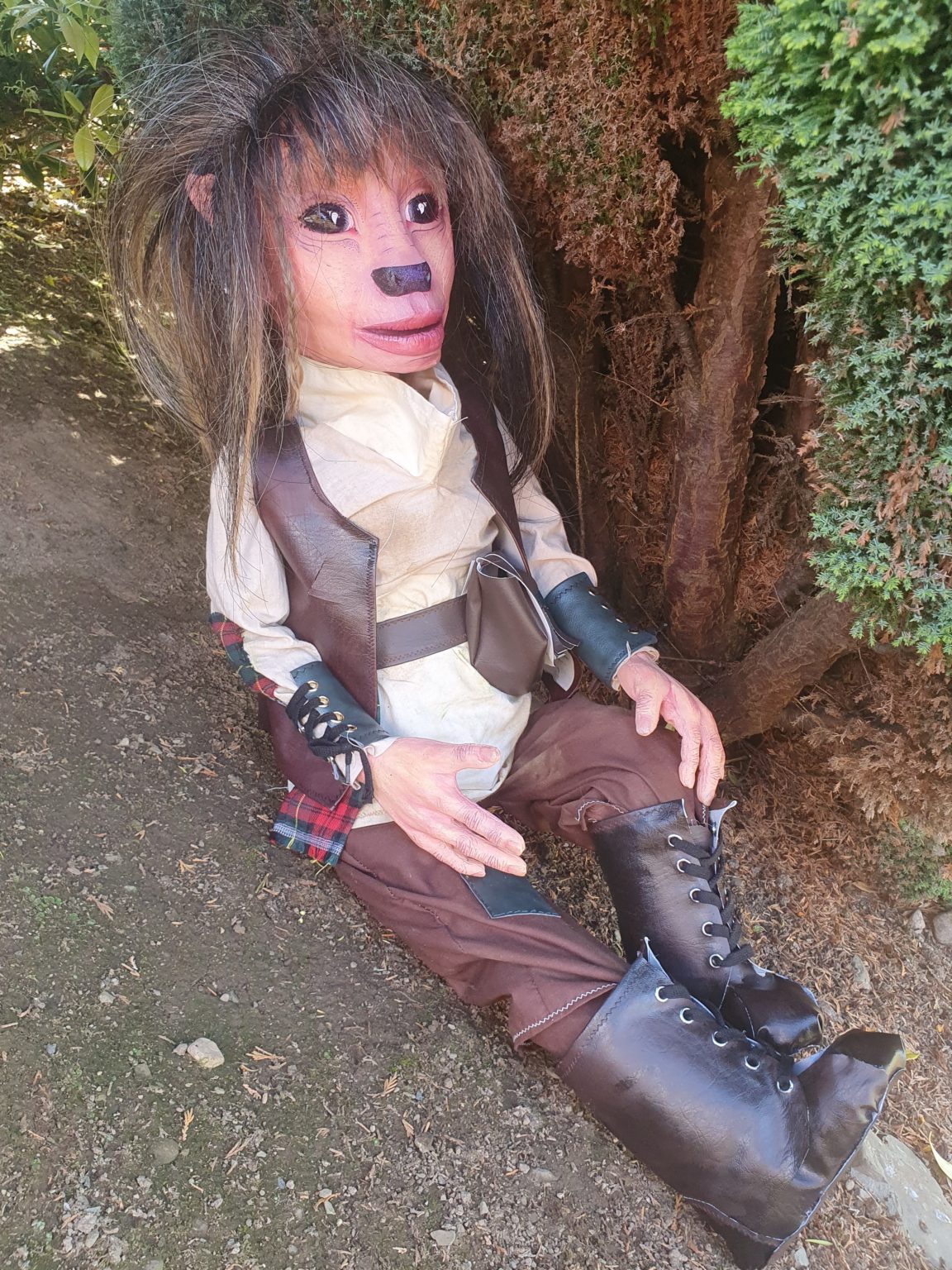 For this project I taught myself how to sew using a sewing machine and how to construct an outfit correctly. I knew from the beginning that I wouldn't be able to source clothing that would both fit and suit my puppet. Making everything myself also made the whole look more cohesive as the accessories and the clothing were made from the same materials. The accessories I made for this puppet was giving a small nod to a detail that mentioned in the original fairy-tale, that Hans left his home with only a set of bagpipes and rooster to his name. So I took that detail about the bagpipes to him being of Scottish heritage. with his outfit I added small details such as tartan elbow patches and a little tartan sash coming from his belt. For the accessories I made him some leather wrist cuffs tied with string and then I also made a Sporran style bag, which is a type of bag associated with traditional Scottish clothing. To top it all off I made sure to make the outfit not look too polished. I stained the outfit with tea, coffee and dirt to give it that worn in look. I even took the clothes outside and rubbed it into the dirt and grass to make sure it looked like he lives off the land and sits in a tree all day. For the leather pieces I scratched them with wire brushes and steel wool and painted on them to give the illusion of wear and tear. All of these little details add to the backstory of the character.