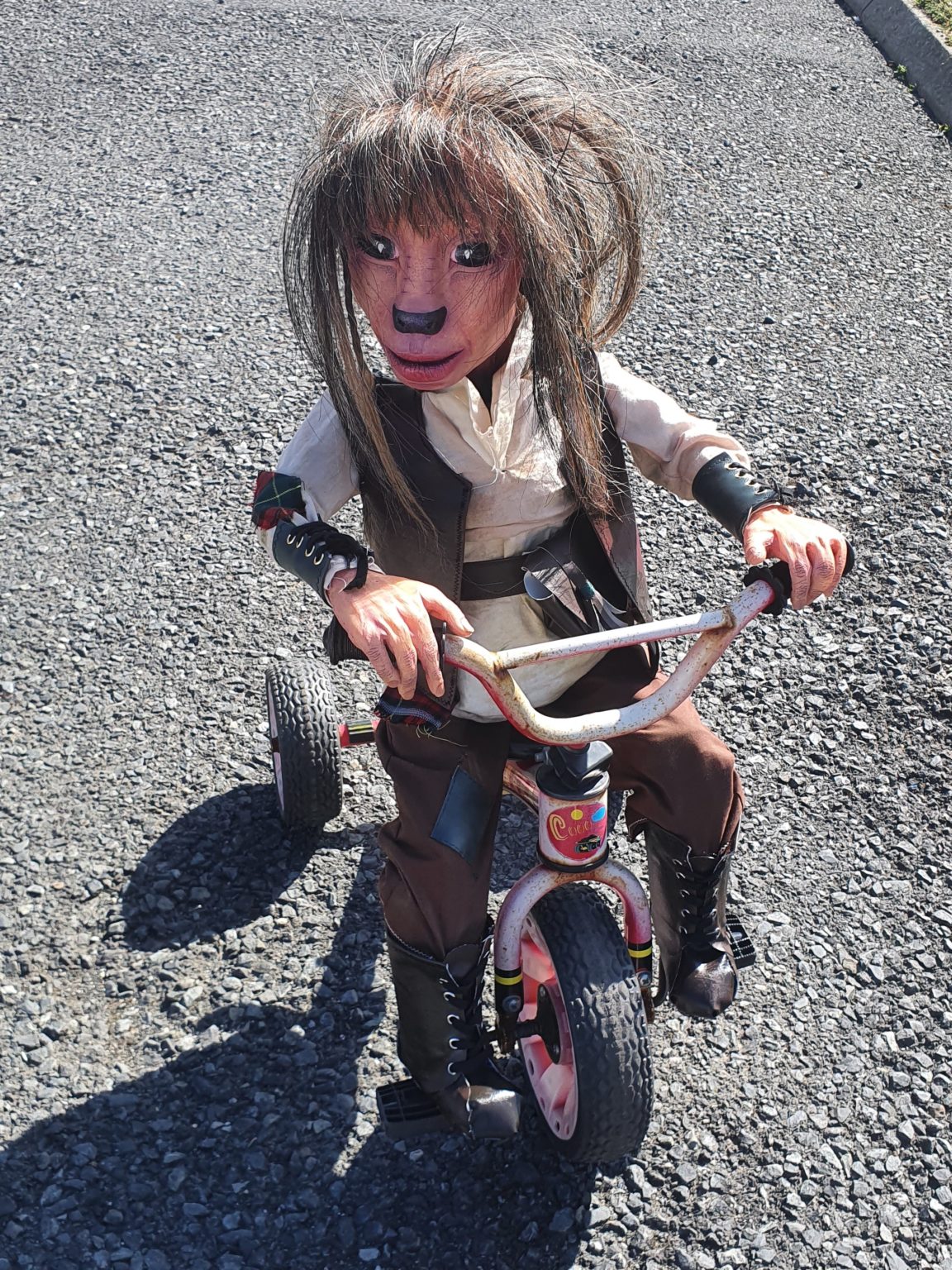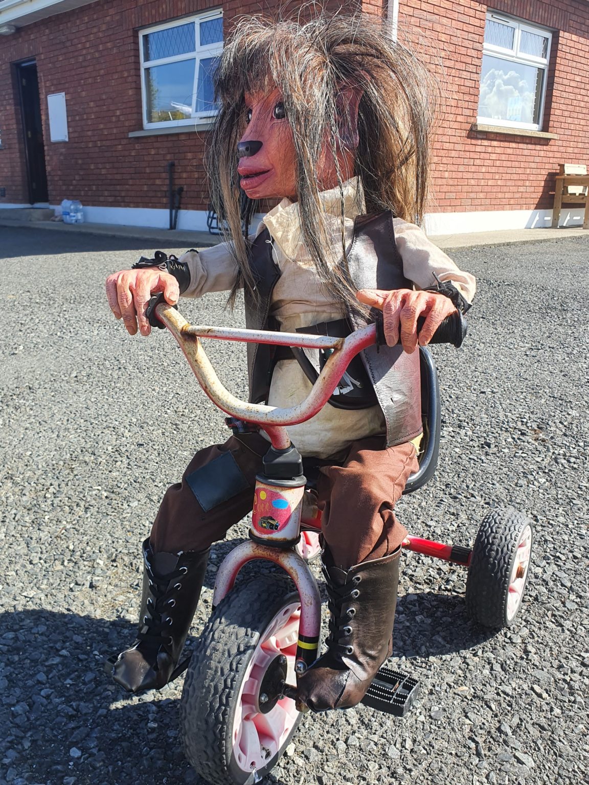 When making the hands I used the same materials and processes as I did with the head, with just one more added step. Just before I closed the plaster mould and poured in the latex I made an armature of the hands from twisted animation wire and suspended it in the middle of the mould using thread. I then poured in the latex, let it thicken and then pour out the excess and let it dry and before it was fully set pour in the soft expanding foam. Doing the extra step meant that when the hands were fully set and removed from the moulds the hands would be able to be manipulated and they would be able to hold their pose. This was an added extra aspect that I knew wanted my puppet to have. When making a puppet for an on-screen or on-stage performance it is important for the puppet to be able to do as much as possible, and for this puppet to be able to grip and hold objects. As you can see in this picture because of adding this extra step of adding the armature inside the hands it is possible for my puppet to sit on a tricycle and grip onto the handle bars.