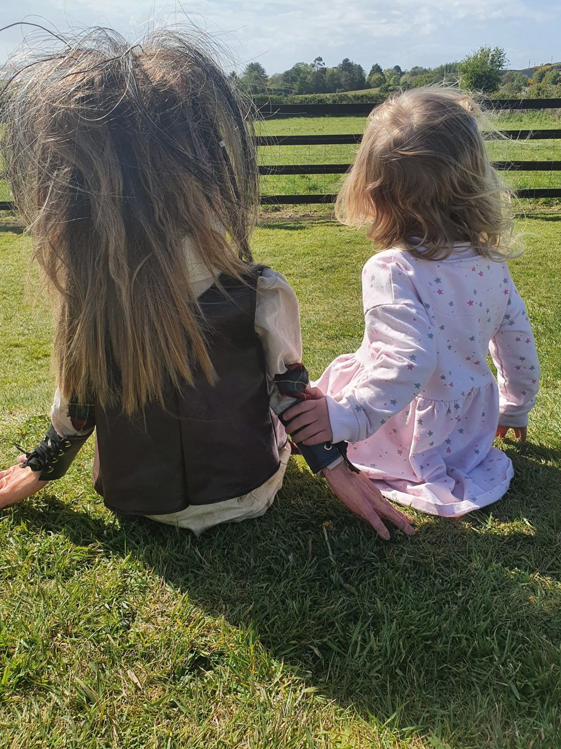 In this picture you can see the scale of the puppet beside the child, and see that the distance from the hips to the shoulders is pretty much the same on each and the puppet is just that couple of inches taller due to the larger head.