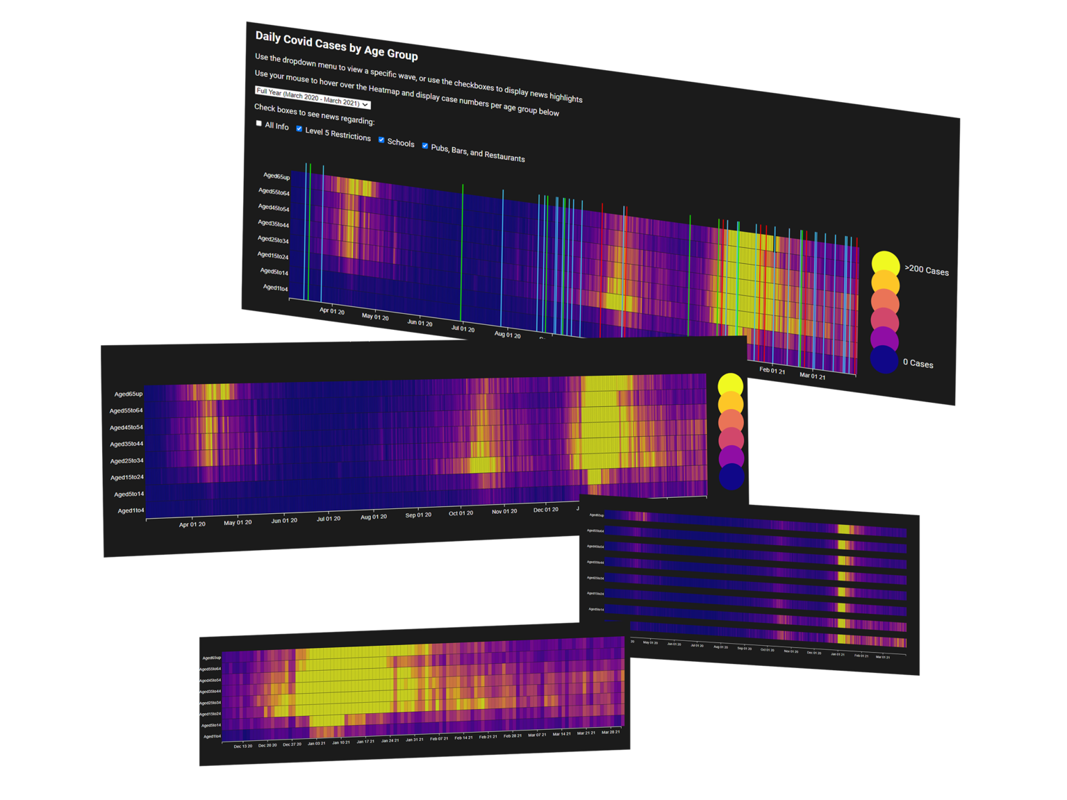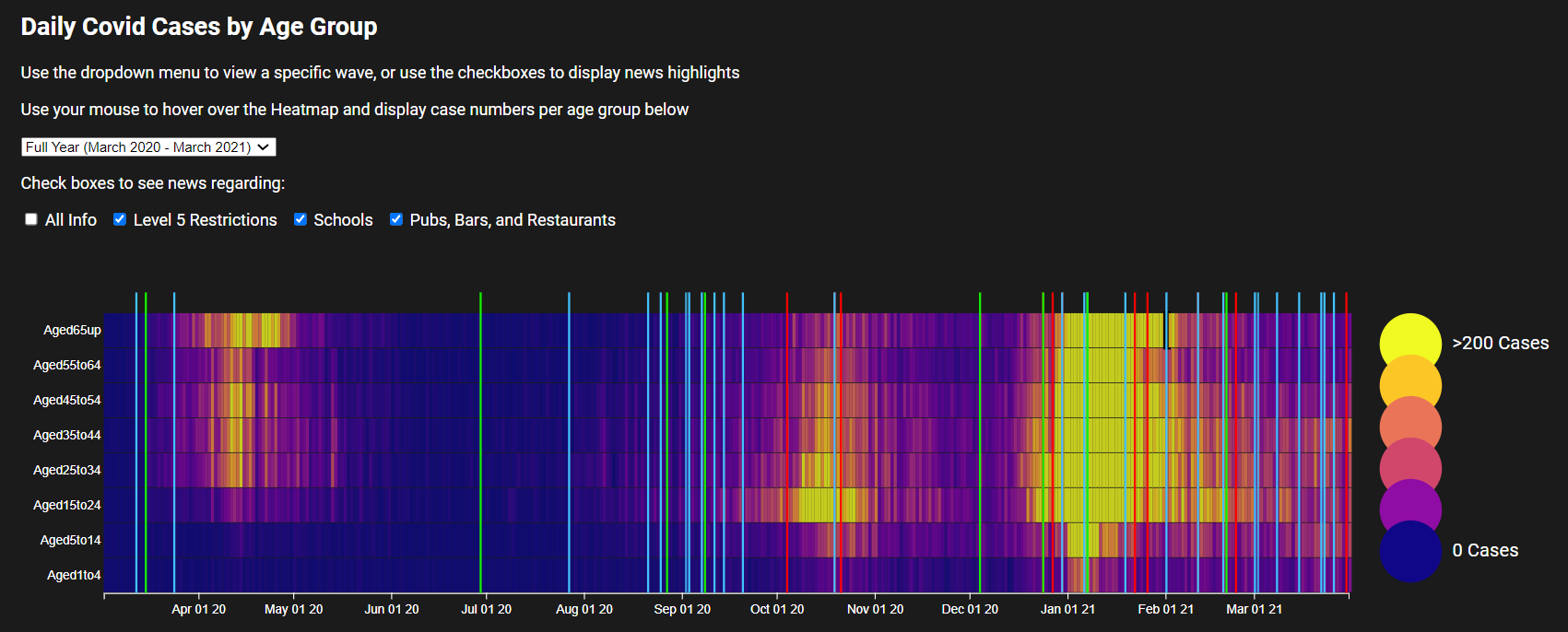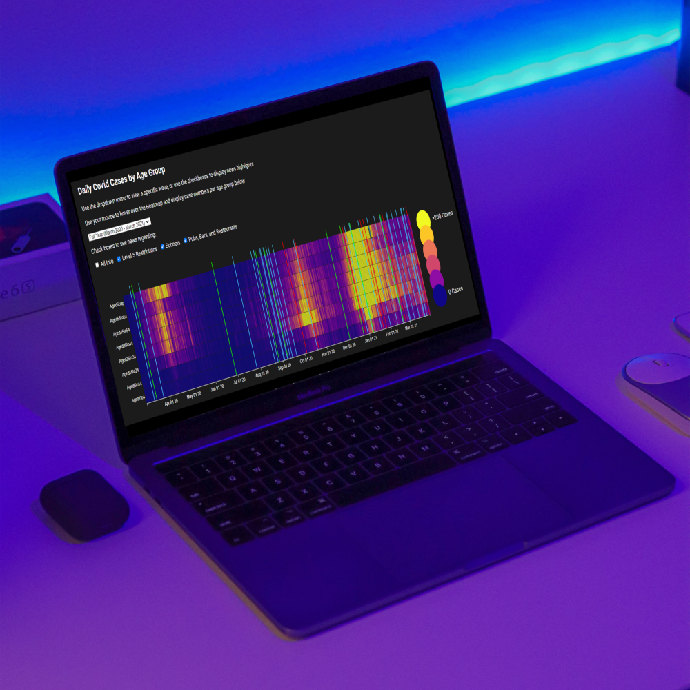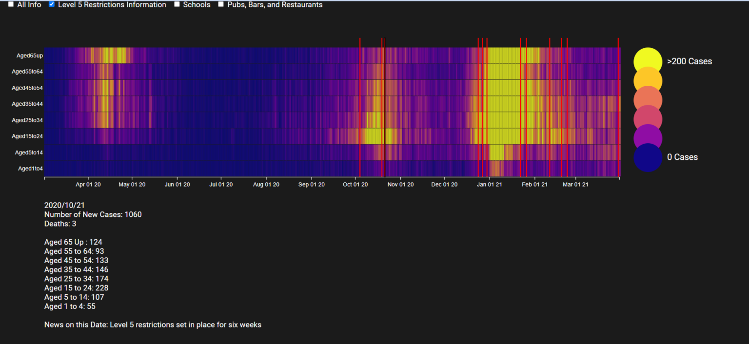 This project is an interactive visualisation of the Irish Covid-19 case numbers from March 2020 to March 2021. It allows users to look back on the year and see how the pandemic affected the population of Ireland. An application such as this could prove beneficial in the analysis of public health data, as well as aid in educating the public with reliable information.