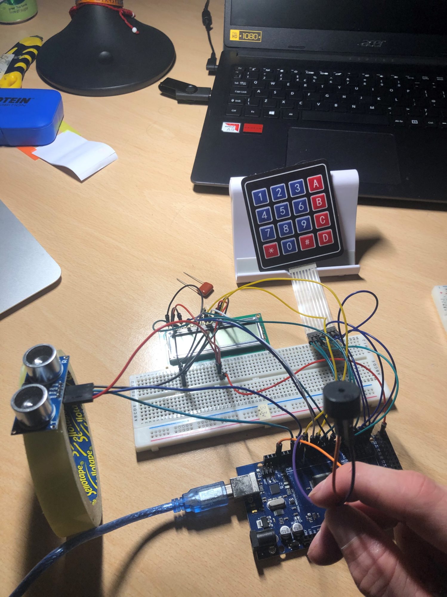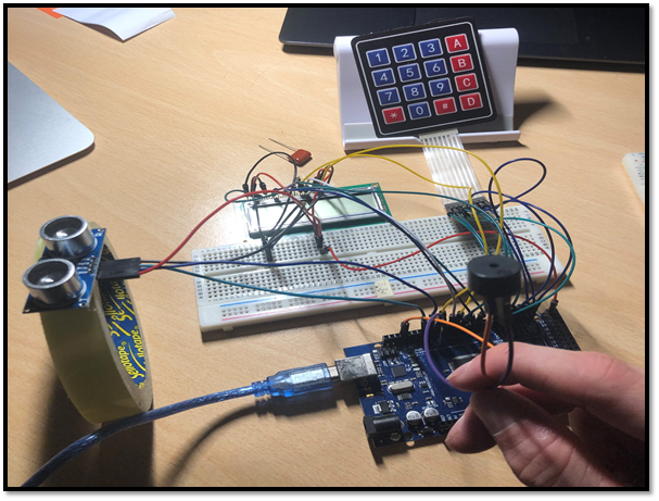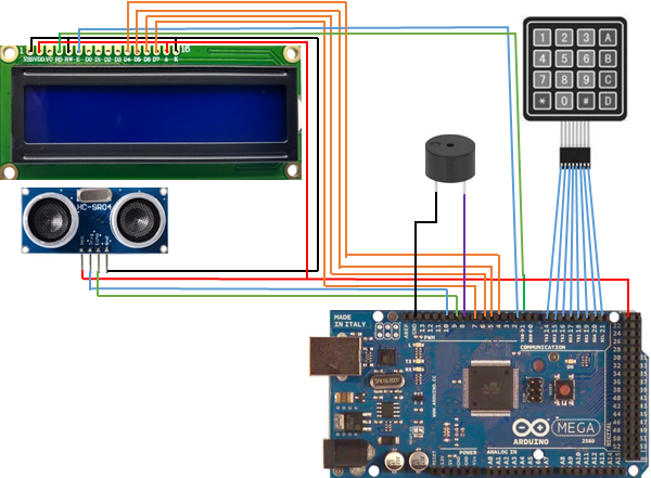 This alarm system uses an ultrasonic sensor with a range of eleven metres to detect if a person has entered a room. To activate the alarm a button will be pressed and a countdown from 10 seconds is initiated. If the sensor detects something the Arduino Mega is programmed to get the buzzer to emit a sound of 2Khz. To stop the alarm, you enter a 4-digit password.
