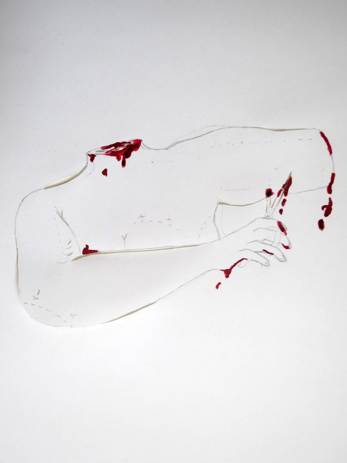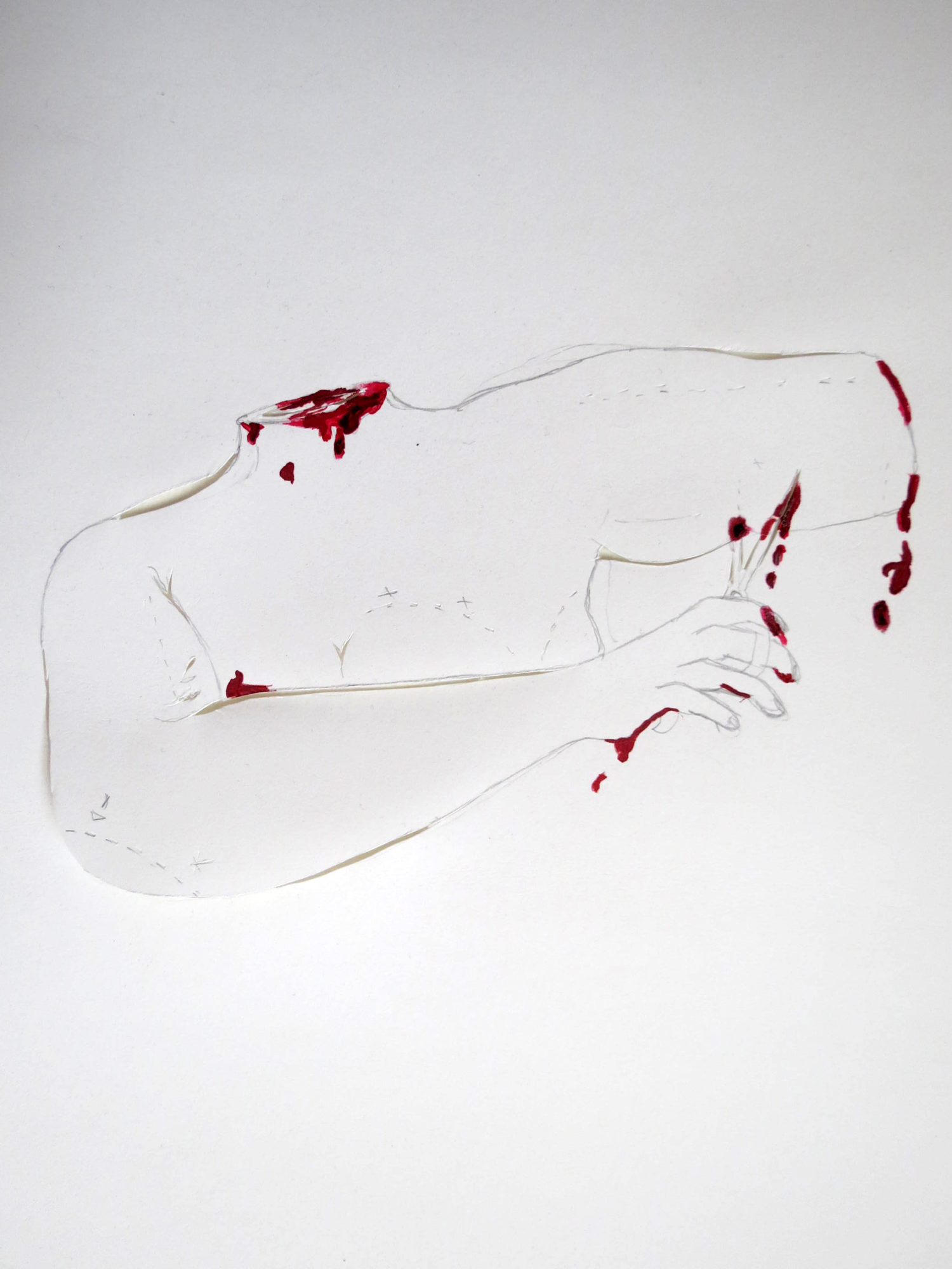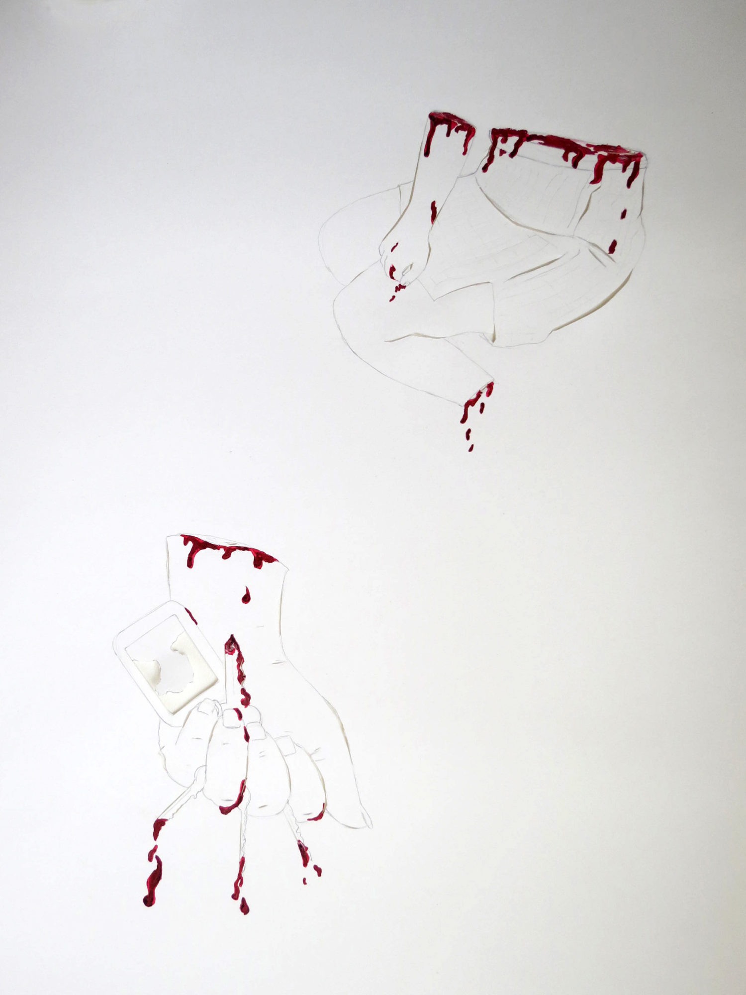 My project analyses the experience of being a woman in contemporary society. I have grappled with uncomfortable body feelings and how plus size women are portrayed throughout all forms of media today. The insecurities that are produced by current beauty standards, or by the menstrual cycle, should not hinder how women express their emotions. I draw upon my own experiences to make works that incorporate elements of drawing, painting and paper-cutting. My work illustrates the reality of going through a menstrual cycle and focuses on true feelings, in contrast to the representations found in advertising. Periods are painful, uncomfortable and among the most natural thing in the world. The purpose of this project is to open a more realistic conversation about women’s life experiences, which are nothing to be secretive about and should not require confusing metaphors.