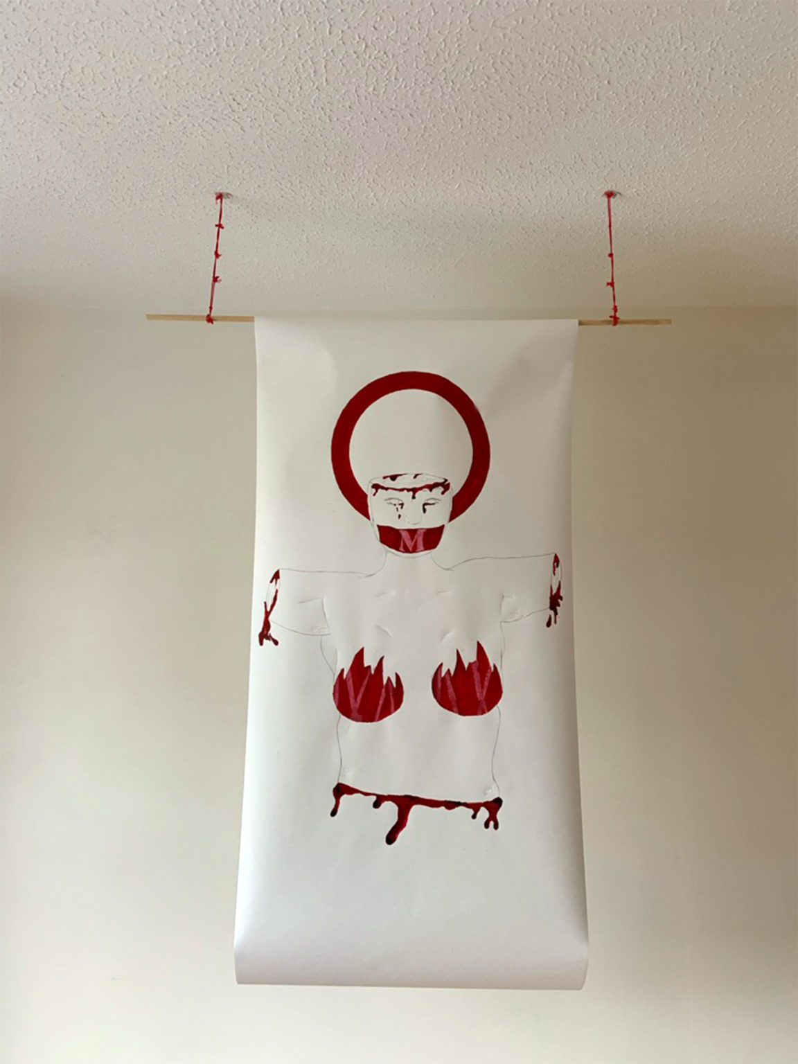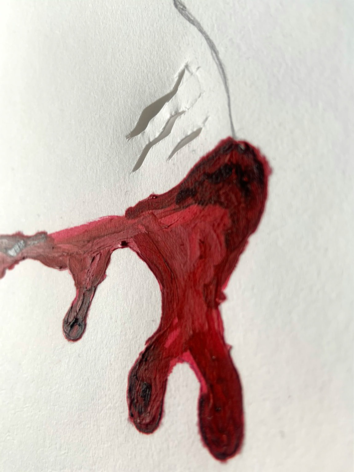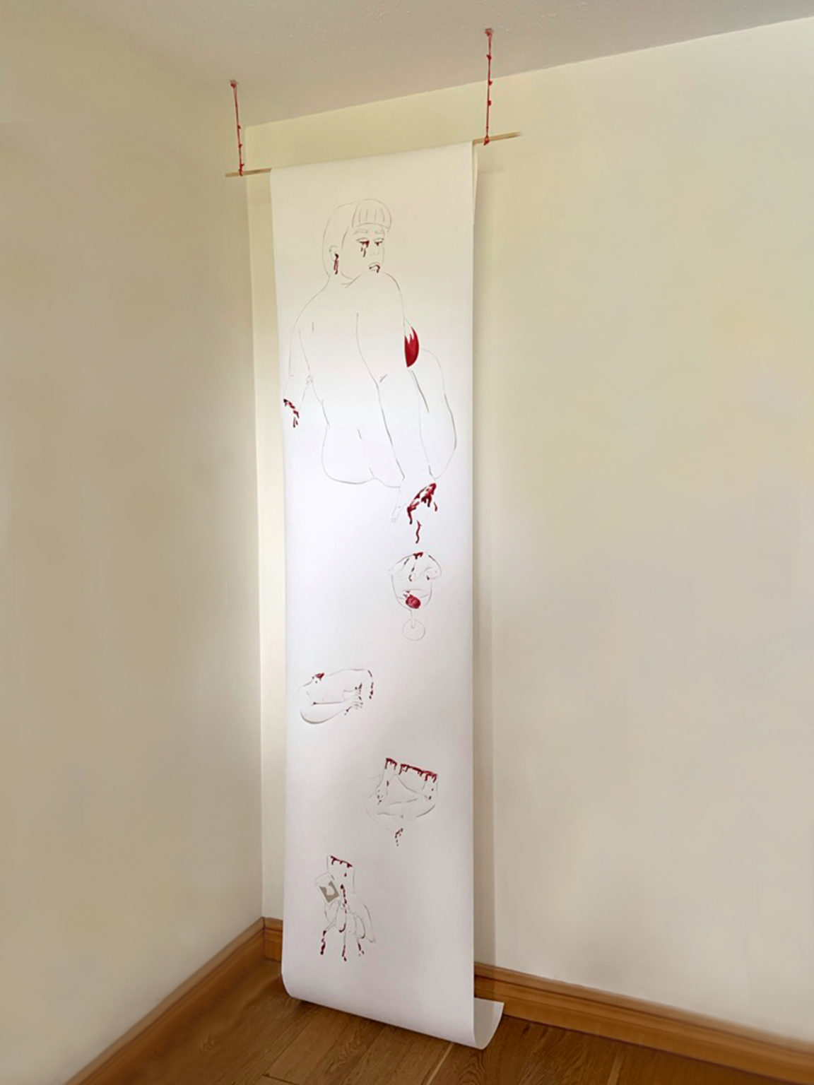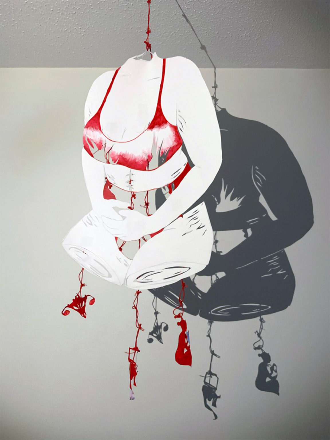 My project analyses the experience of being a woman in contemporary society. I have grappled with uncomfortable body feelings and how plus size women are portrayed throughout all forms of media today. The insecurities that are produced by current beauty standards, or by the menstrual cycle, should not hinder how women express their emotions. I draw upon my own experiences to make works that incorporate elements of drawing, painting and paper-cutting. My work illustrates the reality of going through a menstrual cycle and focuses on true feelings, in contrast to the representations found in advertising. Periods are painful, uncomfortable and among the most natural thing in the world. The purpose of this project is to open a more realistic conversation about women’s life experiences, which are nothing to be secretive about and should not require confusing metaphors.