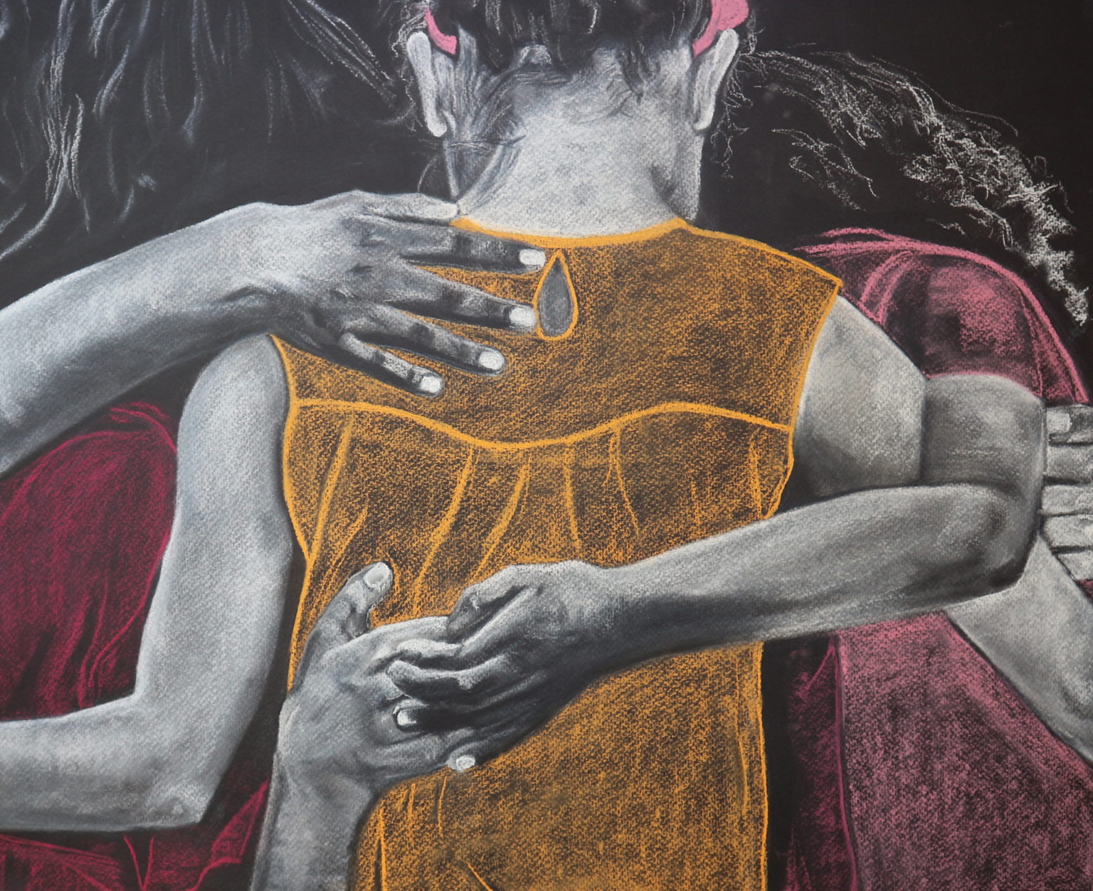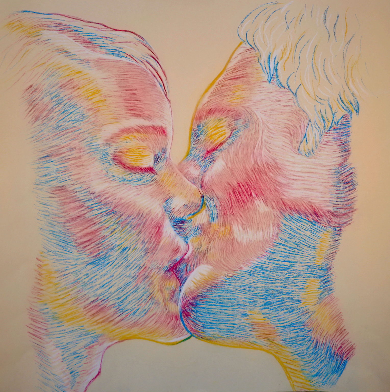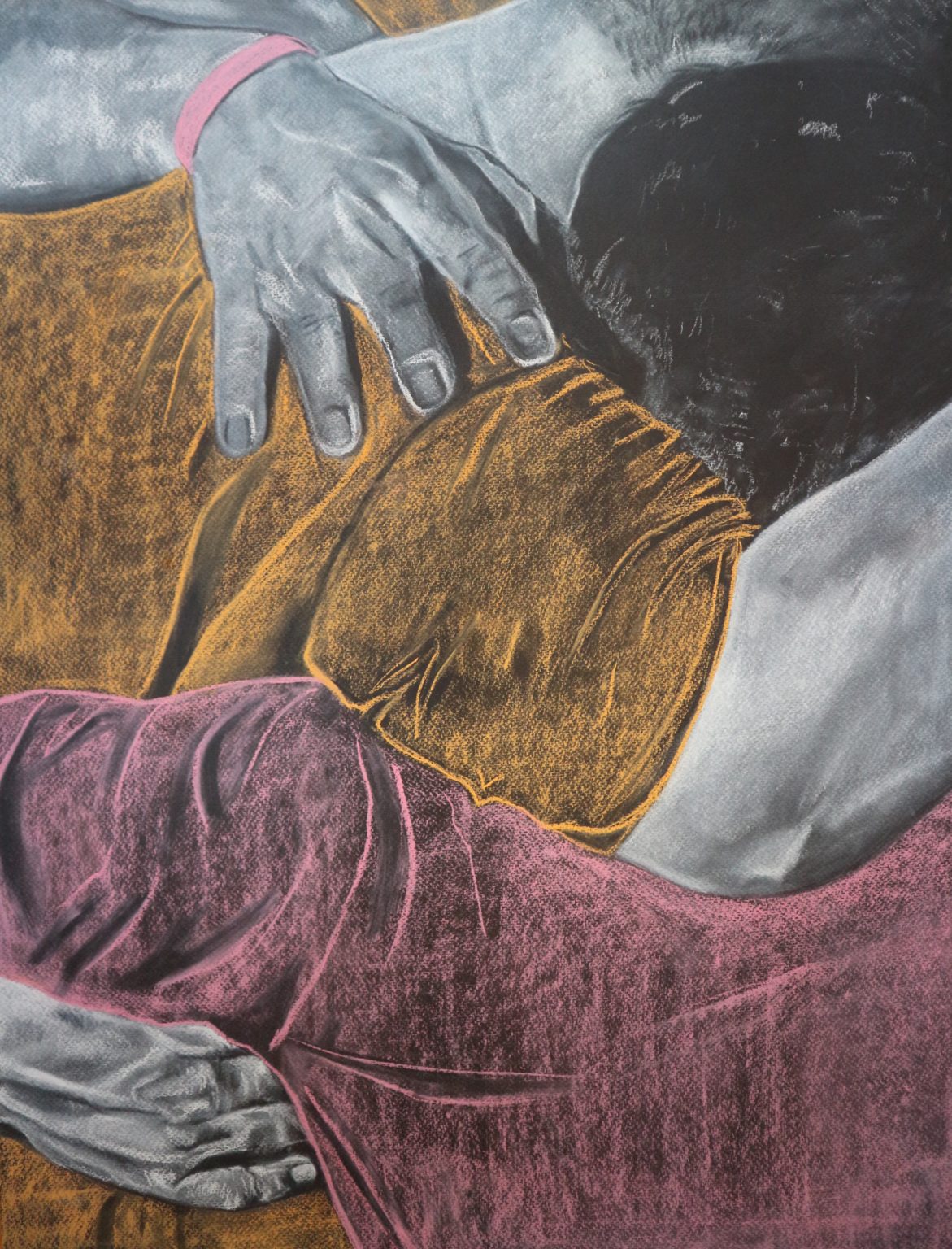 The identities of the persons drawn within these images are purposefully uncertain allowing the viewer to focus solely on the moments illustrated. The introduction of colour into these drawings is a remark on the warmth and brightness that these acts can bring to a person’s life.
