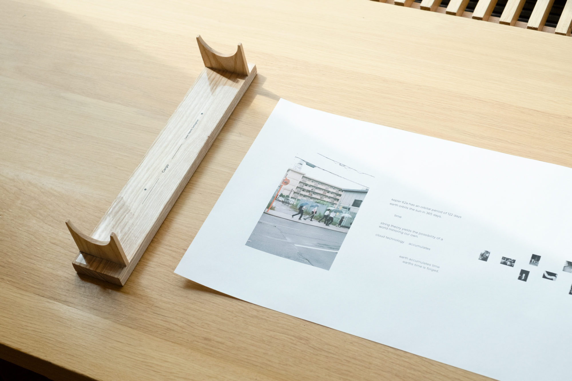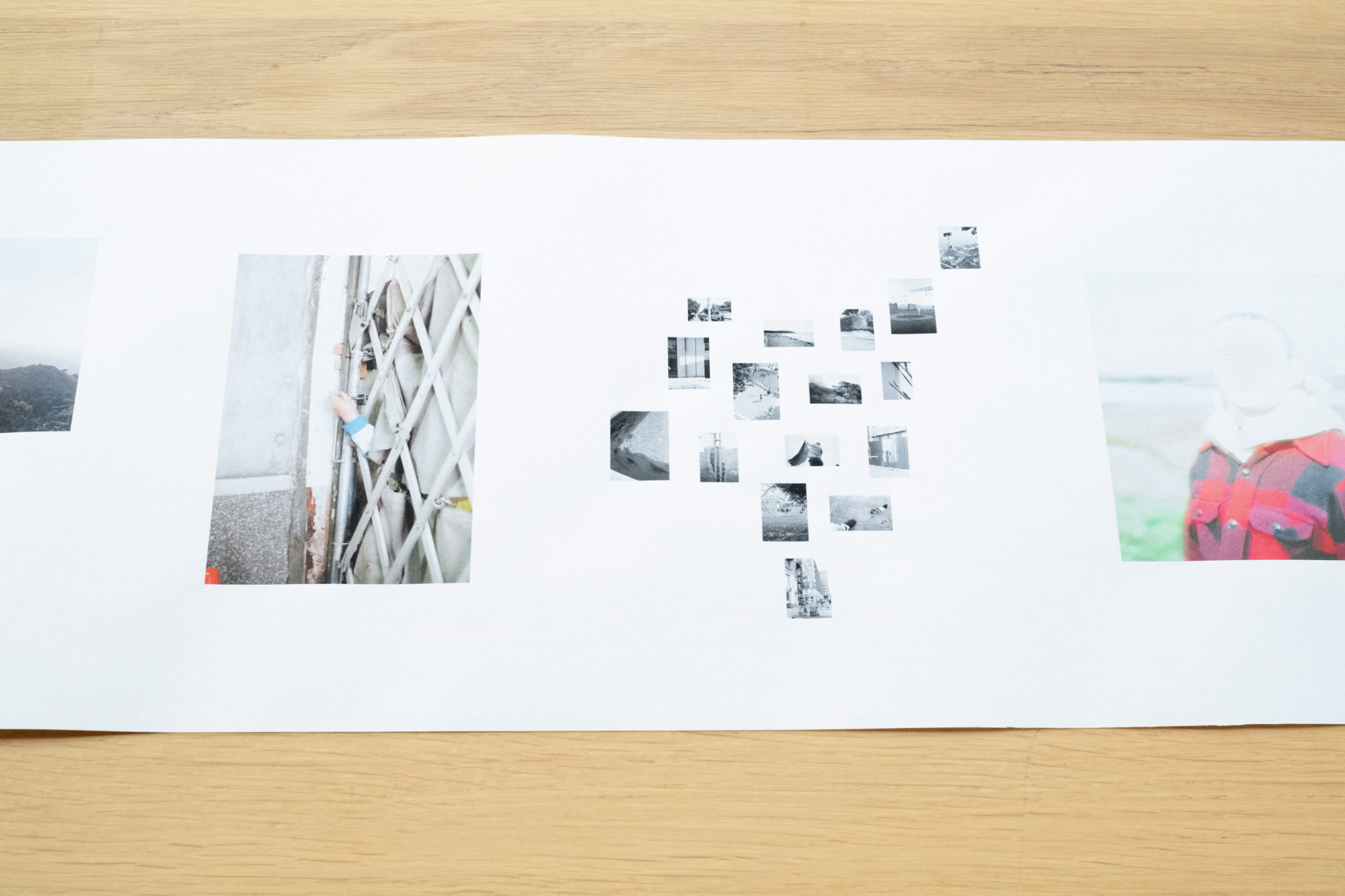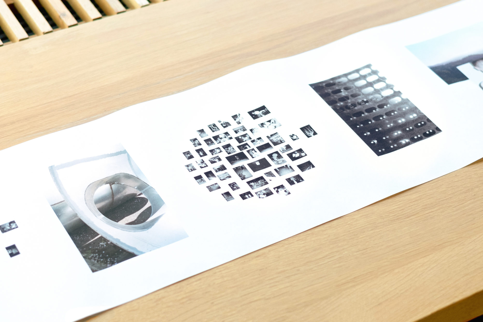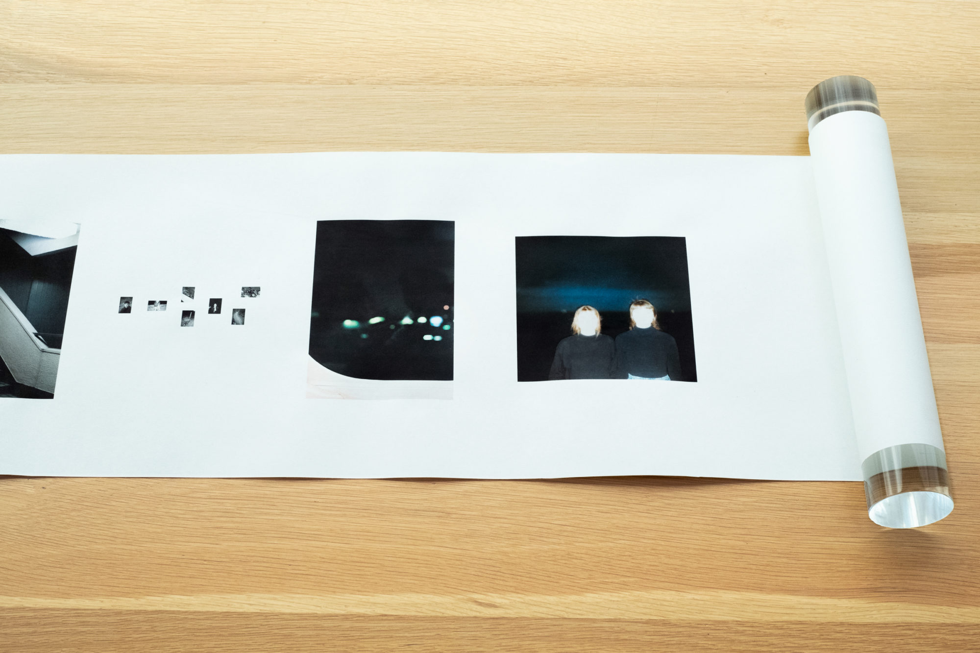 ‘Cargo’ acknowledges the compression of time in the virtual strati by utilising the scroll as a form to engage with the spread of time and visualise this erosion by means of layered imagery. It’s black and white photographs express themselves as reference to an outside world. Yet, they are inherently fragments of psychological data that present no apparent coherence beyond a reflection on real time and space as it unfolds in conjunction with the present form of the cloud.
