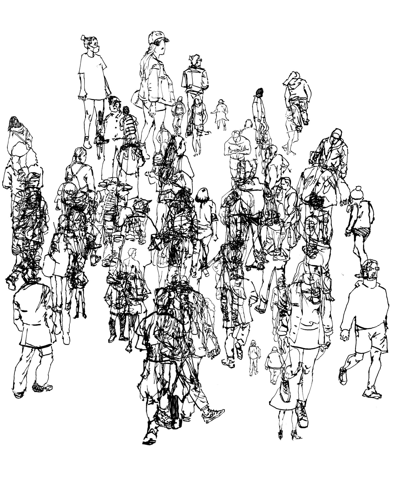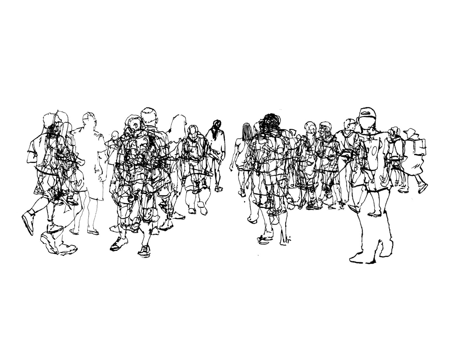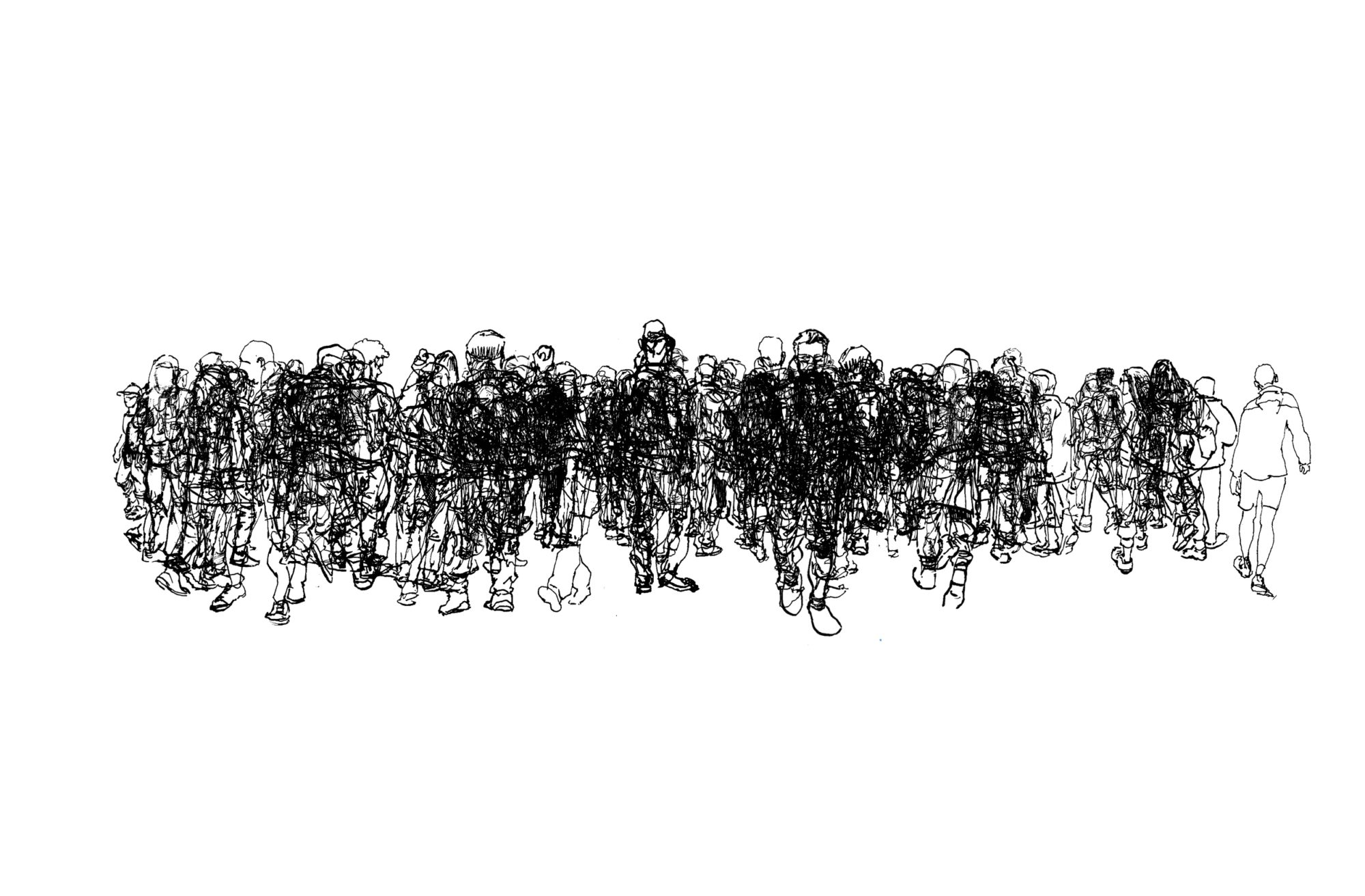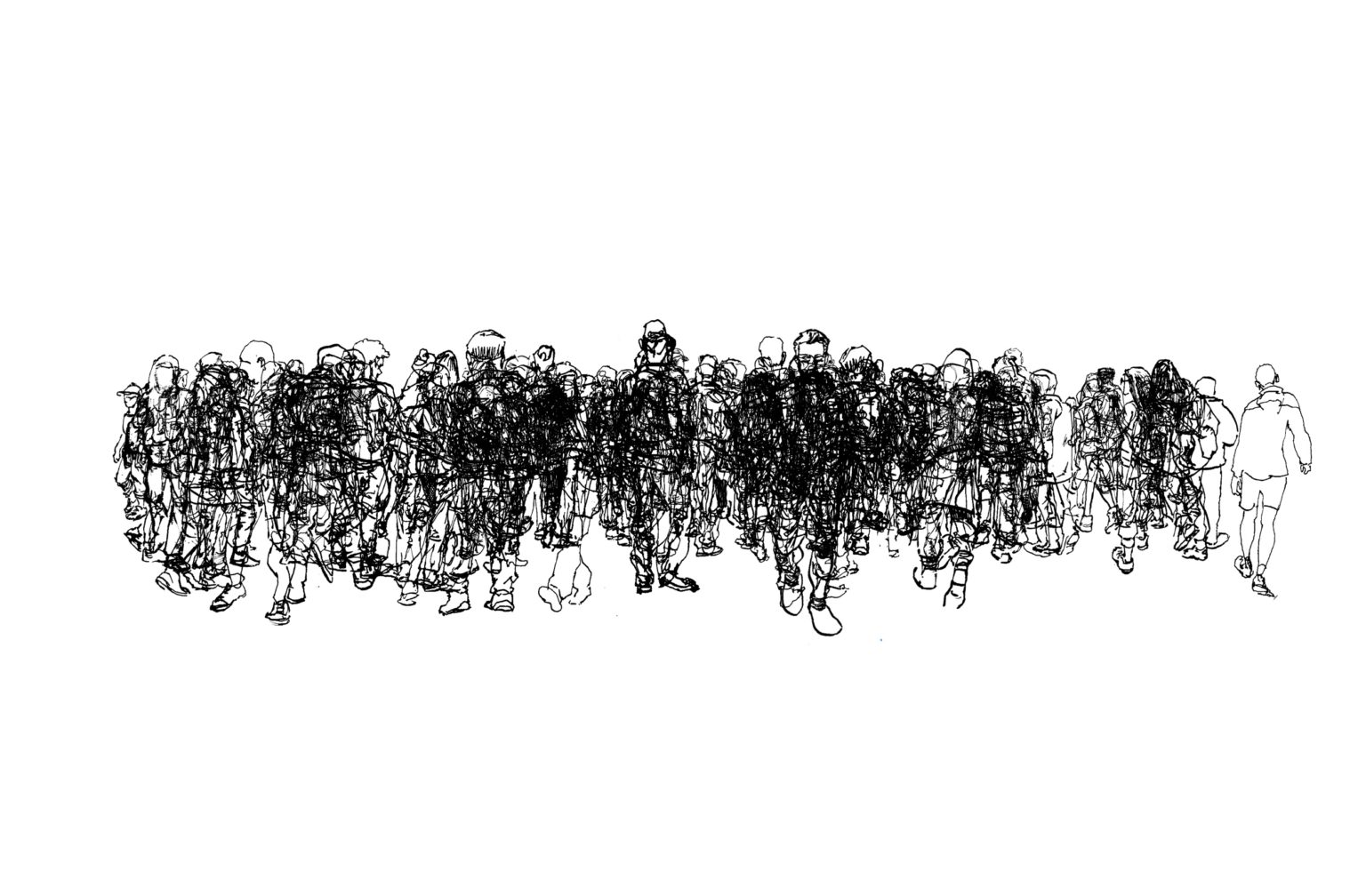 Matthew’s project centres on his investigation of visual narratives, observed from the way people occupy space. Due to his international upbringing in both Ireland and Portugal, he is fascinated by how geographical and emotional connections constitute an integral part of personal identity. These connections can help shape concepts of physical and mental space, and also memories of lived experiences. His work features line drawings of individuals, adapted from photographs and then simplified to the point of cartoon-like iconography. Through this mixture of varied groupings and spatial relationships, his work suggests the possibility of unspoken personal relationships between each figure. The figures are also presented individually in a video, flashing one after the other in a randomised order - suggesting a crowd that is simultaneously occupying the same realm, but are also wholly isolated. This can certainly can be read as a response to the current situation, when the boundaries of our very personal spaces act as a direct protection from potential threat.