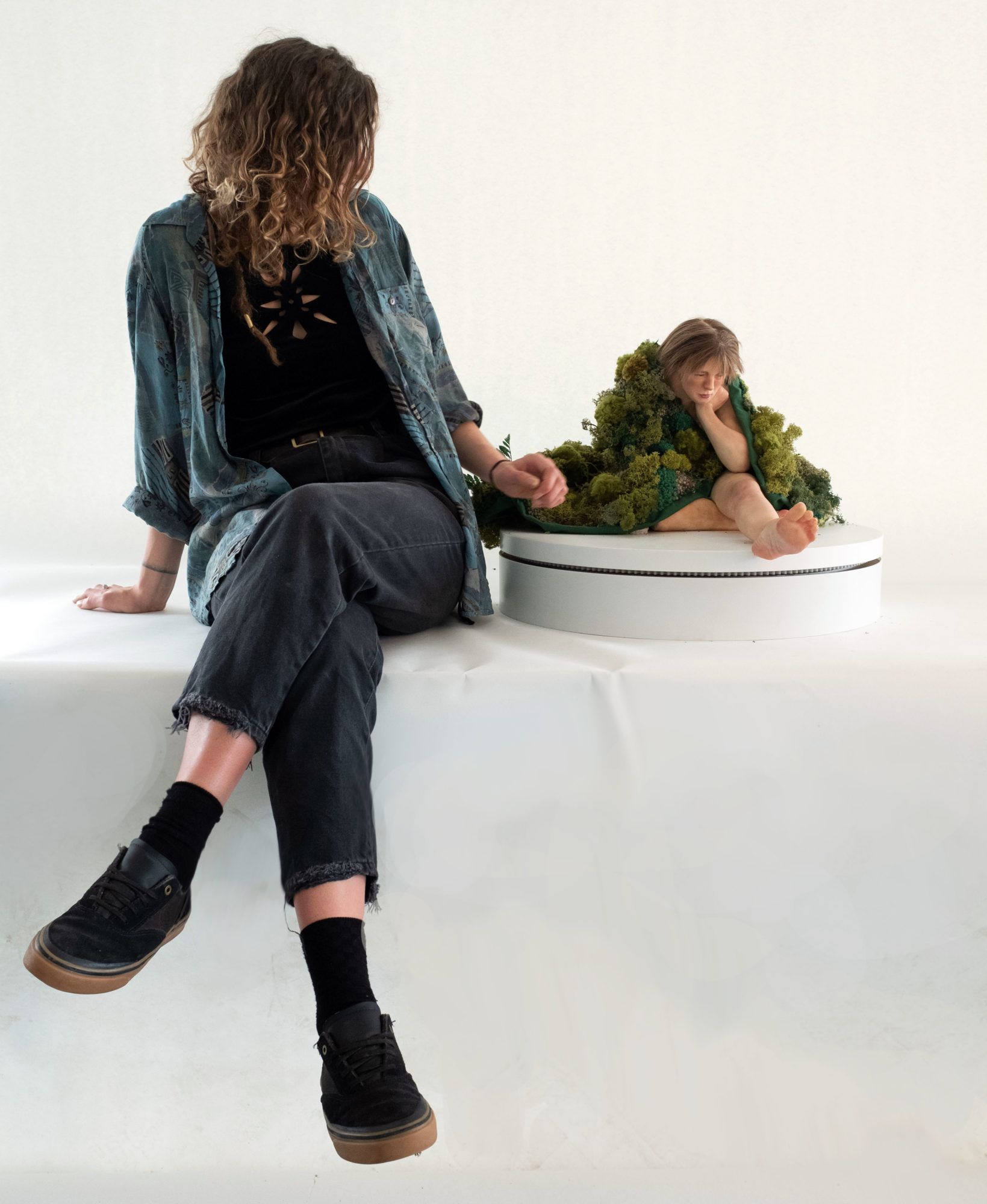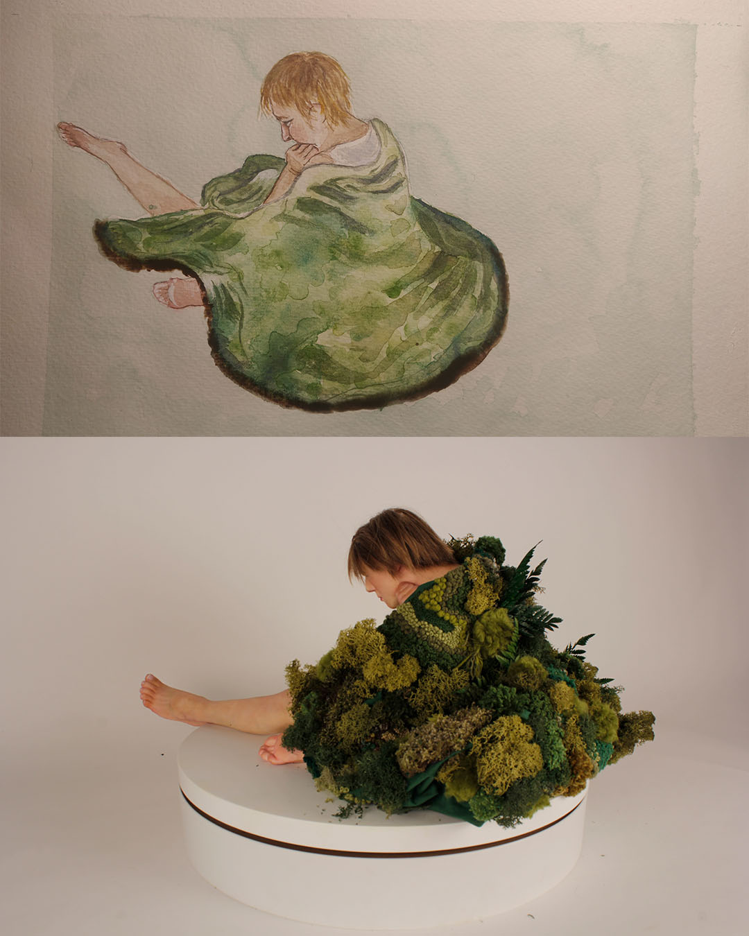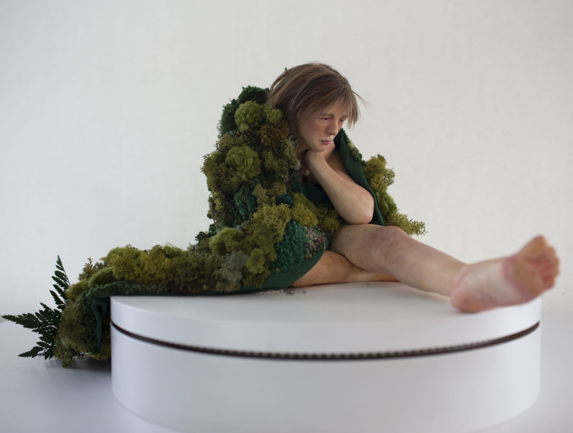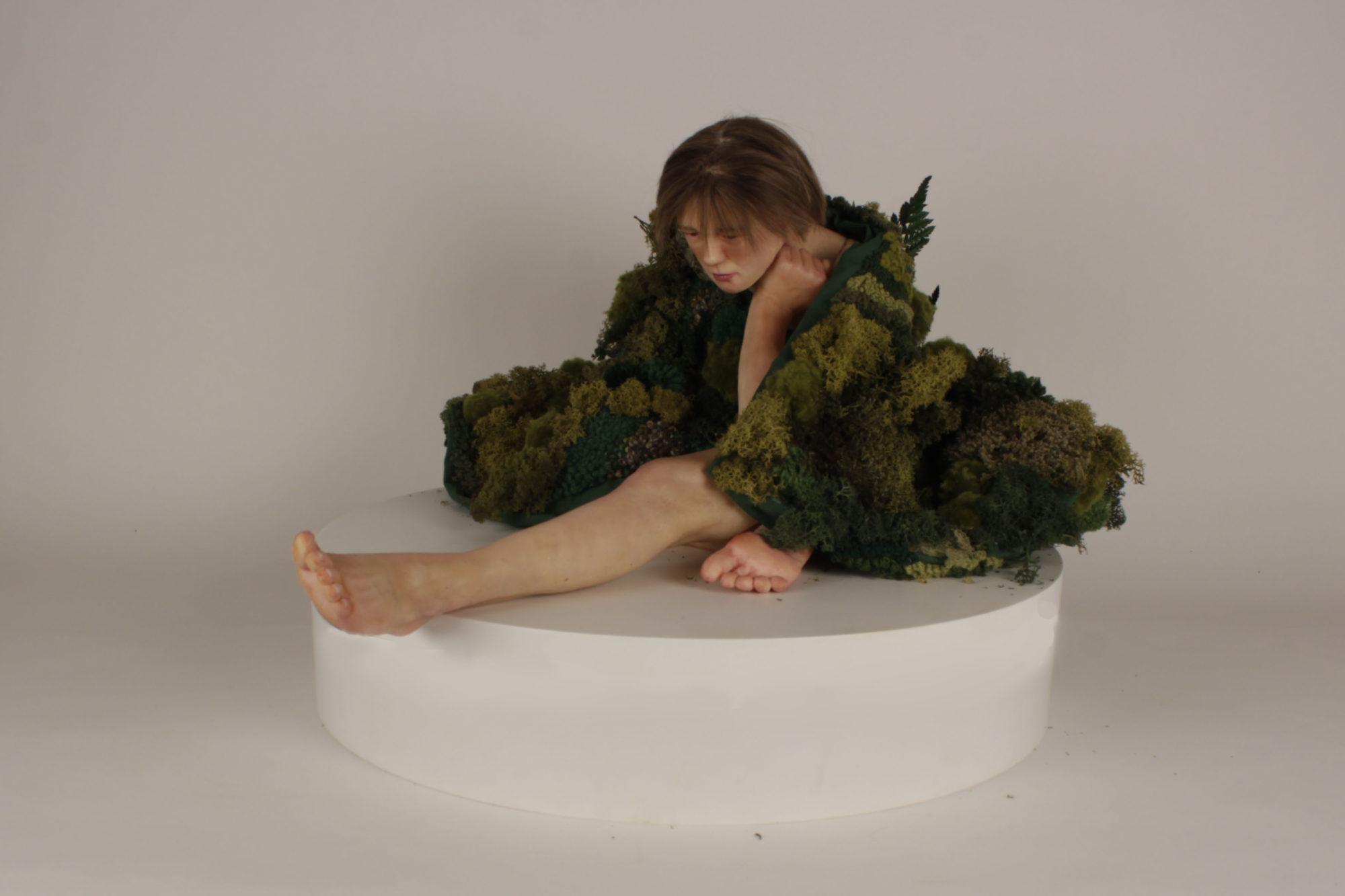 Inspired by the poem The Stolen Child by William B. Yeats and interpreted to create a sculptural scene. I envision this piece displayed as a museum presentation; To celebrate the work of William B. Yeats in the National Library of Ireland. I have made a hyper-realistic silicone sculpt of my sister Emer as the child character. This project is very close to my heart. The purpose of this piece is to engage the contemporary youth of Ireland with Irish poetry. The Stolen Child by William B. Yeats resonates with its young readers, the sculptural aspect adds visual understanding and interest to the poem. I envisioned to moss blanket as a gift from the faeries to the model. The reason I chose textile and embroidery was to add this dream-like quality.