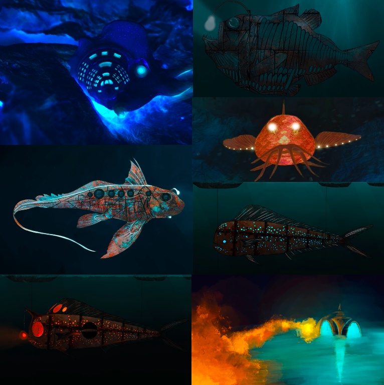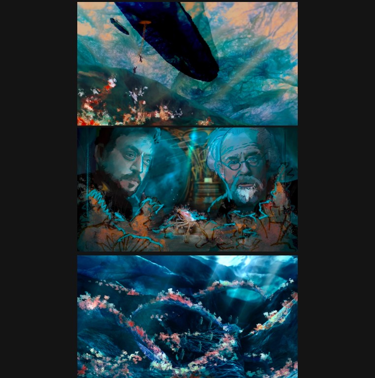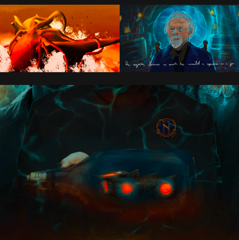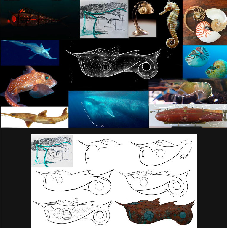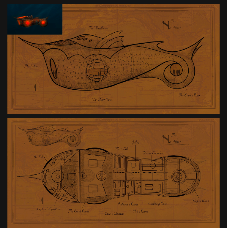 For my final year major project 2021, I took on Jules Vernes 20,000 Leagues Under the Sea, designing it for film. With influences from the shapes and forms found in ocean life and the Art Nouveau style, I redesigned Captain Nemo’s Nautilus. The project consisted of creating concept work and technical drawings.