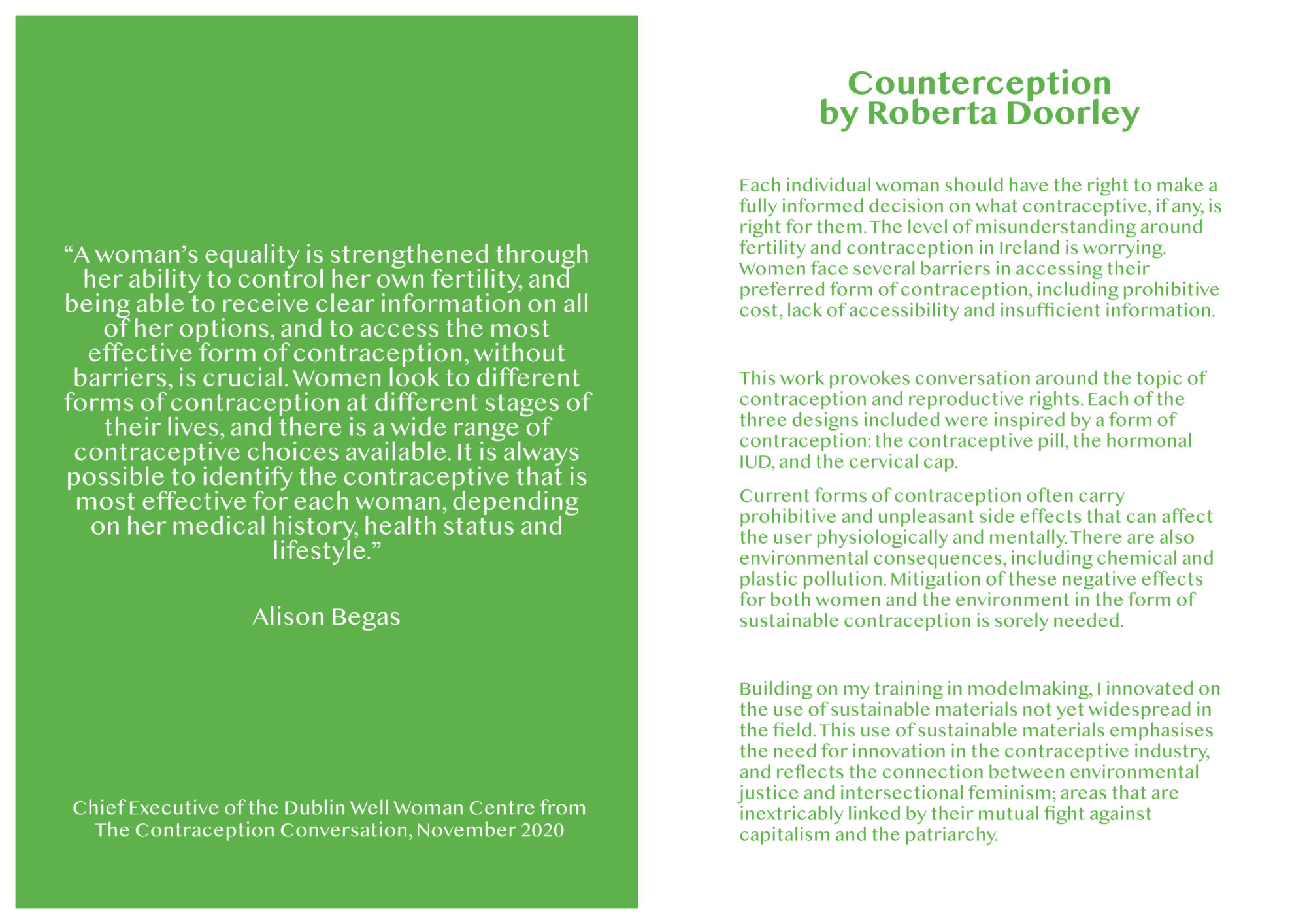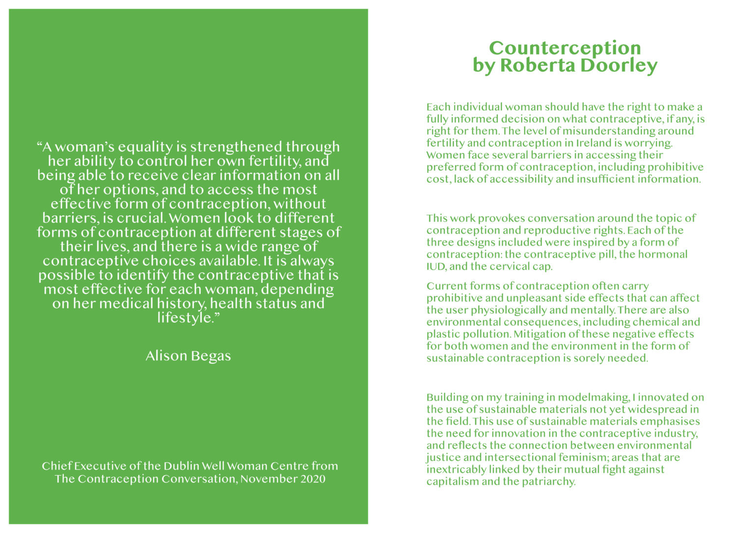 These models were initially intended to be displayed outdoors on shrubs and trees for the public to come across in a PR "stunt". This would bring awareness to research done by the Dublin Well Woman Centre, which found that women in Ireland are poorly informed as to their reproductive rights and options. Because of the pandemic the project developed and my final design is intended to be displayed in a published maker's book and/or photographic exhibition. It was important to me to use and innovate with sustainable materials and processes by building on the modelmaking skills I have learnt over the past 4 years.