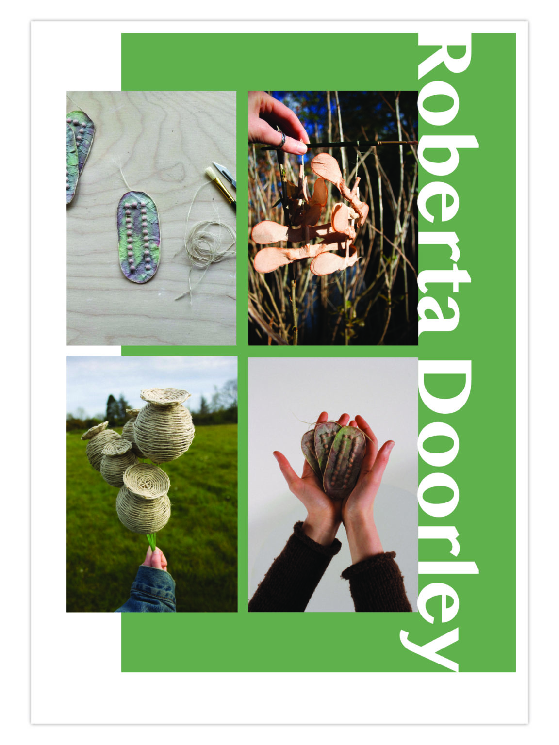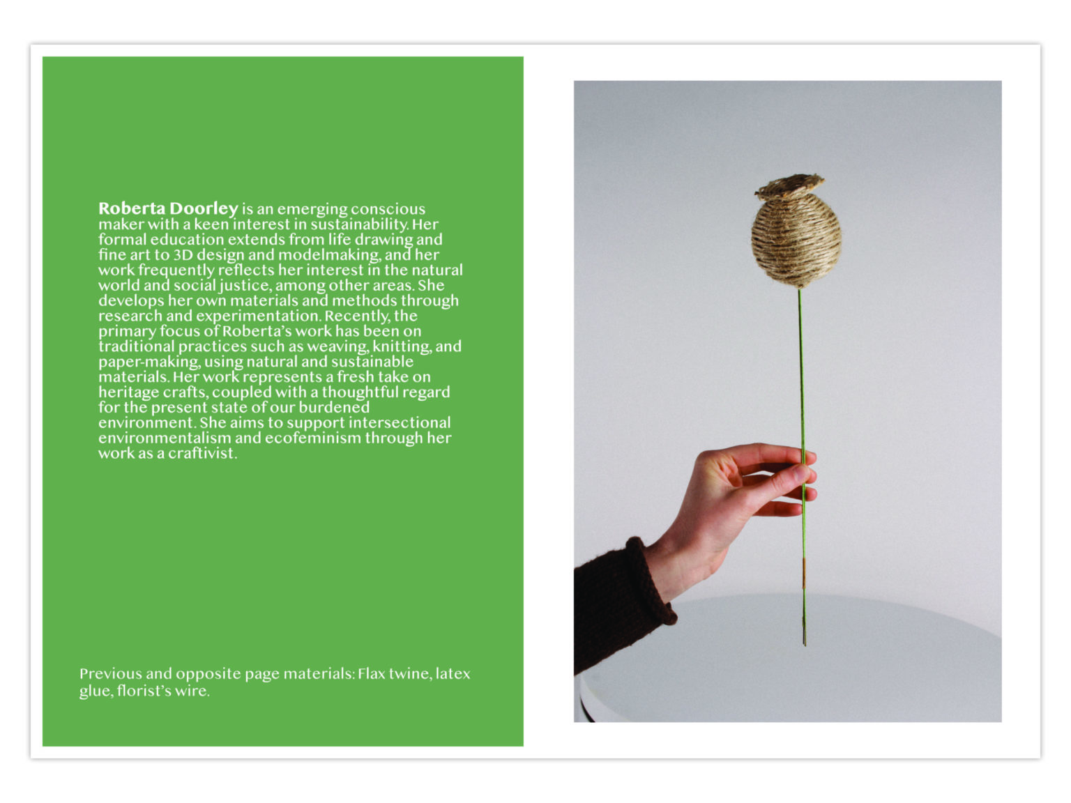 Roberta Doorley is an emerging conscious maker with a keen interest in sustainability. Her work frequently reflects her interest in the natural world and social justice, among other areas. She develops her own materials and methods through research and experimentation. Recently, the primary focus of Roberta’s work has been on traditional practices such as weaving, knitting, and paper-making, using natural and sustainable materials. Her work represents a fresh take on heritage crafts, coupled with a thoughtful regard for the present state of our burdened environment. She aims to support intersectional environmentalism and ecofeminism through her work as a craftivist.