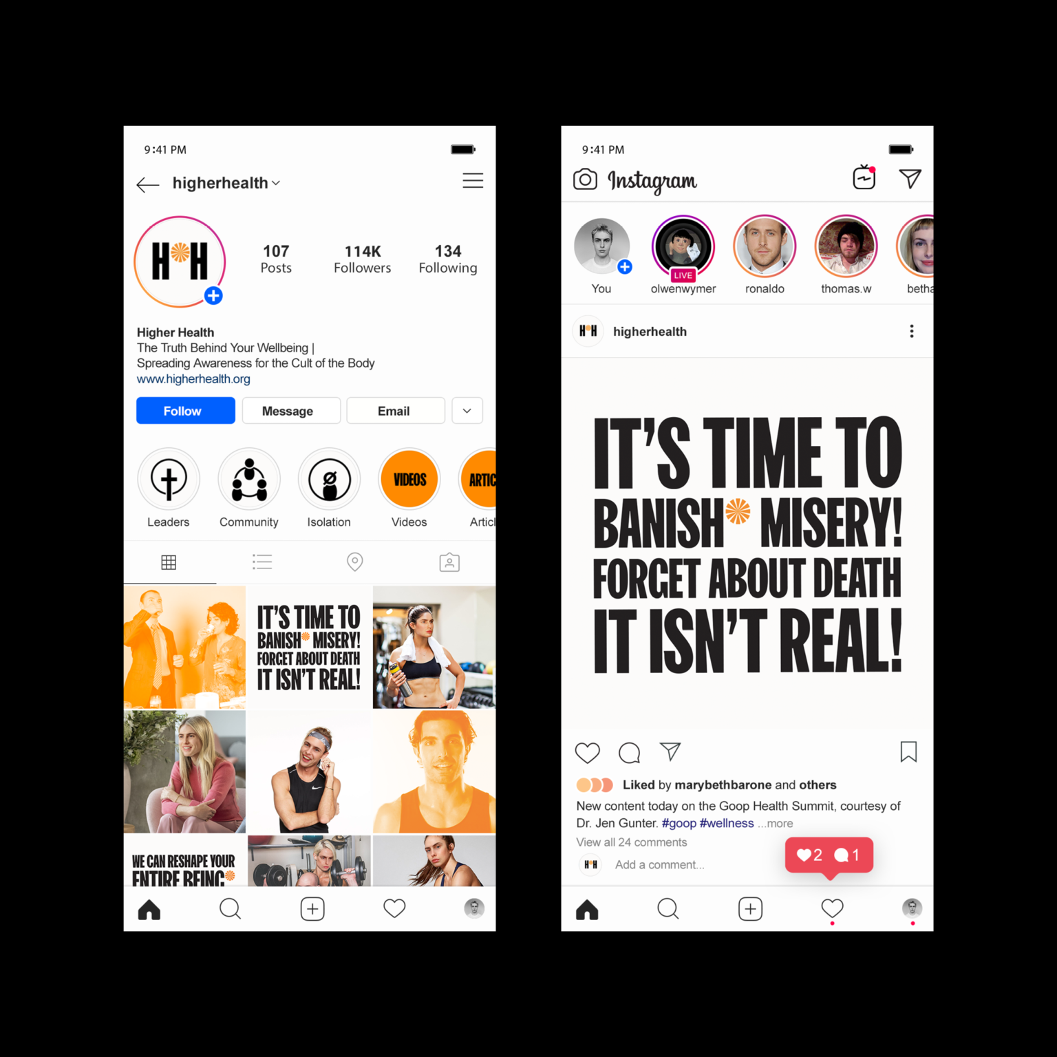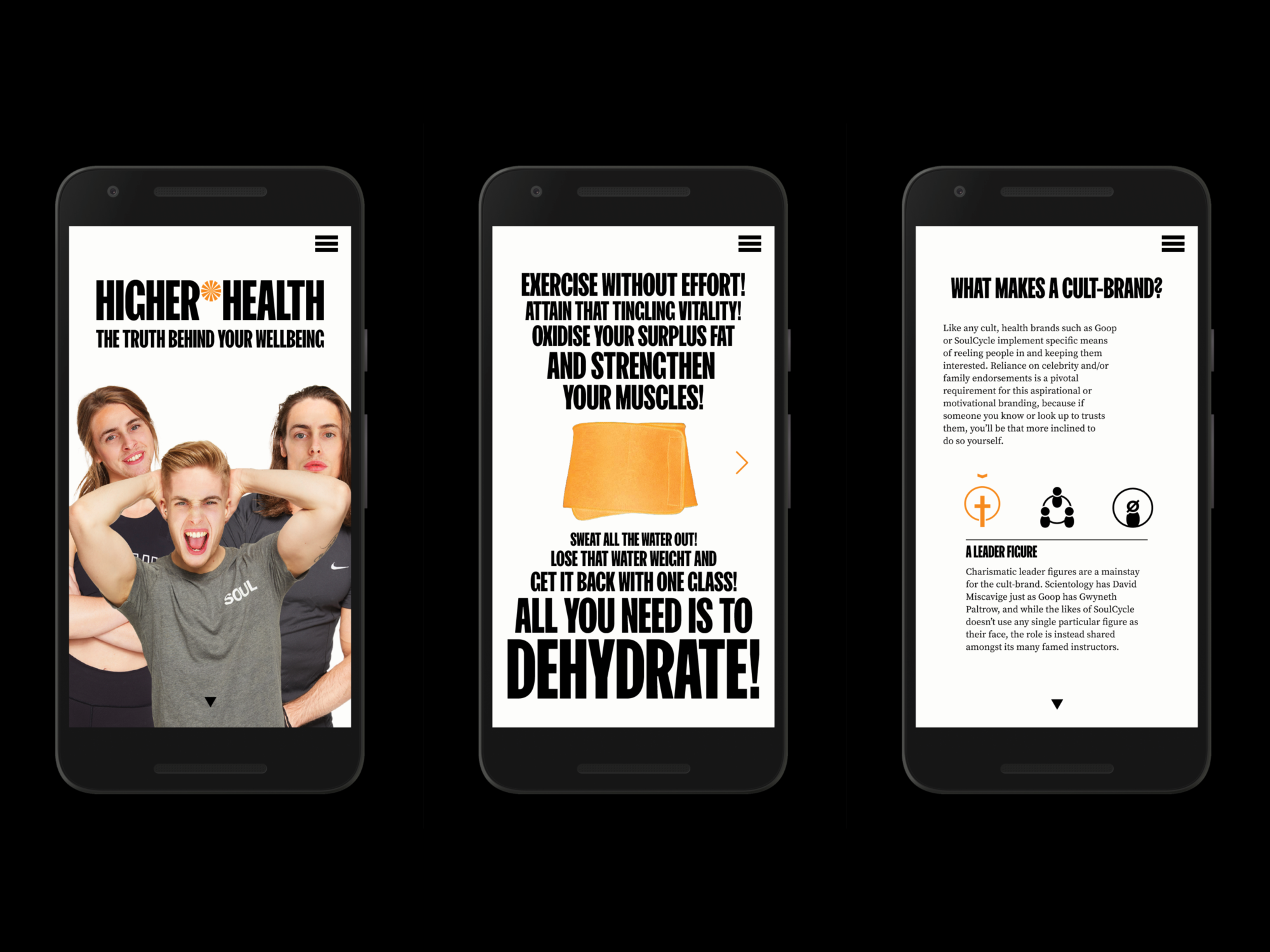 Higher Health is an awareness campaign that highlights how mainstream wellness and fitness brands use inclusivity and motivational language to perpetuate a cult-mentality in consumers.