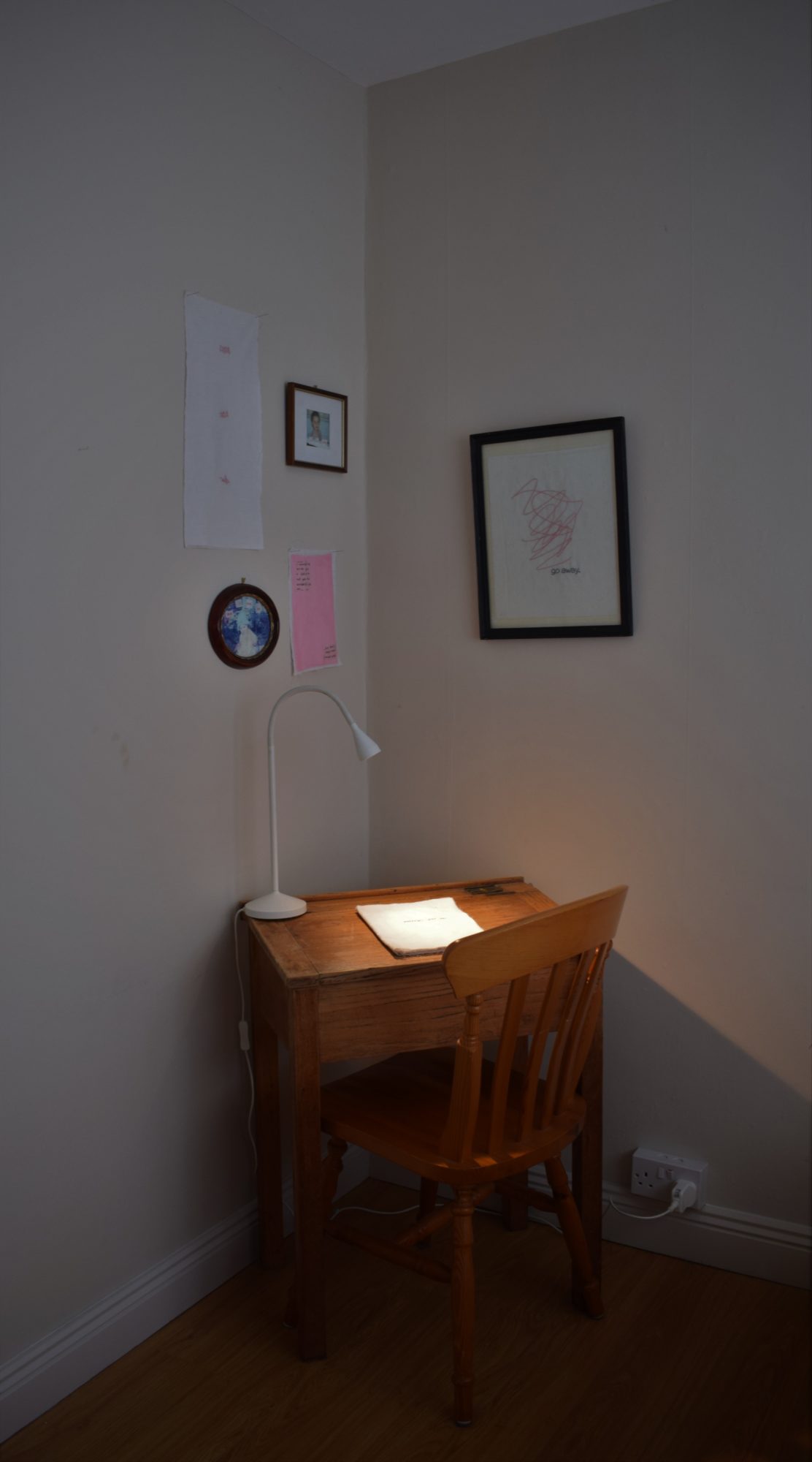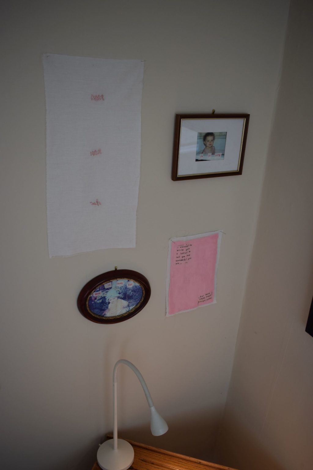 Words and images, wrapped up in our memories, become distorted over time. Each story and tradition handed down to the next generation is modified, changed minutely by the person they are passed onto. The meaning is never as clear as the moment a picture was captured, or a recipe was written down. As someone who grew up with an unconventional experience with language, I am intrigued by the visual viability of text and the written word. Within this project I have been investigating theories associated with psychotherapy, specifically the Internal Family Systems model, and researching how our internal emotional reality can impact how we interact perceptually with space and objects. By combining different materials with images and words, my work attempts to shine a light on the limits and capabilities of language, in order to explore the relationship between memory, internal reality and perception.
