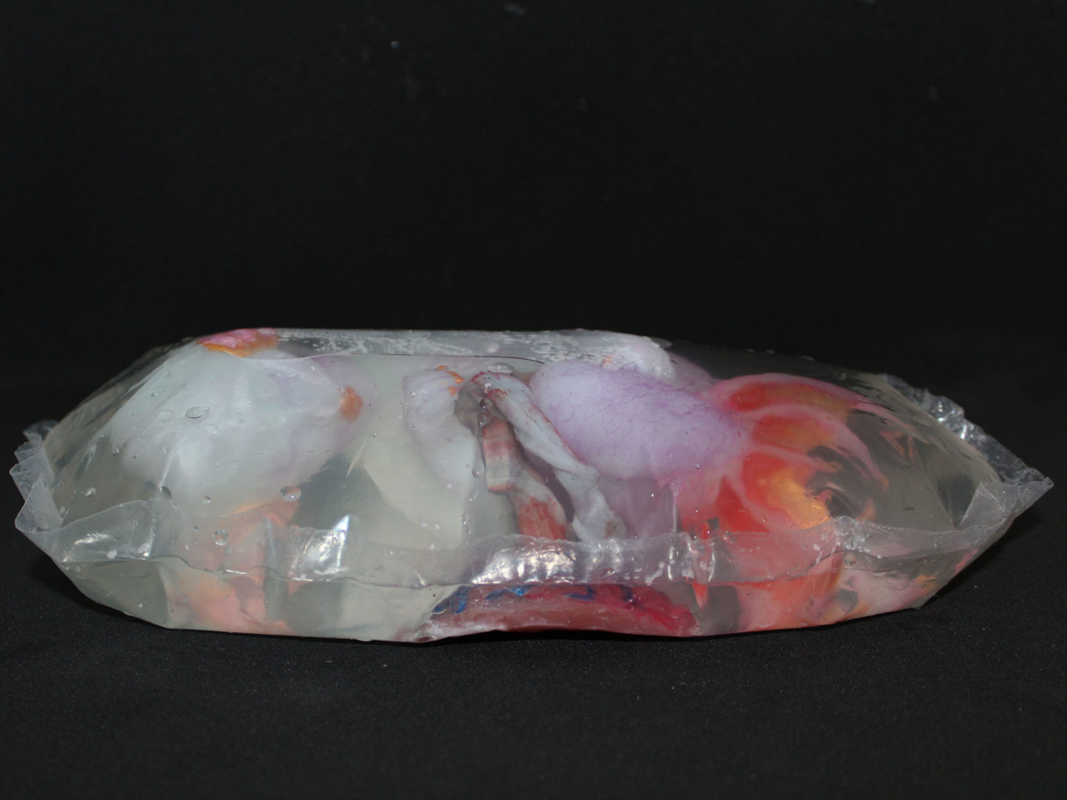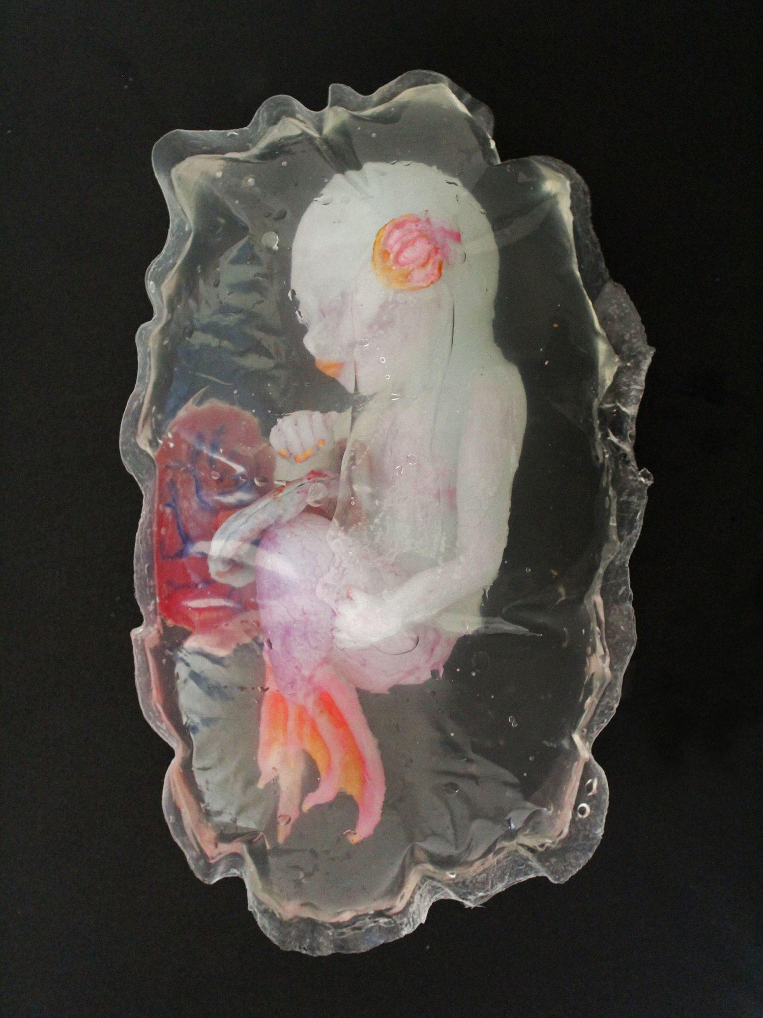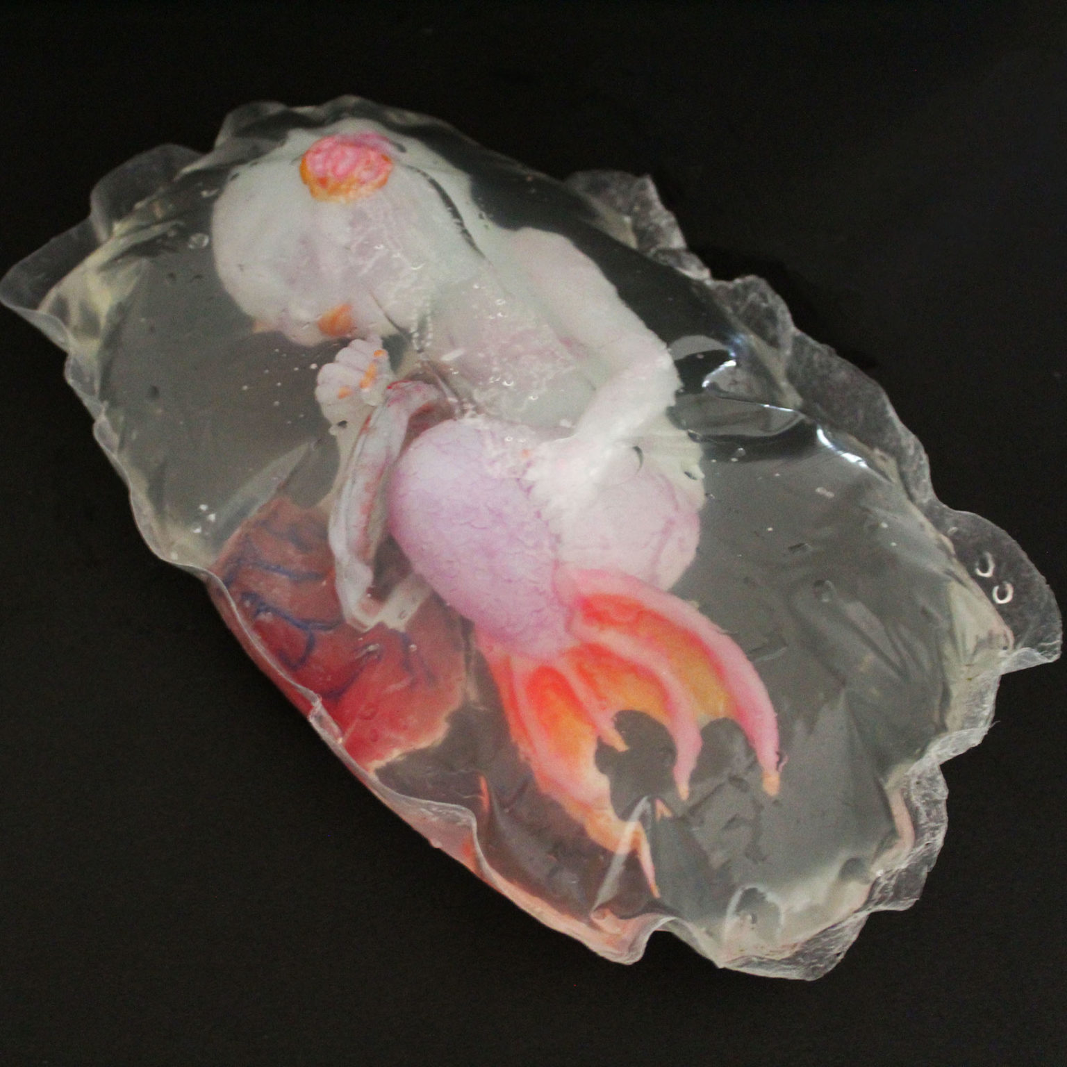 This project consists of a mermaid fetus, umbilical cord and placenta cast in solid silicone from plaster molds. It is suspended in diluted natrosol to simulate amniotic fluid within a plastic amniotic sac. Most of the project time was spent on sculpting, with the sac being the most challenging aspect. I referenced the proportions of a human fetus at 20 weeks gestation, but with a developmental age of 28 weeks to replicate ex utero development in nature. I chose physical traits for the fetus based on my idea of what the parents might look like. This was influenced by a story I created about them and the circumstances in which the conception of their fetus had to be hidden.