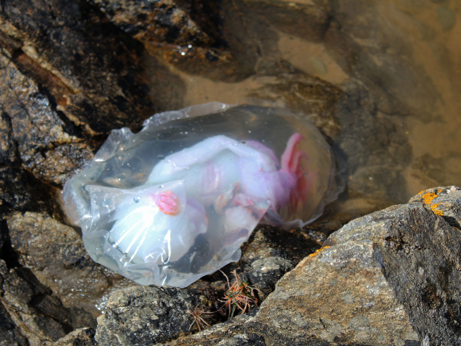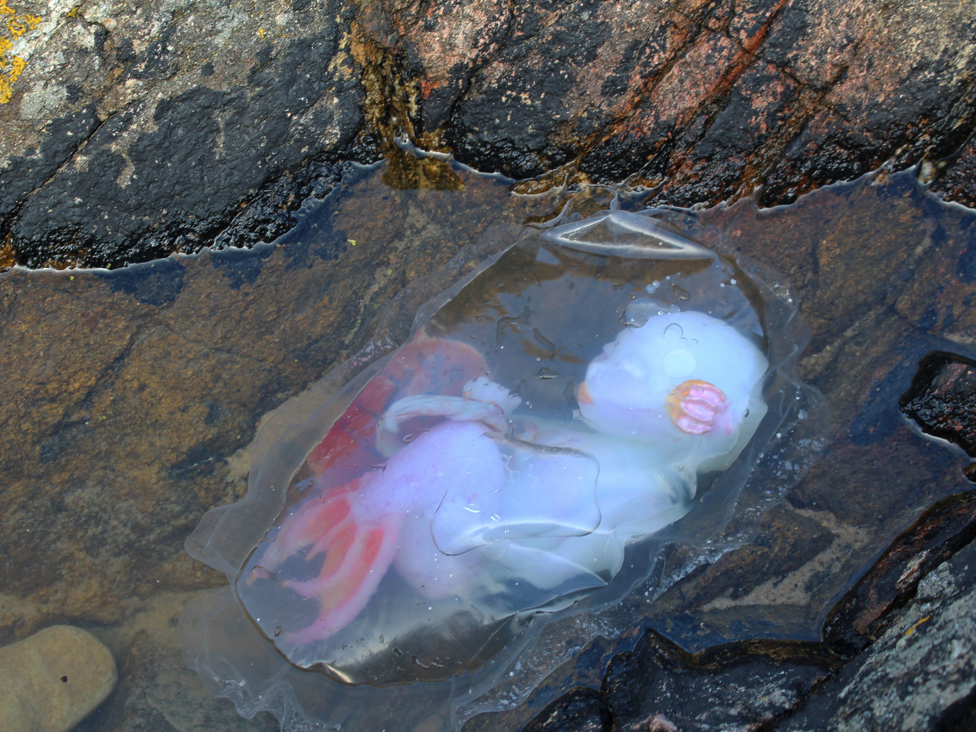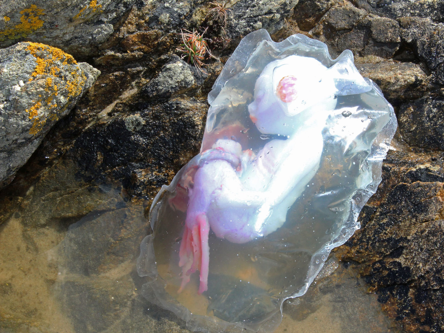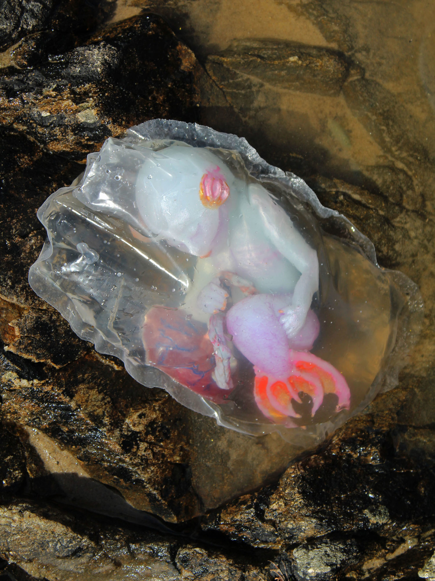 This project consists of a mermaid fetus, umbilical cord and placenta cast in solid silicone from plaster molds. It is suspended in diluted natrosol to simulate amniotic fluid within a plastic amniotic sac. Most of the project time was spent on sculpting, with the sac being the most challenging aspect. I referenced the proportions of a human fetus at 20 weeks gestation, but with a developmental age of 28 weeks to replicate ex utero development in nature. I chose physical traits for the fetus based on my idea of what the parents might look like. This was influenced by a story I created about them and the circumstances in which the conception of their fetus had to be hidden.