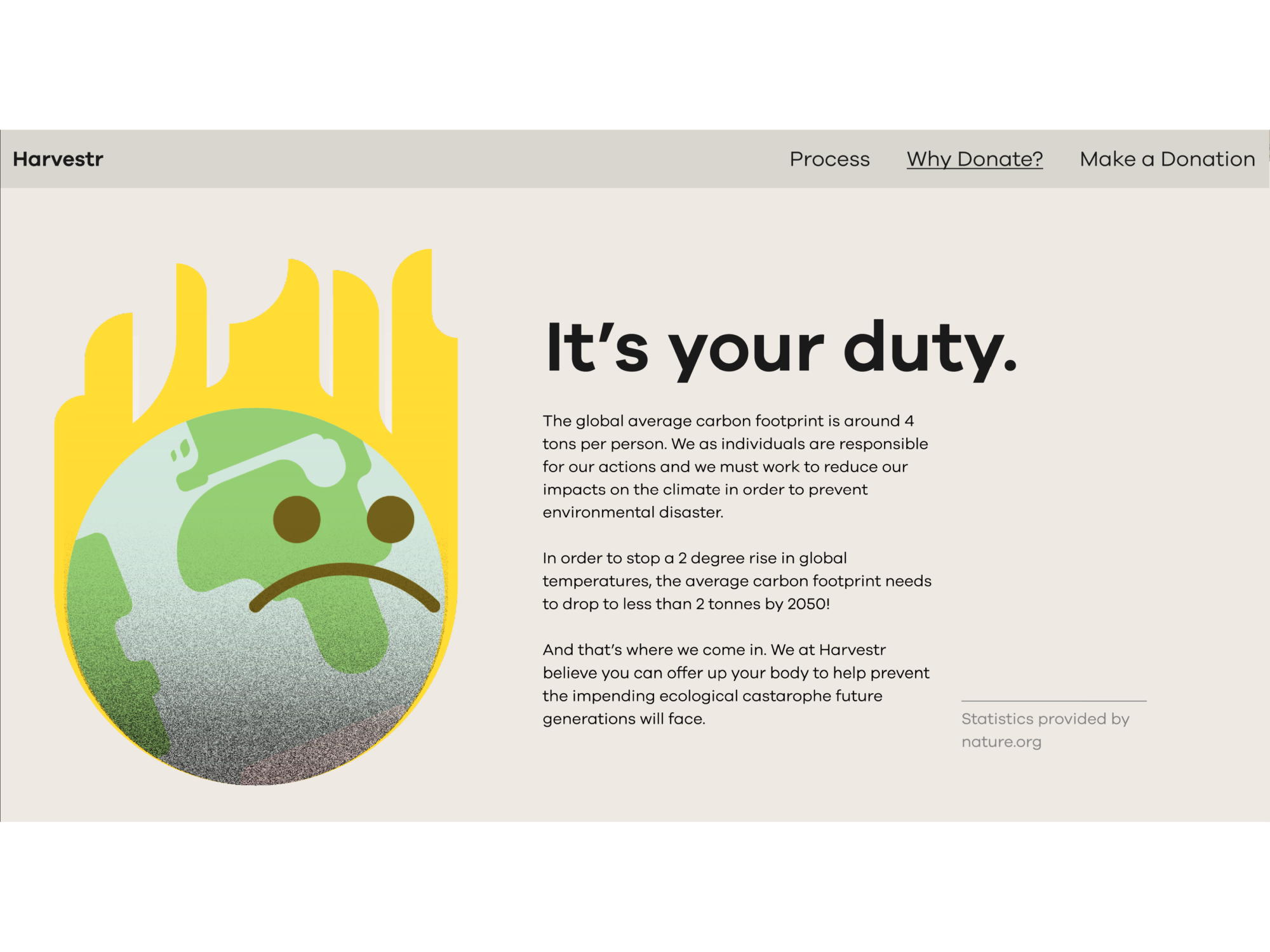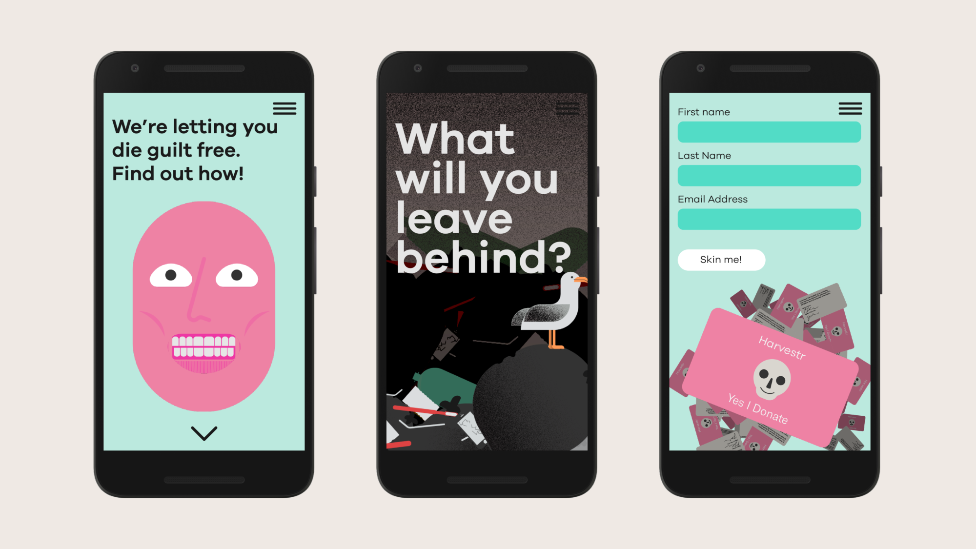 Harvestr is a company which encourages users to donate their bodies to be used in manufacturing sustainable leather, bone ash products, and biodiesel. With traditional burials and cremations being incredibly resource intensive and damaging to the environment, this donation will let the user die with a clear conscience, knowing they have offset their carbon footprint.