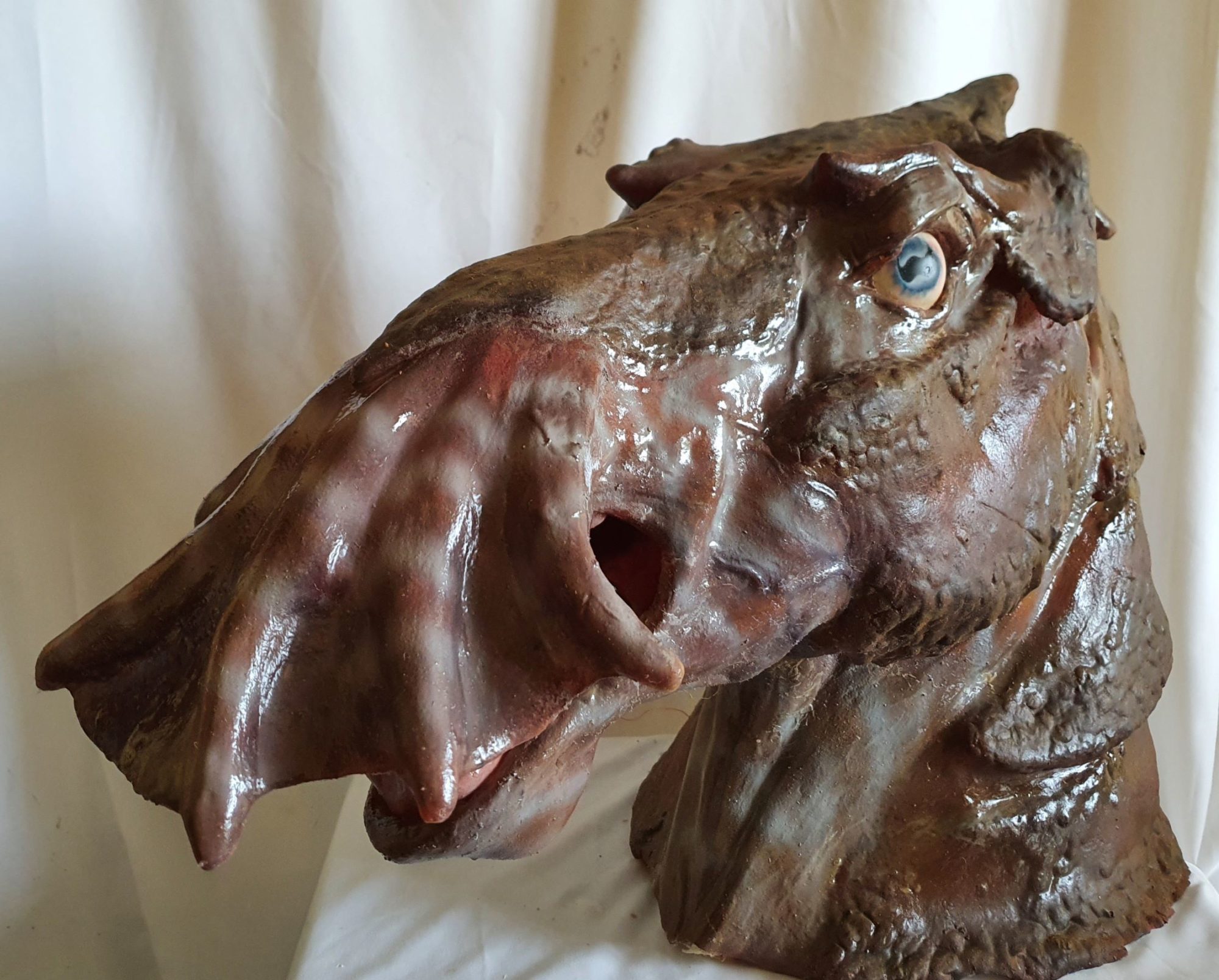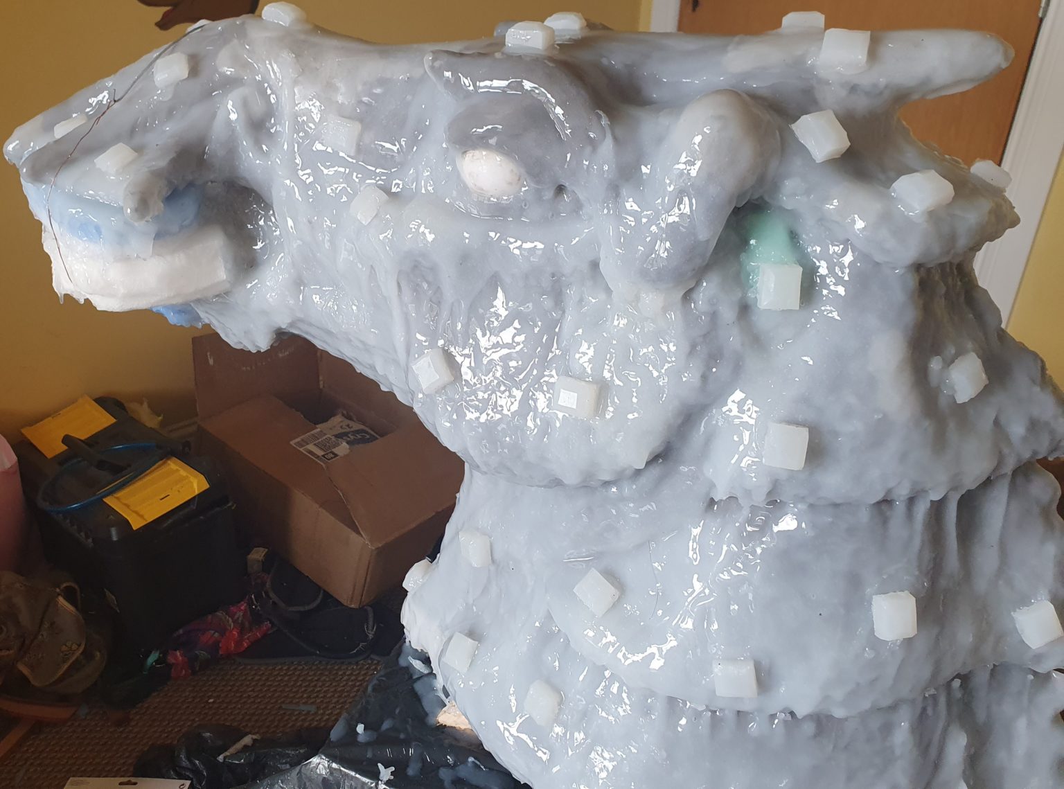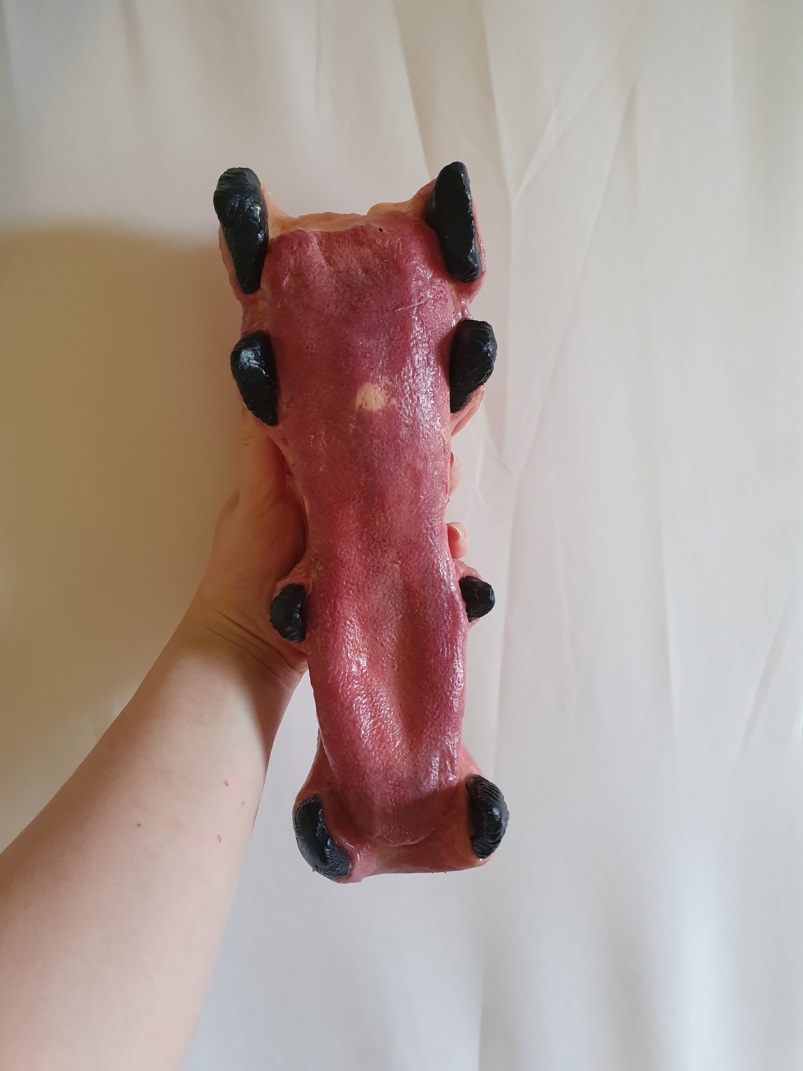 The creature was sculpted out of clay and made out of silicone. It measures at 70cm in width and 50cm in height. The puppet is controlled by “hand mech” that allows the creature to open its mouth. The jaw mechanism is simple, a few timbers to support the structure and springs allows it to be closed at all times, however, the string that is attached at the tip of the lower jaw travels through the head and neck which controls the opening of the mouth.