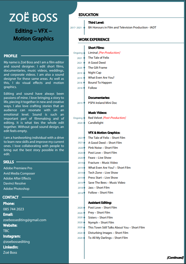 Hi, I'm Zoë Boss. I am a film editor and sound designer. I edit short films, documentaries, music videos, weddings, and corporate videos. As well as this, I do visual effects and motion graphics. Editing has always been a passion of mine. I love bringing a story to life, piecing it together in new and creative ways. I also love crafting stories that an audience can resonate with on an emotional level. I am a hardworking individual with a drive to learn new skills and improve my current ones. I am proficient in Adobe Premiere Pro, Avid Media Composer, Adobe After Effects, Davinci Resolve, and Adobe Photoshop.