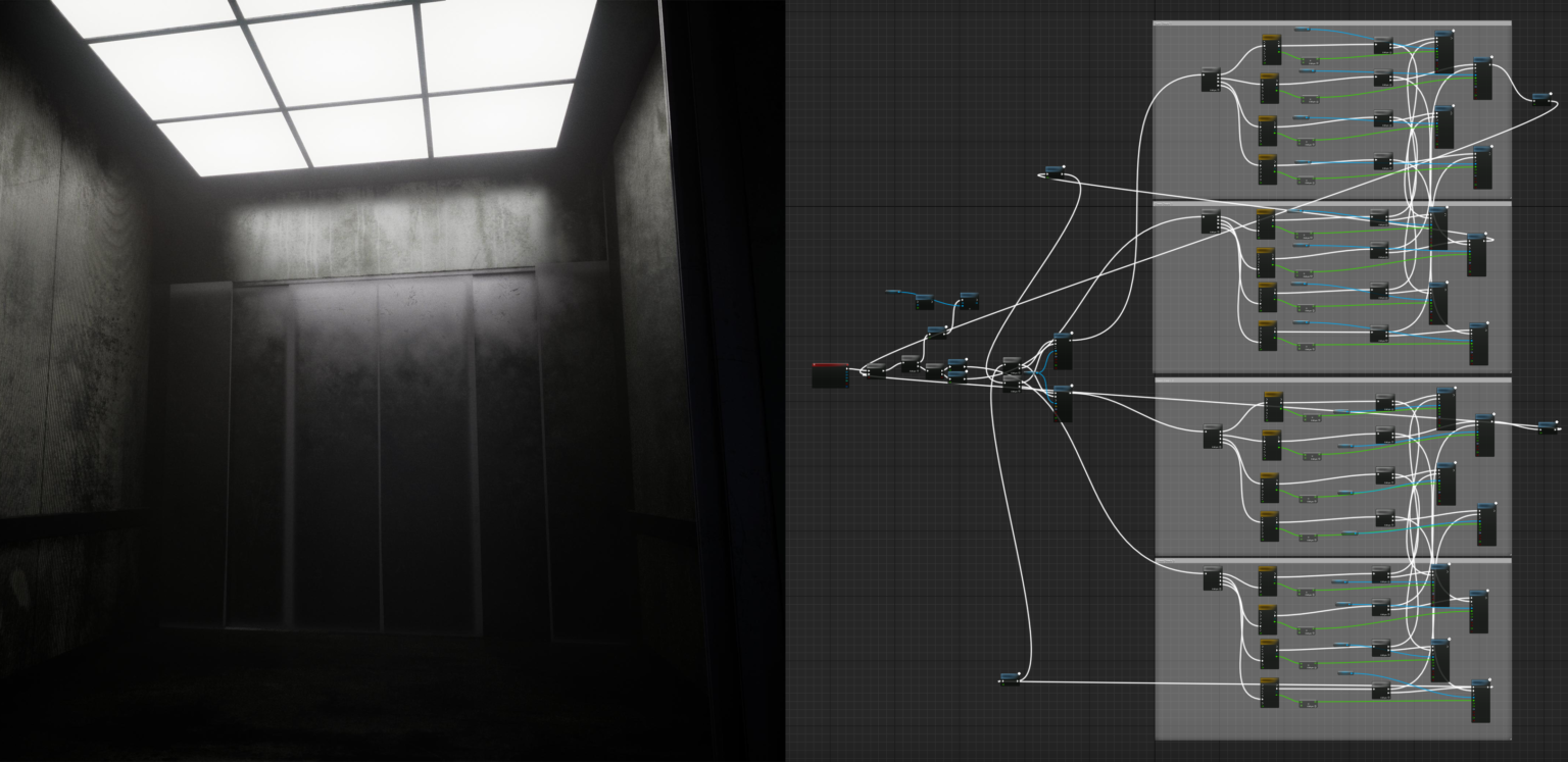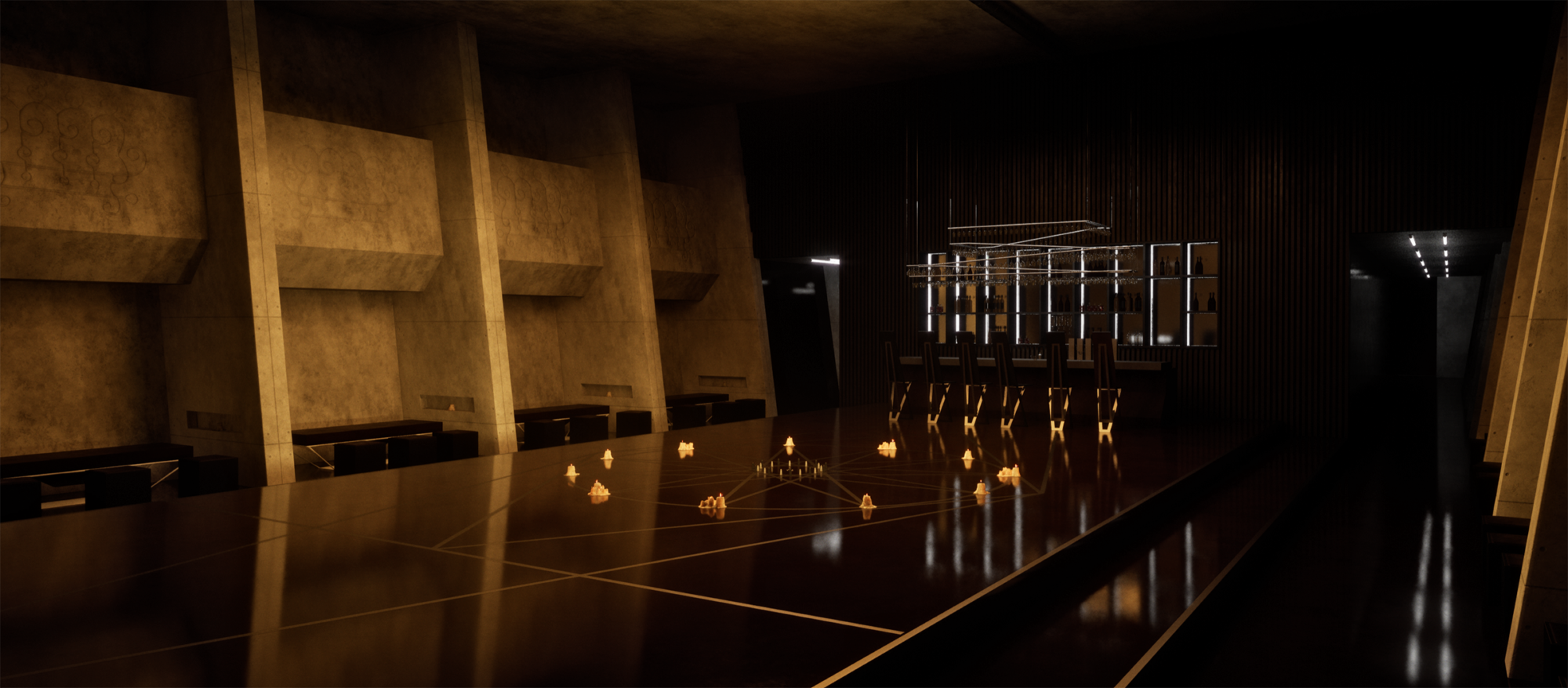 My goal was to create a scene with some linear progression to it, starting with a bar area and having that room lead to other rooms, eventually ending up in the main chamber deep underground. All the modelling would be done in Blender, textured with Substance Designer/Painter, then transferred to Unreal Engine so the scene could be interactively explored in real time. To branch out into other creative areas, I also wanted to add dynamic sound to the scene and have this synced with custom animations playing on screens within the scene itself. Some ideas were scrapped and the size of the initial idea was reduced as it proved too ambitious, but I'm still happy with what I achieved by the end.