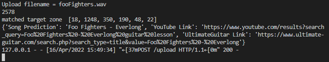 This project is about music recognition which was developed with Python & Flask. The application allow users to use a sample recording of a song from their phone and play it into a microphone connected to a PC. The application will then try to identify the audio clip from the 6 songs that are stored in the database and show a result that is the closest match to the sample recording. The application will also show the user links that are used as lessons to play the song on guitar from YouTube and UltimateGuitar. Due to an error with the recording format, a work around is used to get an accurate result by uploading a file of the recorded sample to the application.