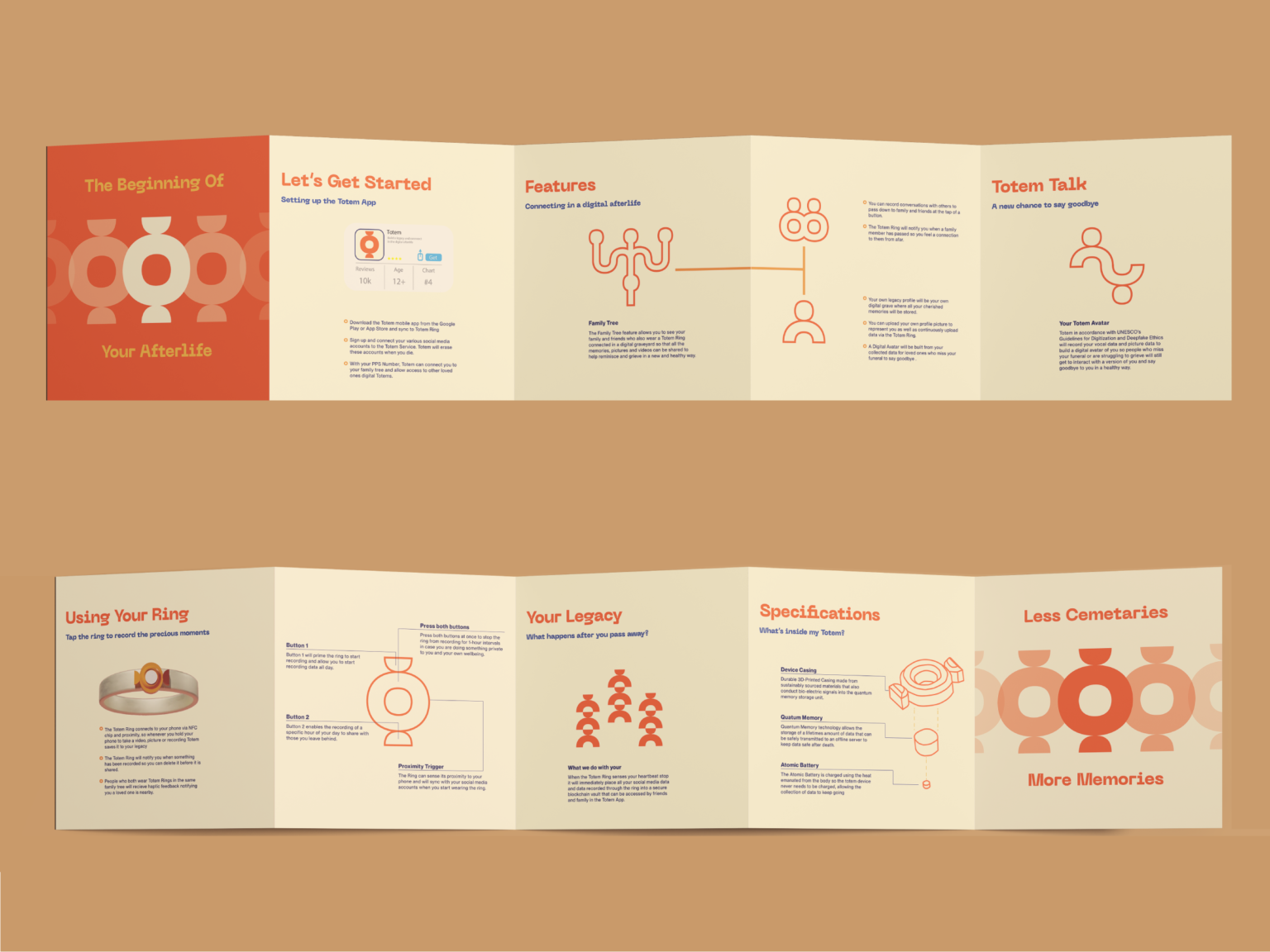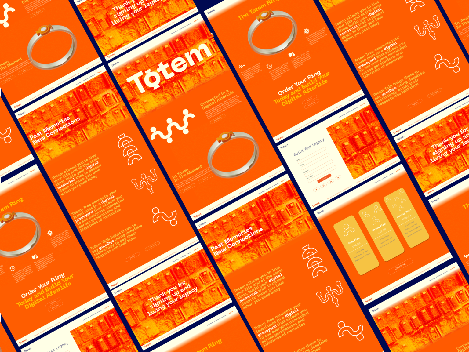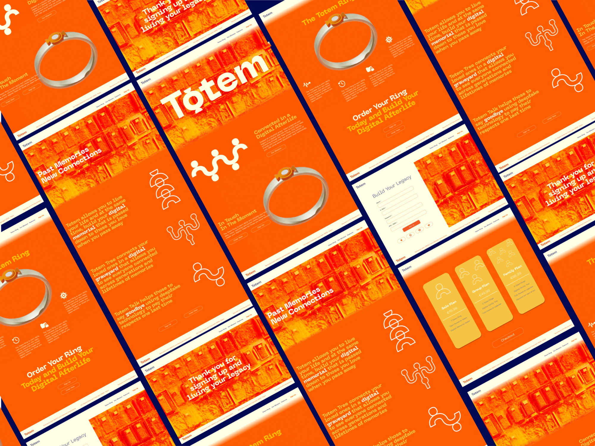 To illustrate this story I have designed a brand identity and promotional video for the company that highlights how the Totem Ring collects data and can keep the users' data safe in a blockchain vault that only loved ones have access to. The mobile app I designed is intended to substitute the physical graveyard as users see their family and friends connected in a digital afterlife where their most cherished moments can be shared with family when they depart.