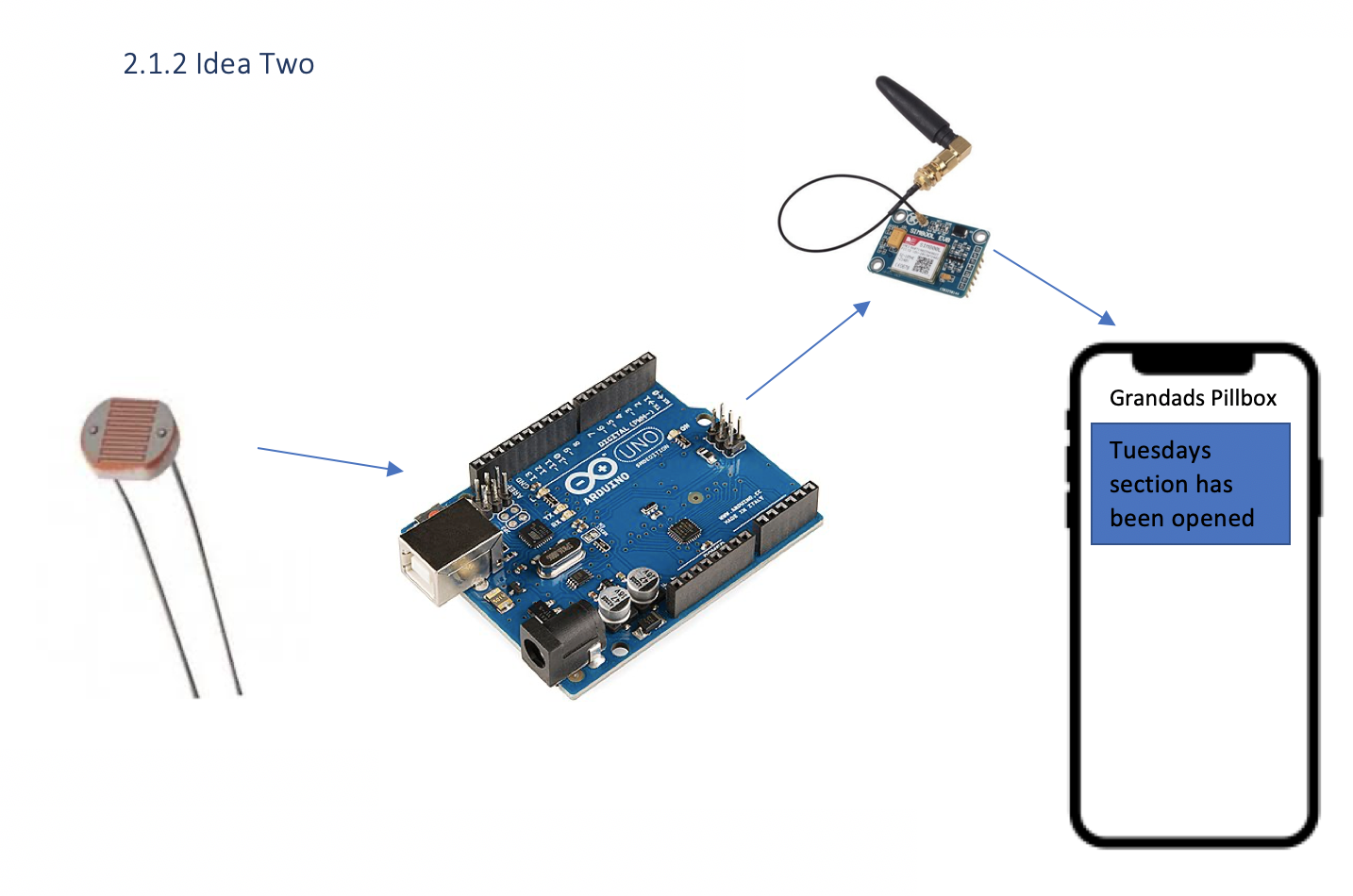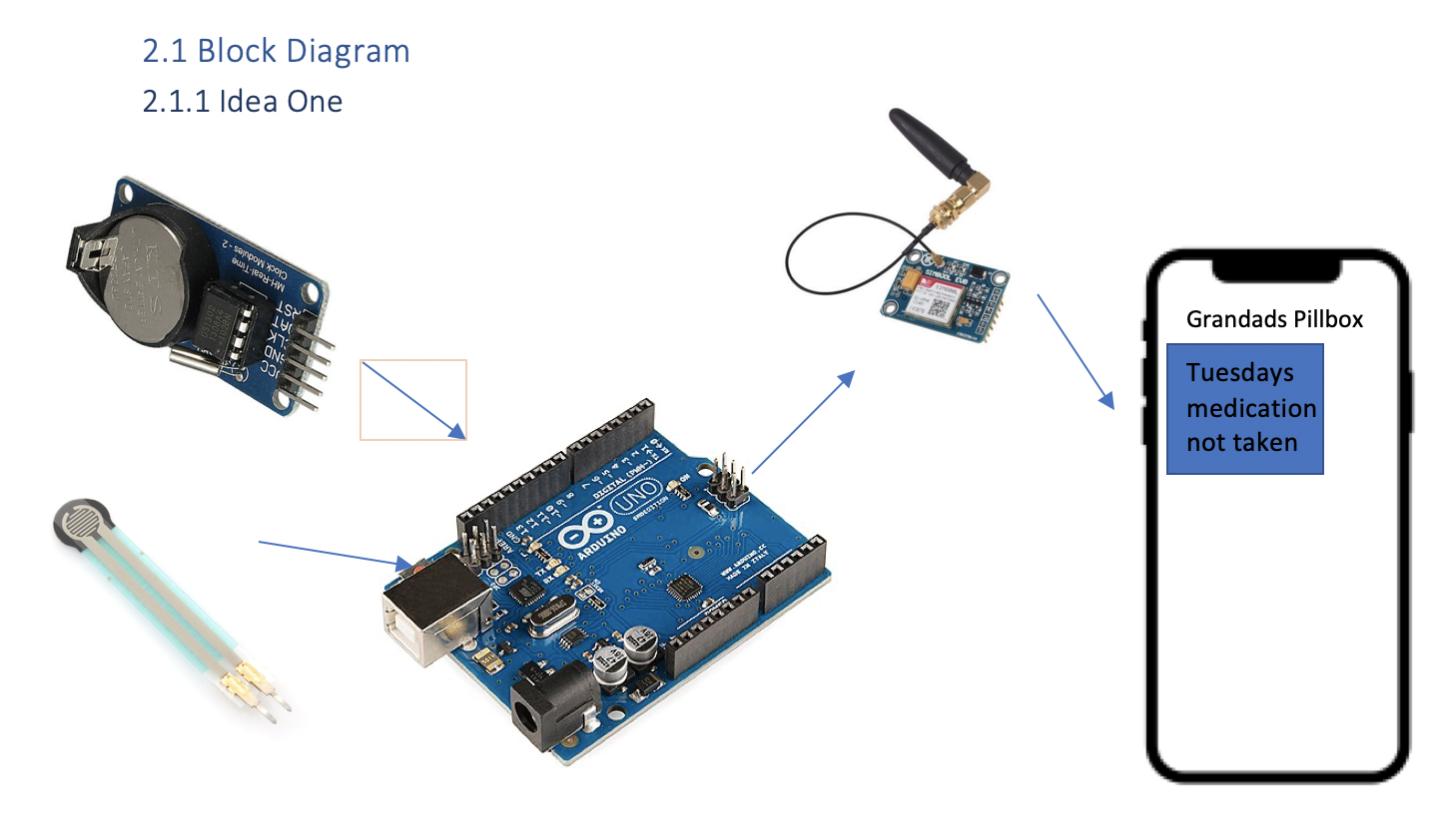 The original idea consisted of an RTC module which would wait to send a text if the medication had not been taken before a certain time. The failure of this component as well altered the final idea.