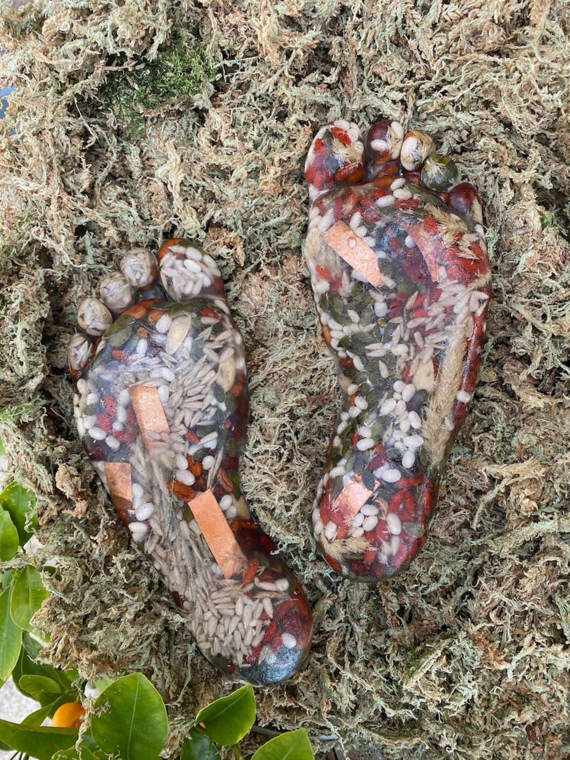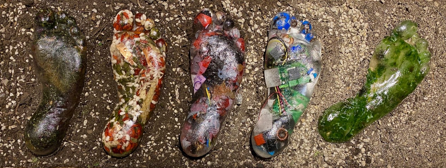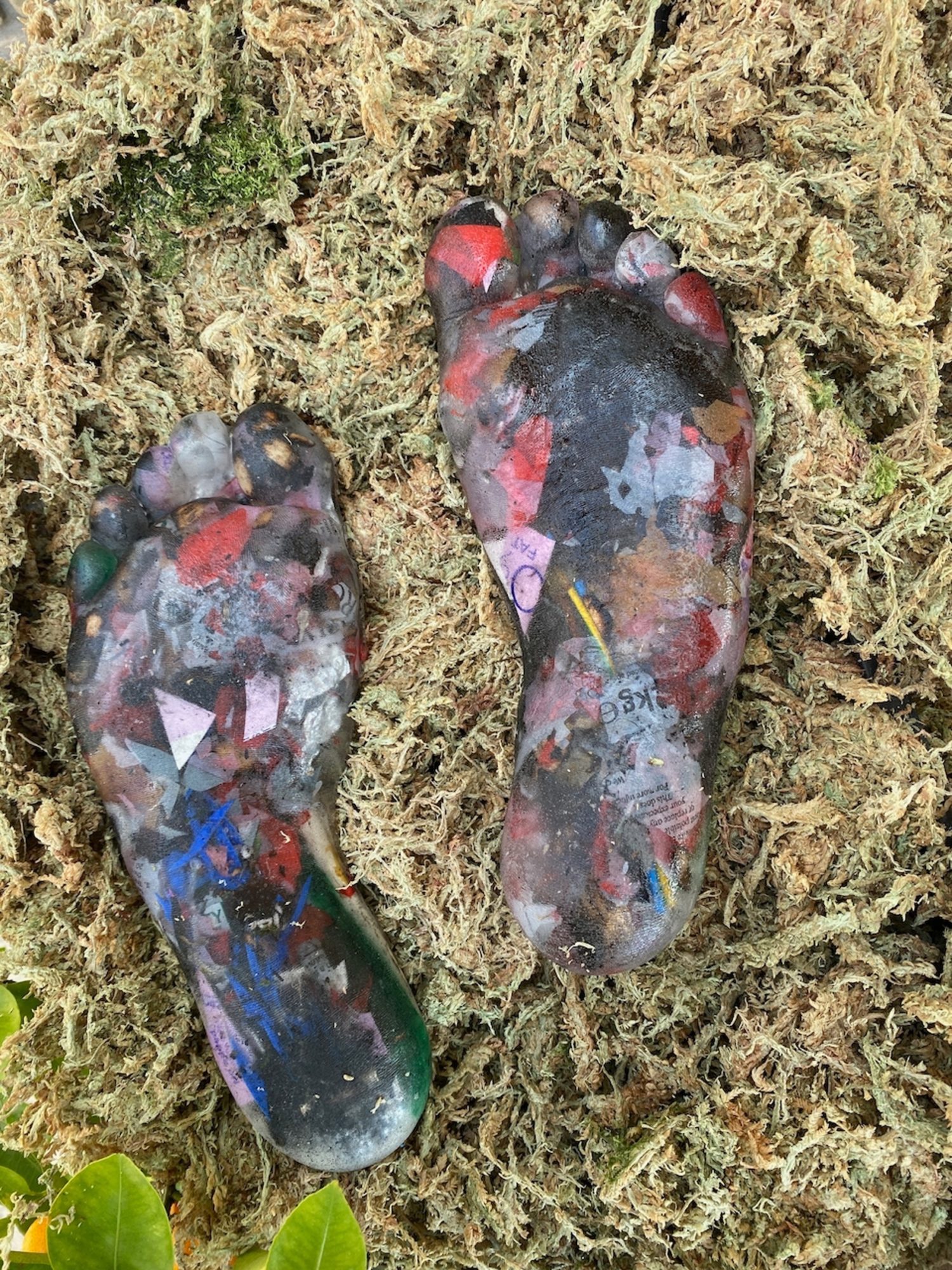 My project is concerned with the Anthropocene. That’s a big word to describe the myriad of minute details that make up the compounding effect of our imprint on the planet. I am investigating these effects in various ways, for example by using honey to explore climate change. My abstract wood sculpture emphasises the human connection to the earth, through its form and materiality. Environmental adaptation is the concept of my resin and glass footsteps. I like to focus on using materials of the earth, such as clay, wood, moss, algae, water and wax, in an effort to be ethical and as sustainable as possible. This often calls for ingenuity, requiring research and experimentation with materials such as bioresins, in order to achieve my aims. Covid 19 lockdowns gave me ample opportunity to immerse myself in recent writings on the natural world. These writers are inspirational in formulating the ideas incorporated in my project.