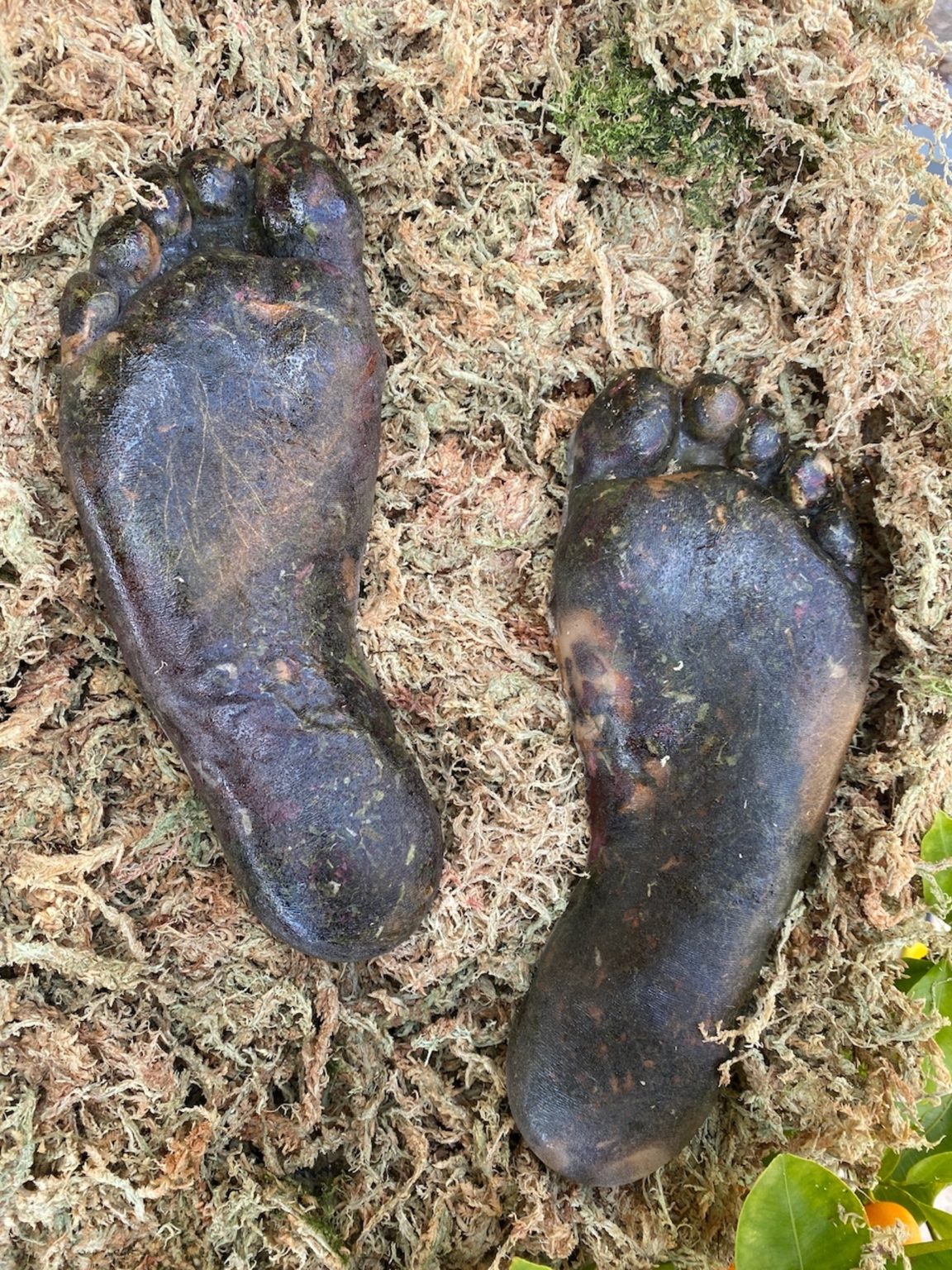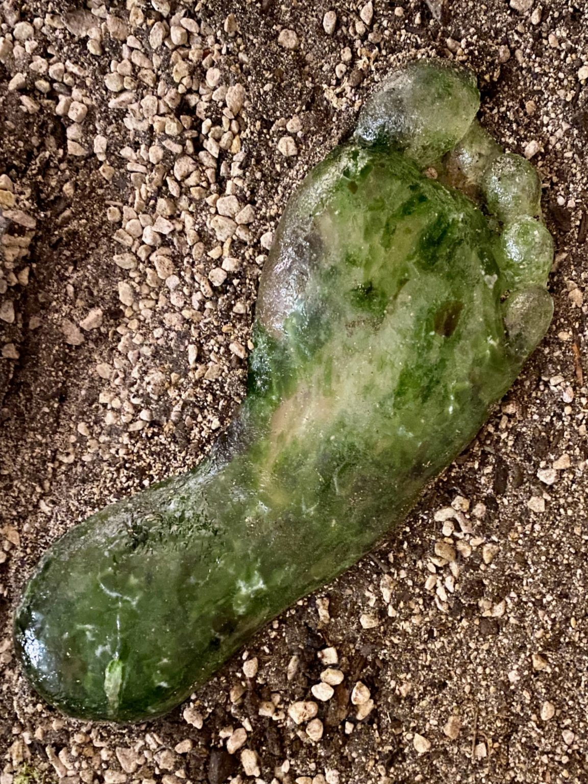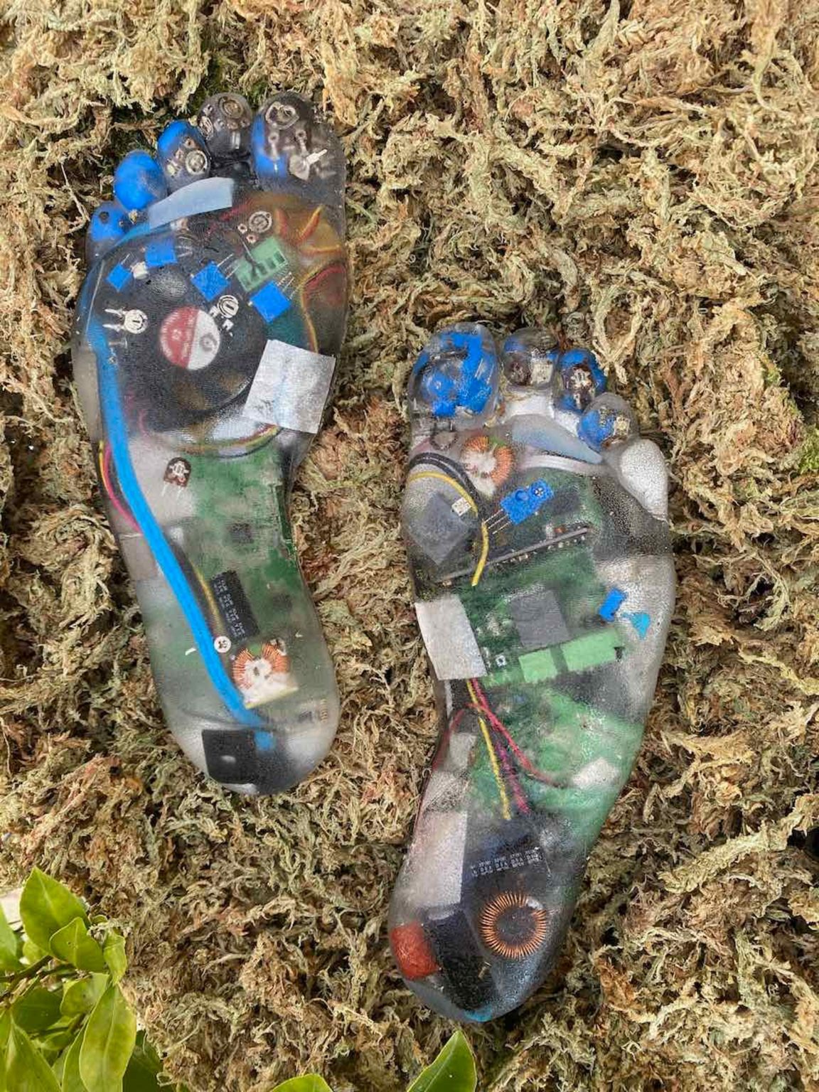 My project is concerned with the Anthropocene. That’s a big word to describe the myriad of minute details that make up the compounding effect of our imprint on the planet. I am investigating these effects in various ways, for example by using honey to explore climate change. My abstract wood sculpture emphasises the human connection to the earth, through its form and materiality. Environmental adaptation is the concept of my resin and glass footsteps. I like to focus on using materials of the earth, such as clay, wood, moss, algae, water and wax, in an effort to be ethical and as sustainable as possible. This often calls for ingenuity, requiring research and experimentation with materials such as bioresins, in order to achieve my aims. Covid 19 lockdowns gave me ample opportunity to immerse myself in recent writings on the natural world. These writers are inspirational in formulating the ideas incorporated in my project.
