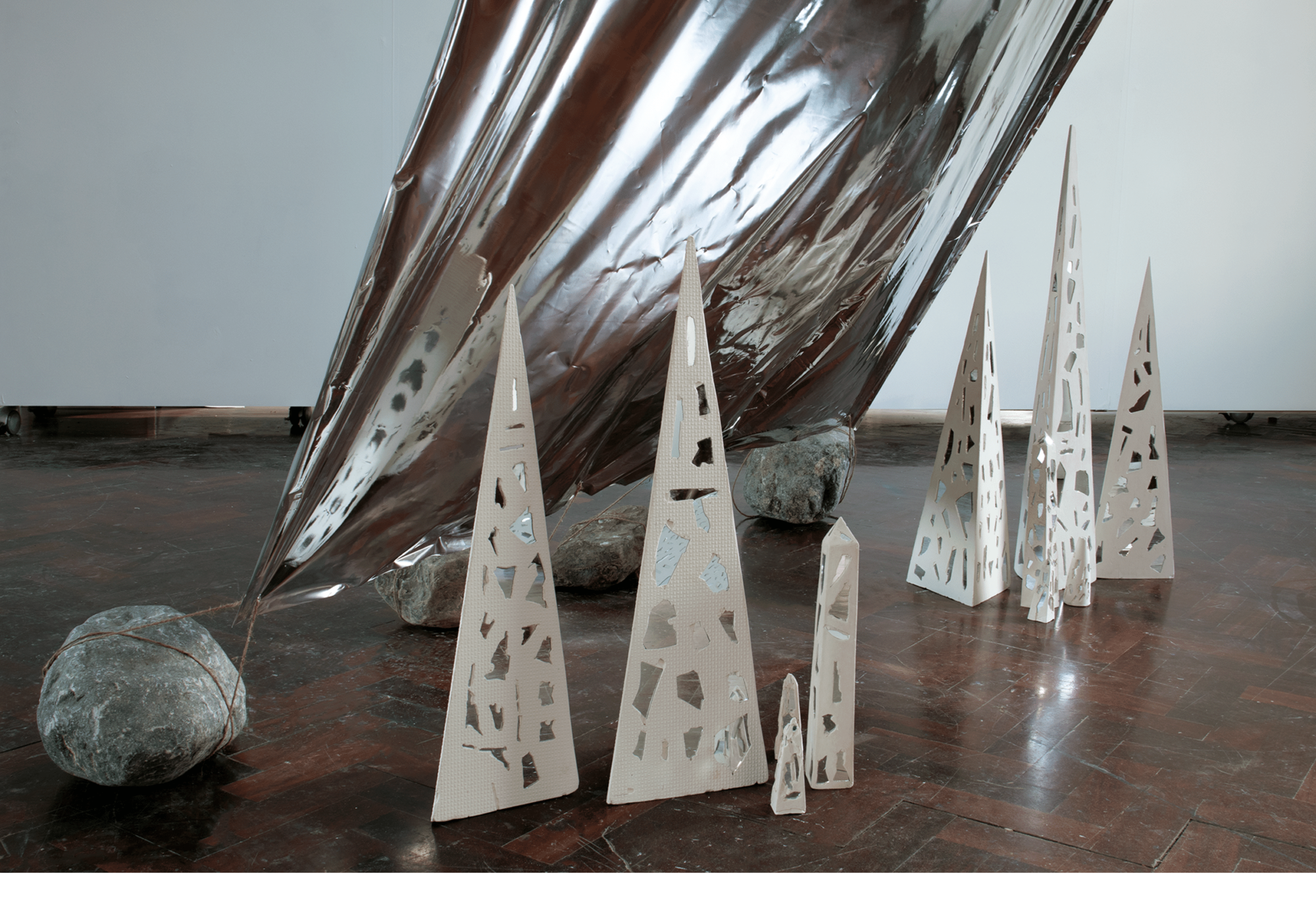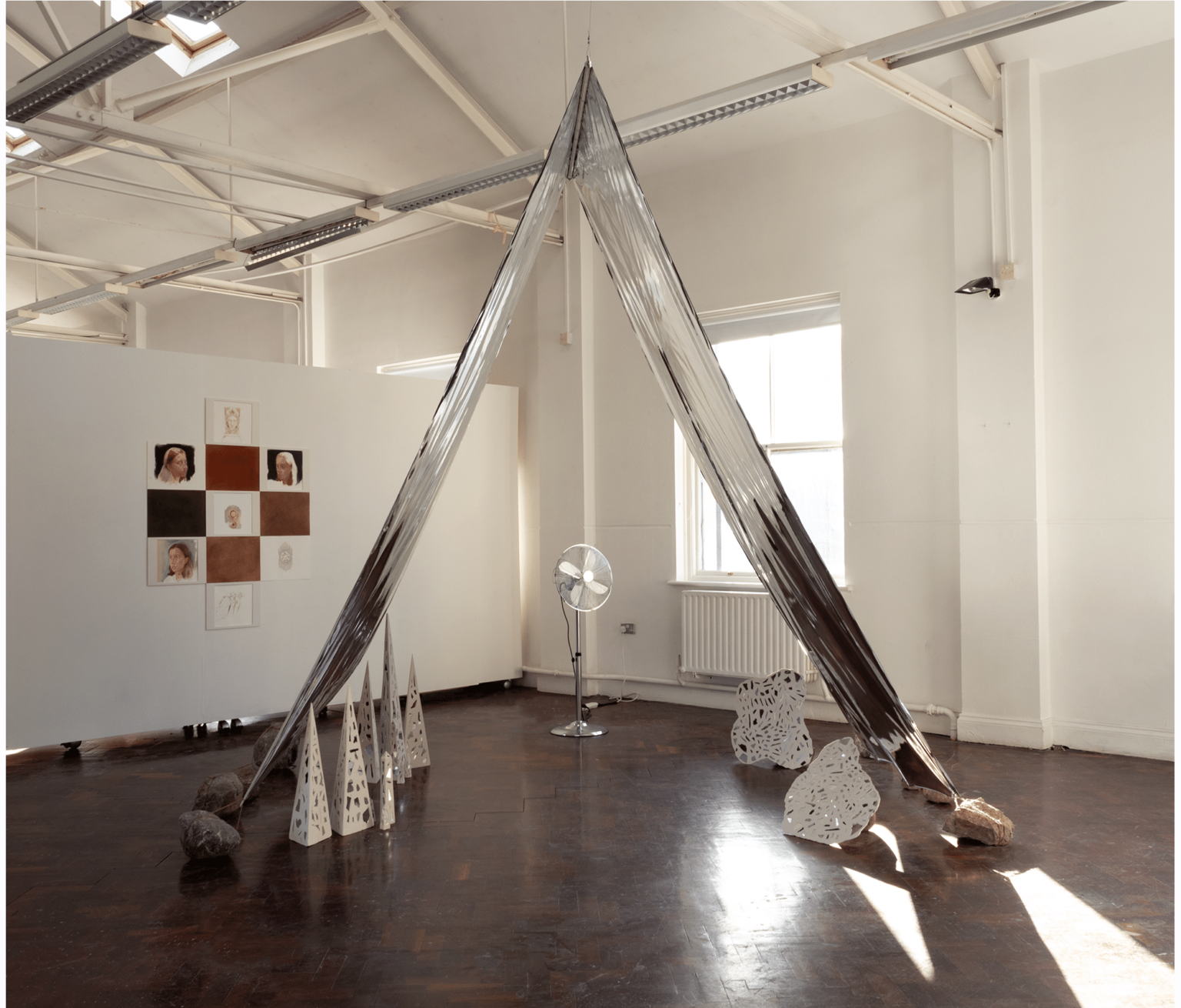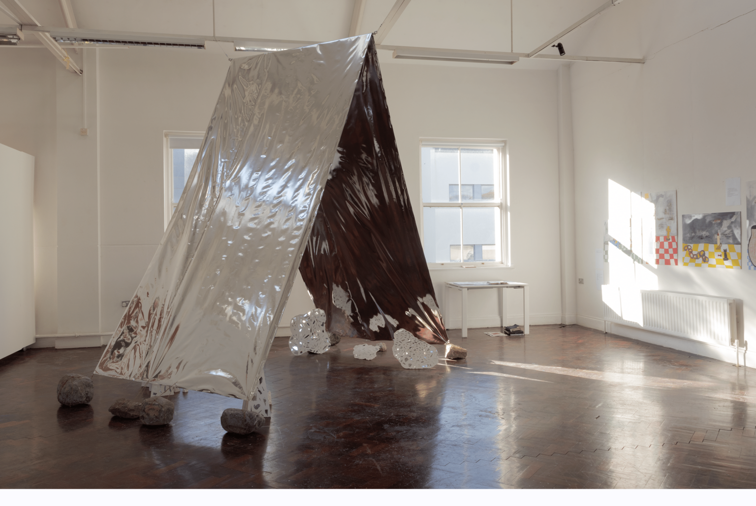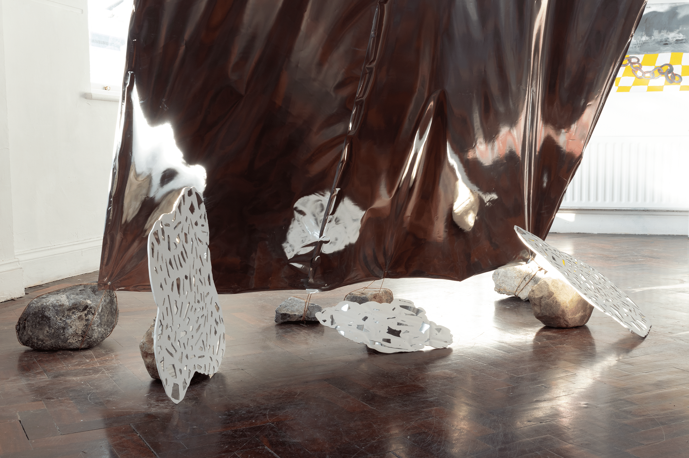 The Solas/Solace series is inspired by everyday light effects that can bring a moment of peace, such as light filtering through the leaves, and glistening light on the water. In my art I am interested in creating a sensory experience in which the viewer can have a moment away from the world of constant streams of information. I explore this concept by creating works that are affected by the light in some way. I am intrigued by the reflective qualities of different materials, and the atmosphere that the light reflections give to the space that they are in. The interaction between the light that is around the artwork and the work itself, and how this incorporates the light as part of the work, is also a part of these works.