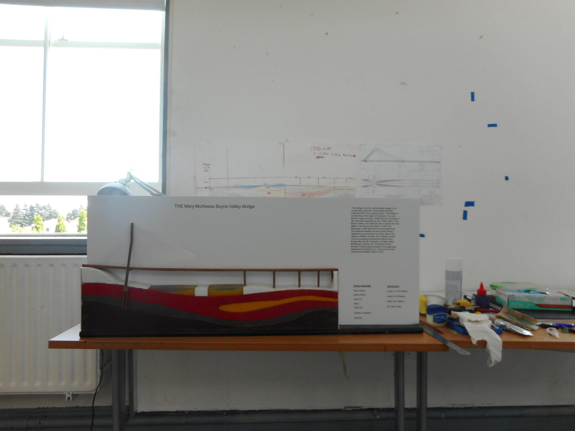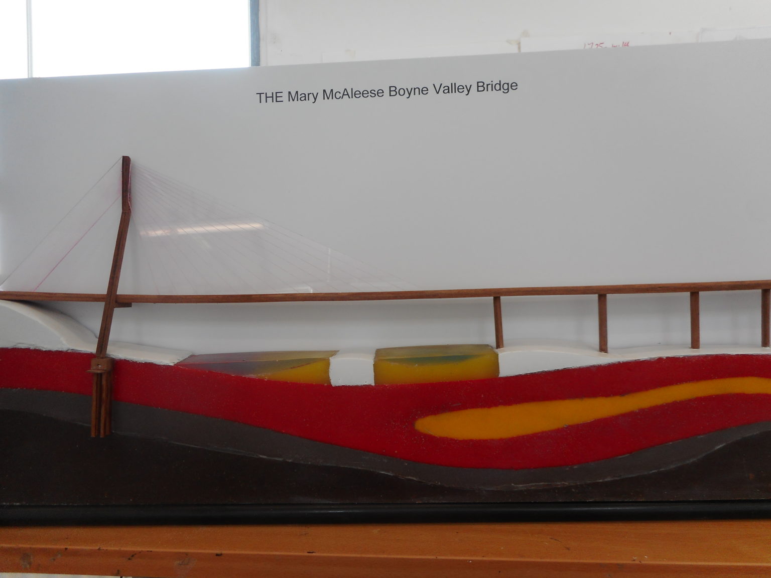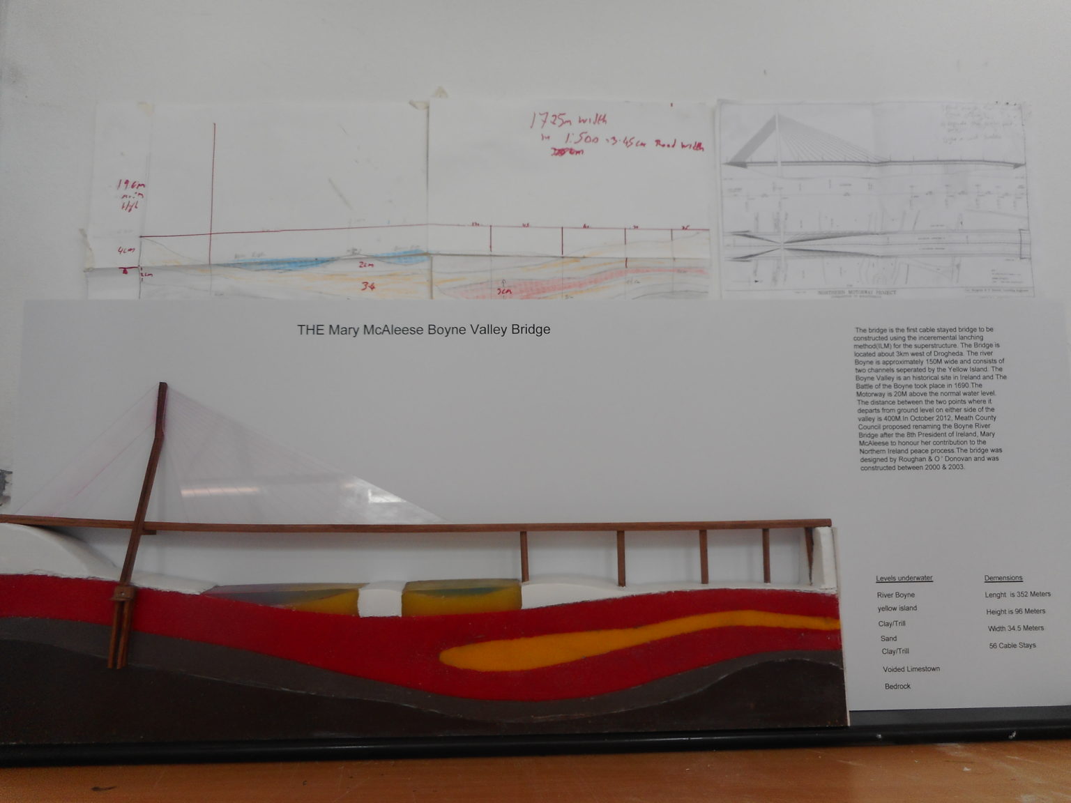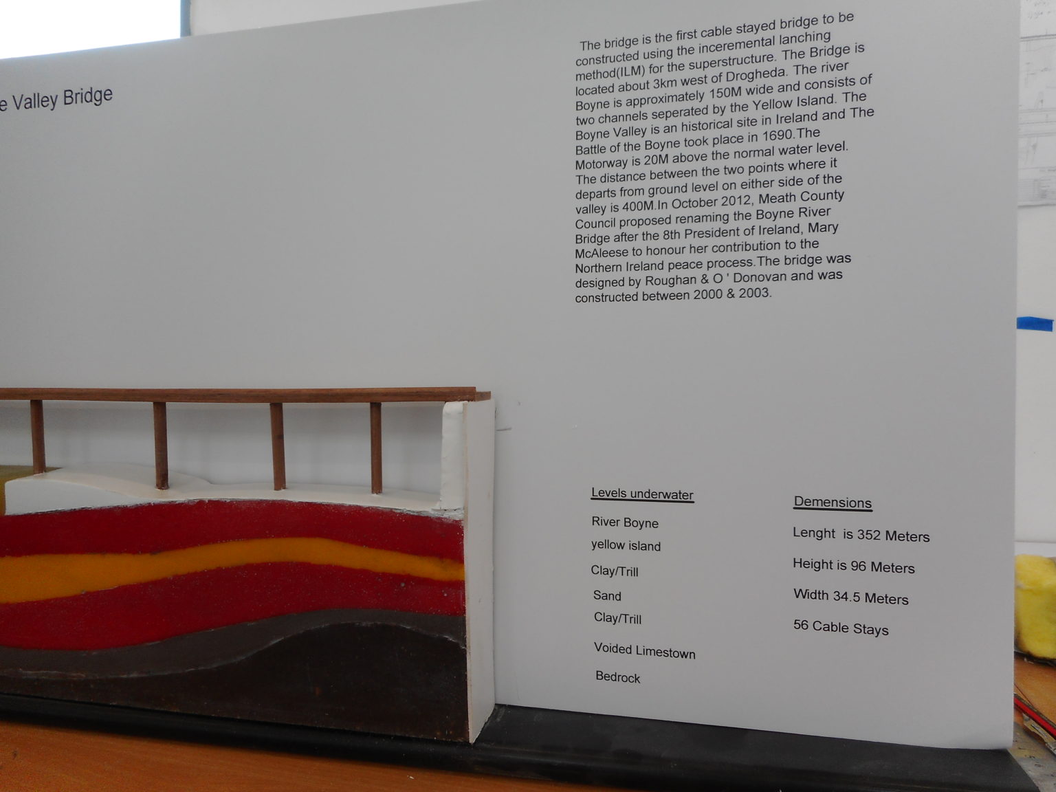 My project is a Mahogany miniature cable stayed bridge. The bridge is mounted on different levels of Epoxy Resin mixed with little stones, sand, colour sand and epoxy colour resin. There are six levels of resin representing The Bedrock, the first level. Voided Limestone the second level. Clay/Trill the third level. Sand the Fourth Level. The Yellow Island the Fifth Level and The Boyne river the sixth level. There is an information Board on the back of the project to give information on the location of the bridge. Information on the Boyne Valley, how the bridge was constructed. It was named after former President Mary McAleese and why.