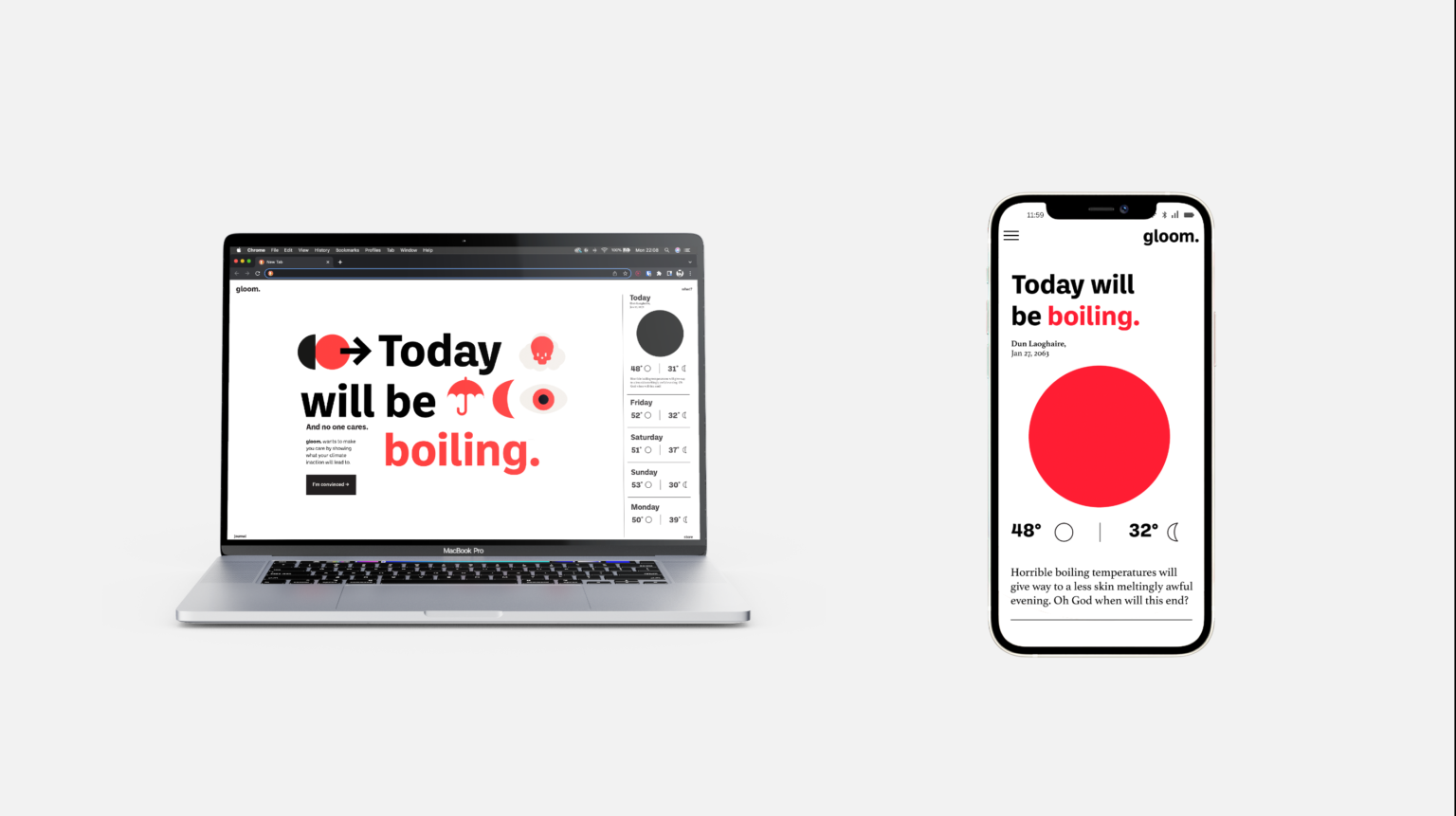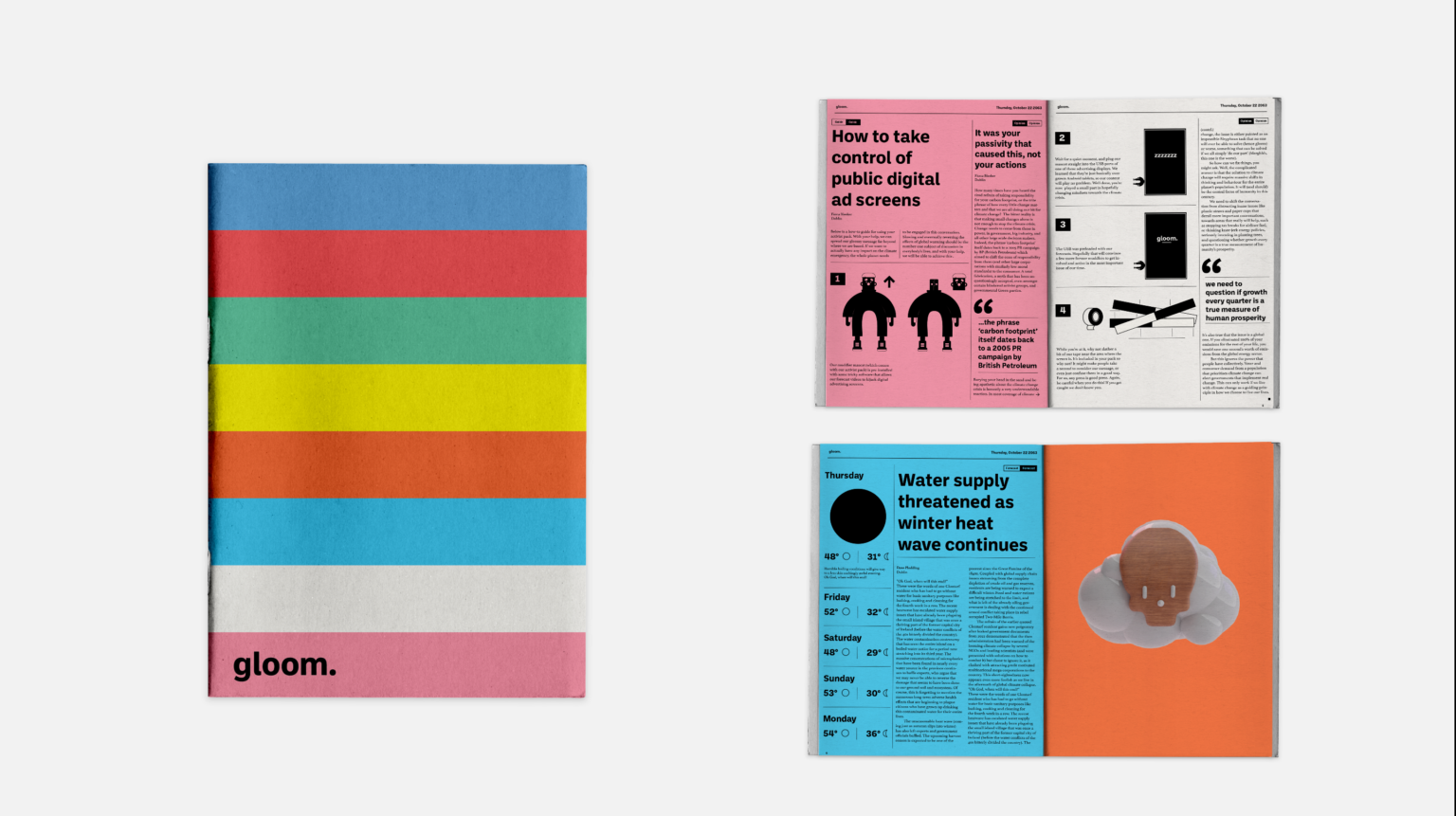 gloom is a weather forecast from the future, showing what our future forecast will look like if we continue to muddle through life, ignoring the climate crisis.