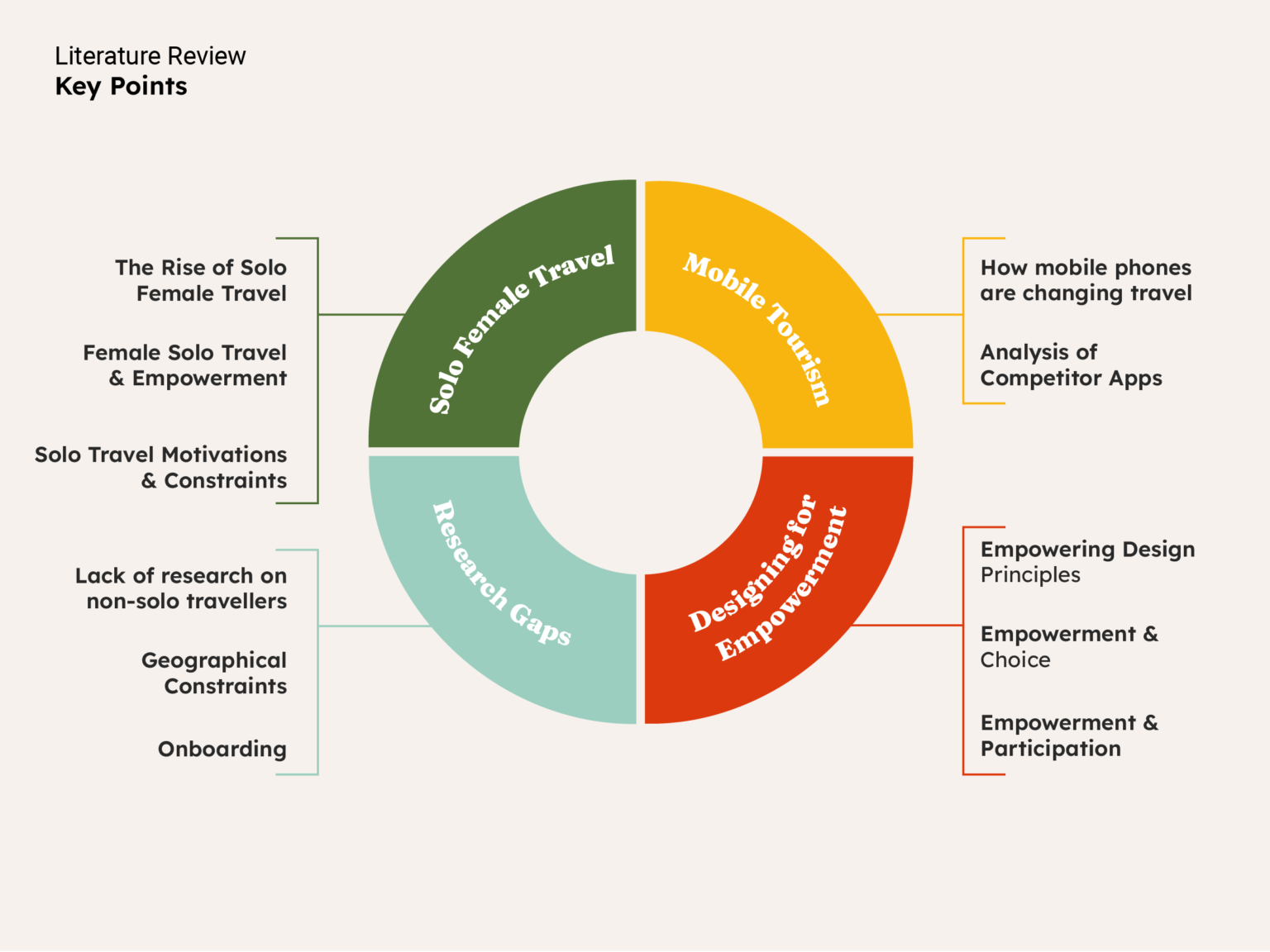 First, I performed a literature review focused on 4 main areas: solo female travel, mobile tourism, designing for empowerment, and research gaps.