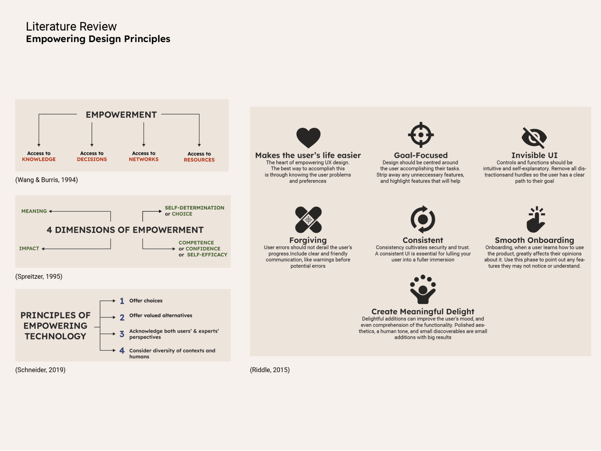 Next, I looked at empowering design principles found in research. These are 3 different sets of what researchers have defined as what makes up empowerment. It is important to note that all 3 have "choice” somehow integrated.