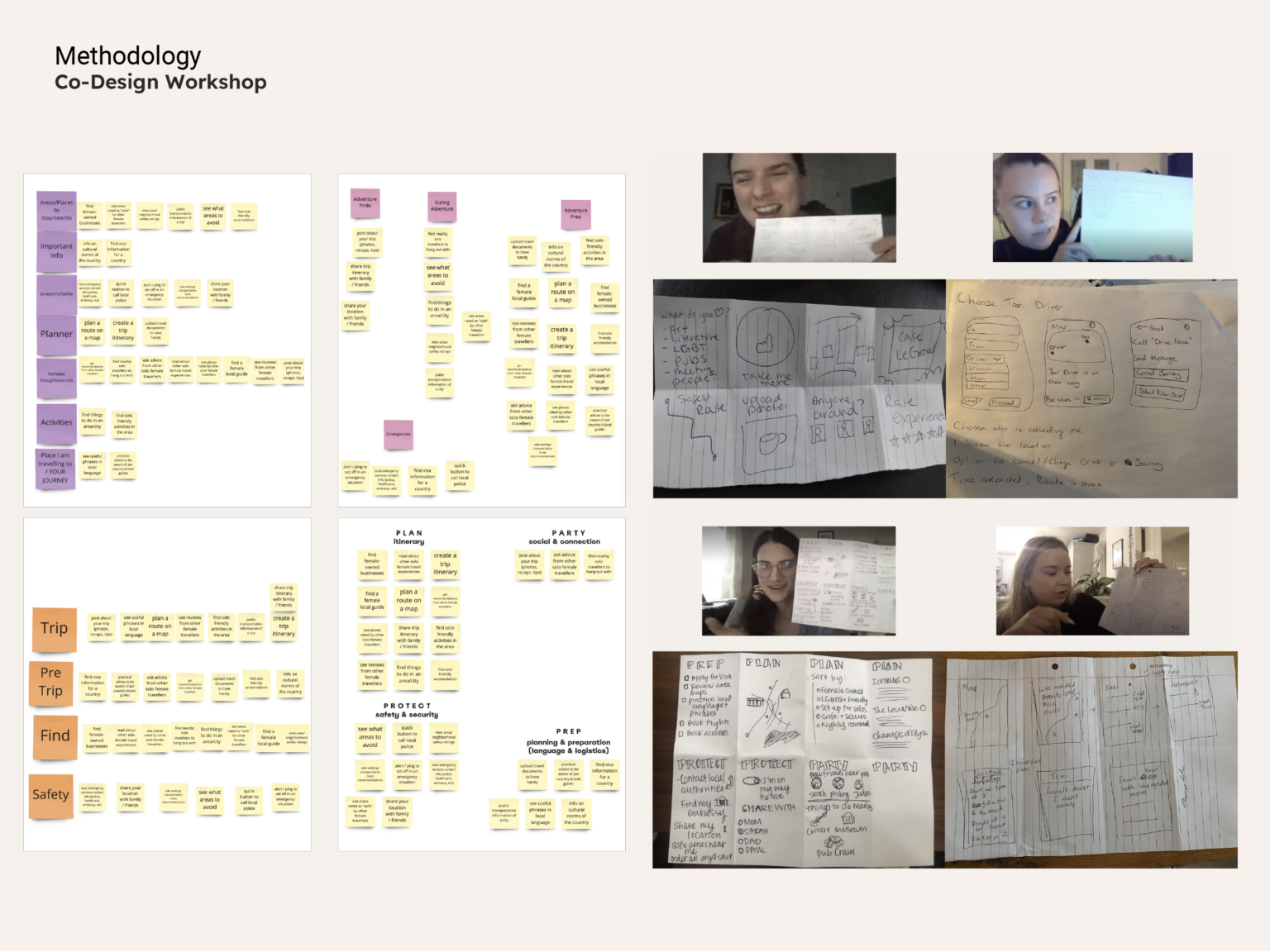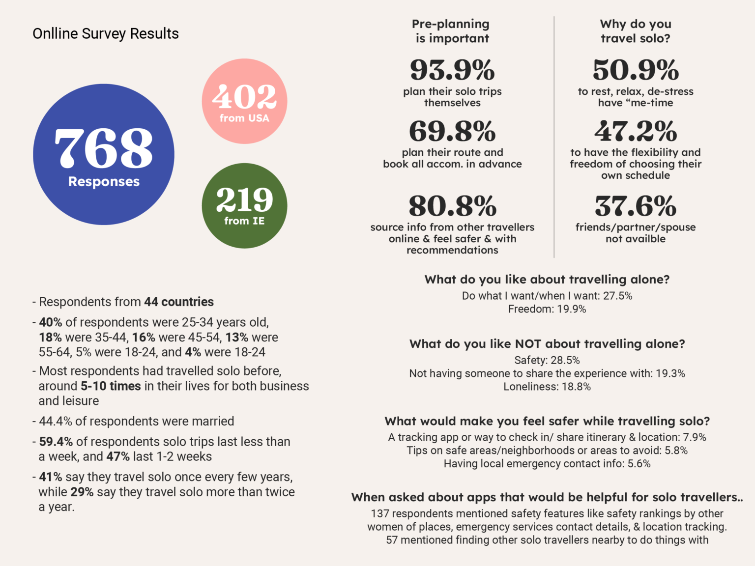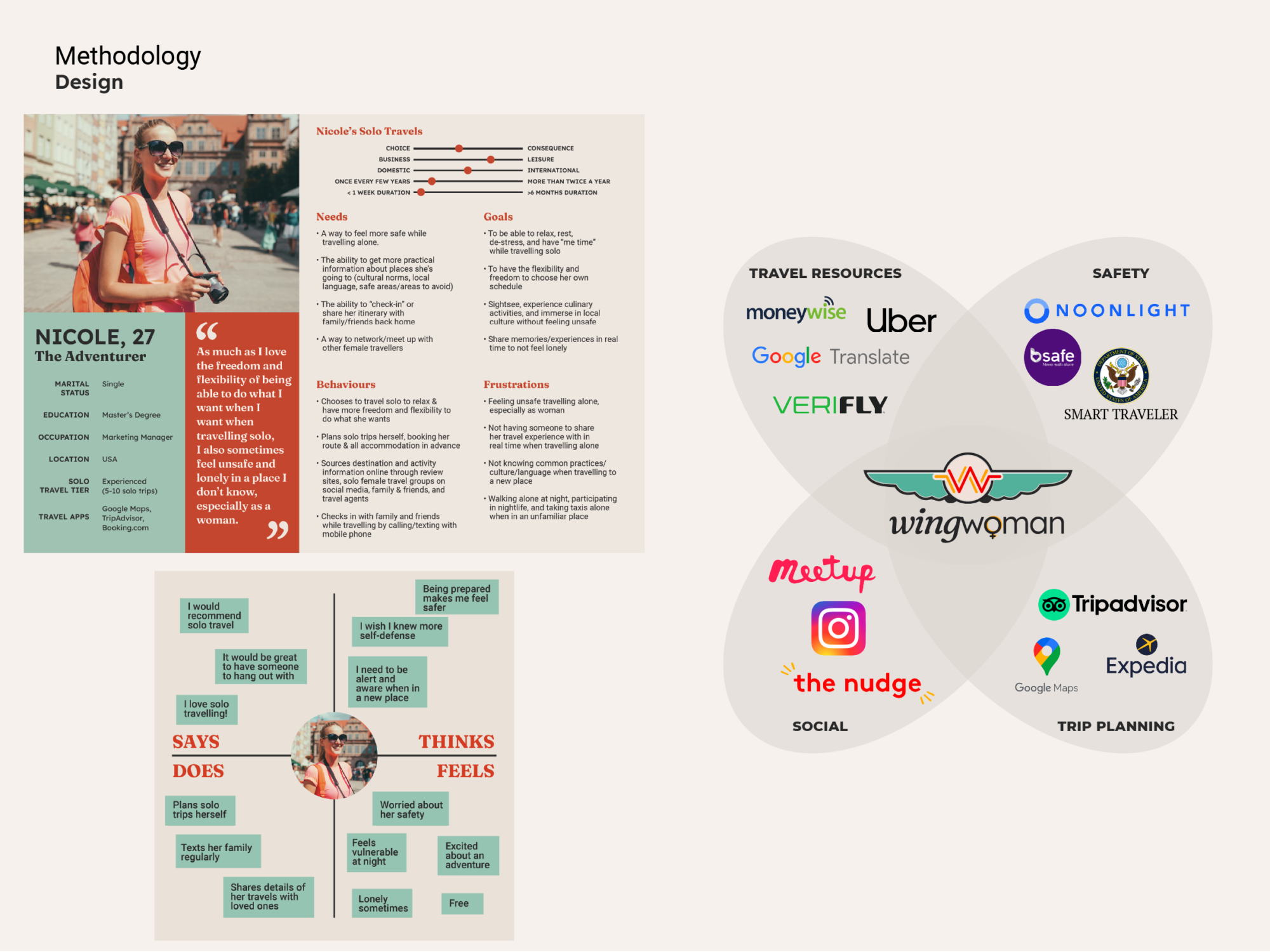 Also, 3 interviews were conducted with subject matter experts in both solo female travel and empowering design, and desk research was performed by doing an analysis of solo female traveller groups on Facebook.