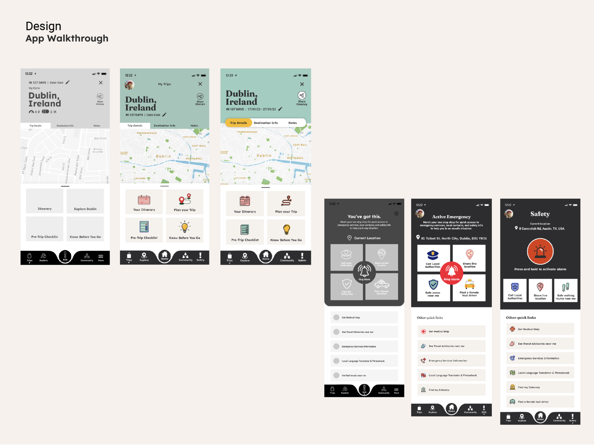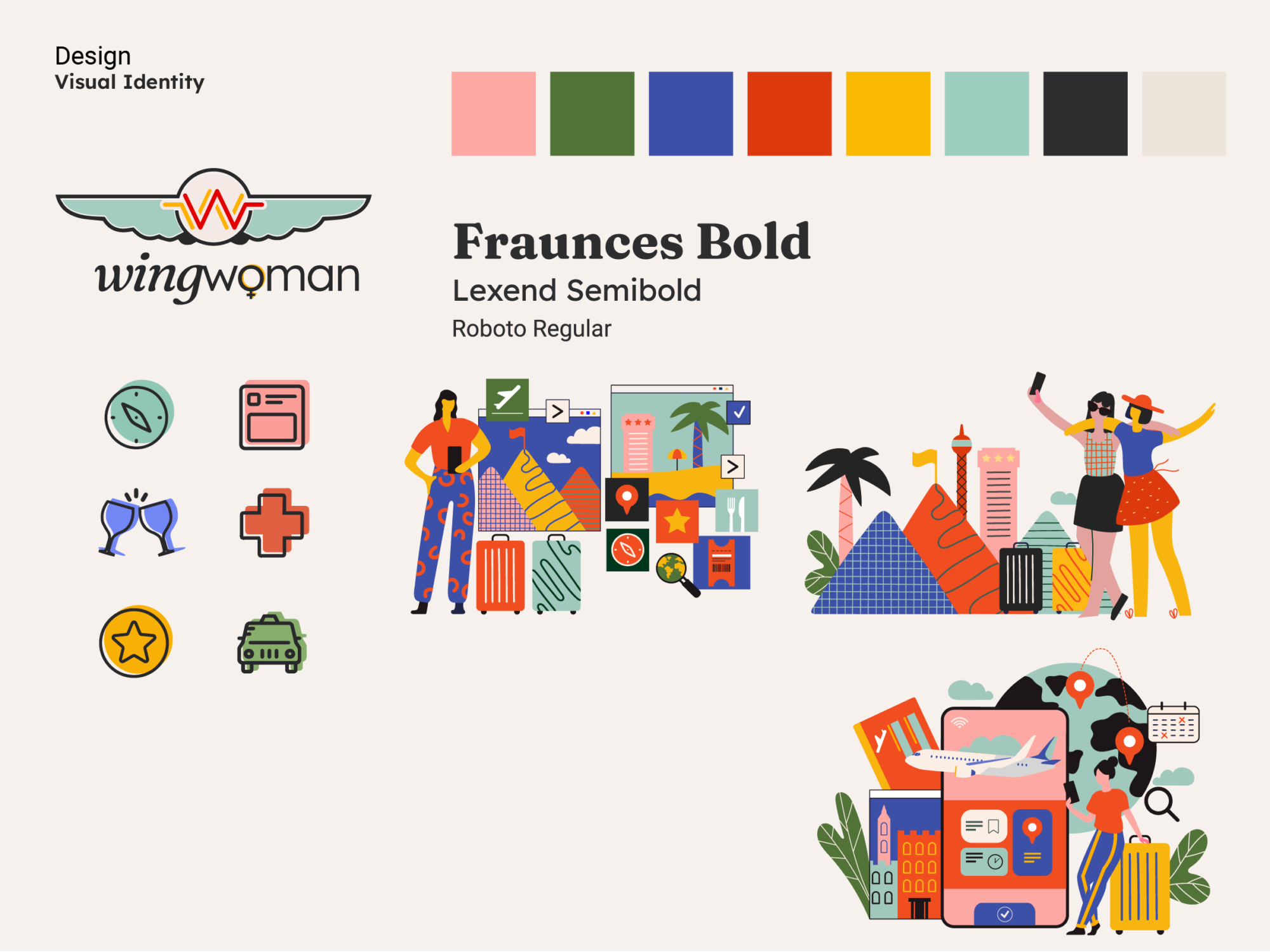 Walkthrough of the final iteration of the WING WOMAN app, an app designed to empowerment and help solo female travellers before, during, and after their solo trips. Below is an outline of the process of creating this app!