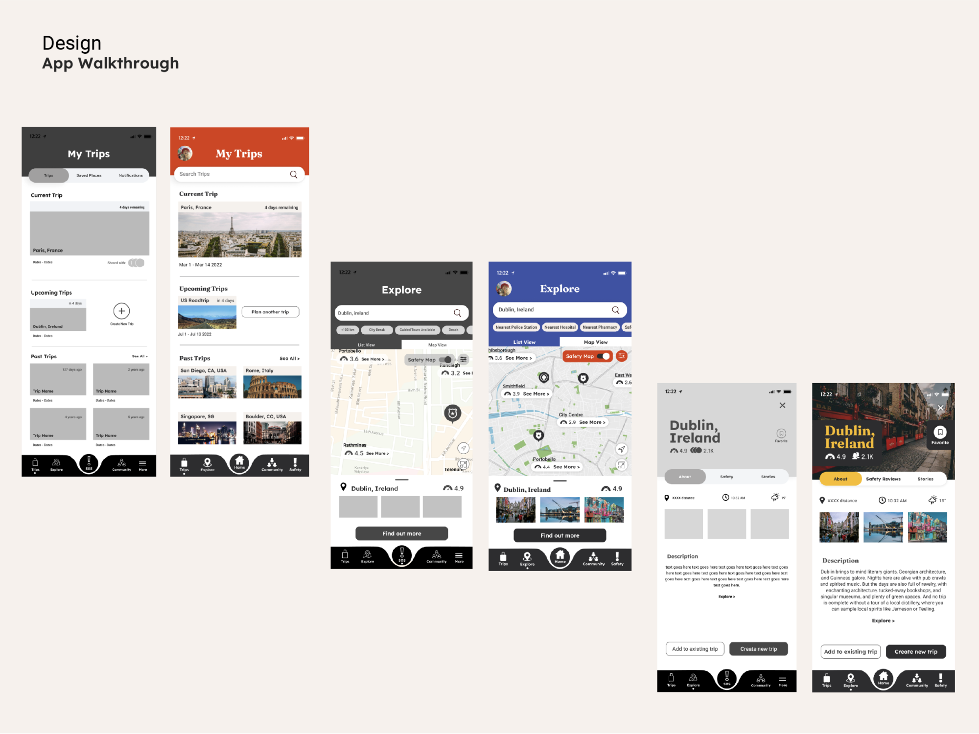 Here are examples of key app screens at the wireframe stage and at the final iteration stage.