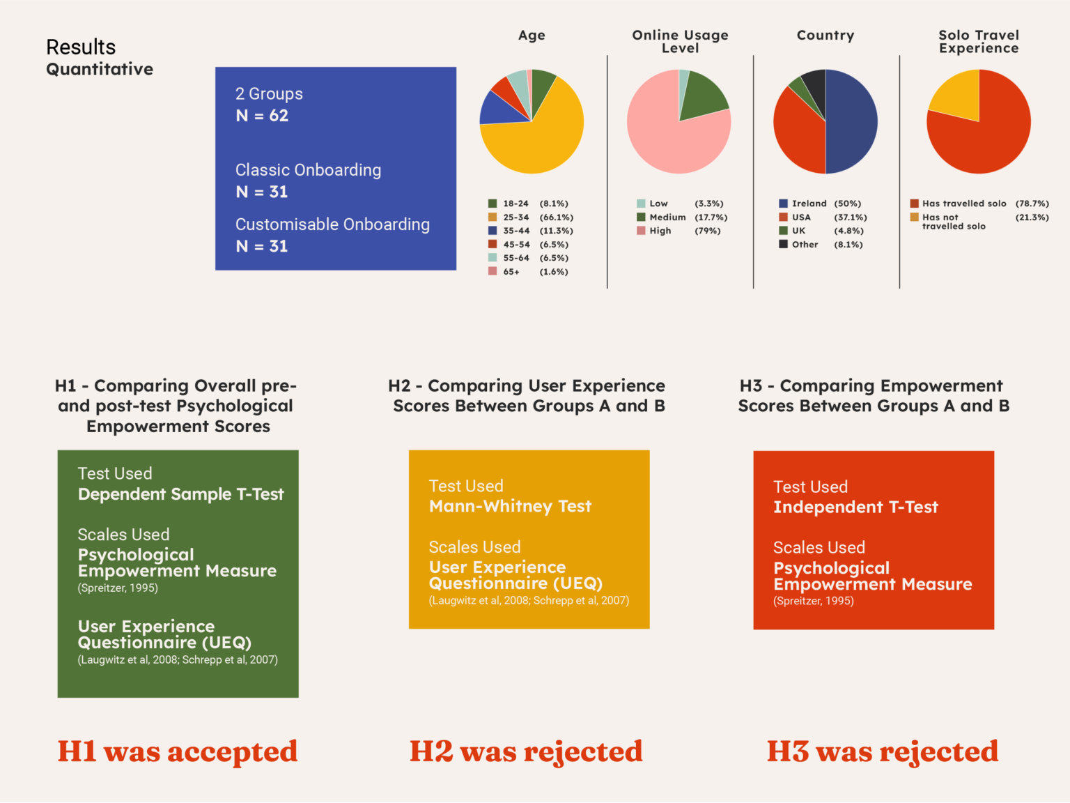 The majority of participants were aged 25-34, had a high online usage level, and most were from Ireland or the US. As well, the majority of participants had travelled solo before at least once.