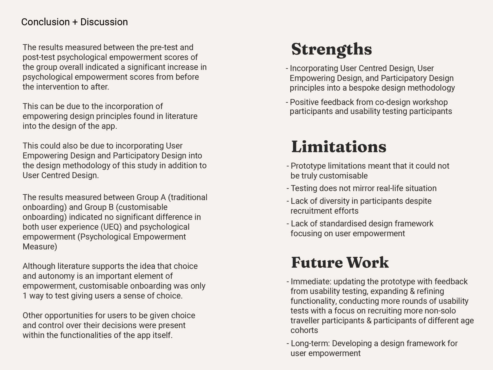 Solo travel is a transformative experience for women, leading to self-discovery and feeling empowered, enriched, brave, free, and in control. Even still, the female solo travel experience has barriers and constraints. Loneliness, safety and security, lack of confidence, and fear of social stigma have been identified as barriers that keep women from fully enjoying, or even being completely deterred from, travelling alone. This study further explored the factors that enhance and hinder the female solo travel experience, as well as investigated if the UX design of a mobile application can influence a user’s feeling of empowerment and, more specifically, help women have a more enriching and transformative solo travel experience. A group of 62 participants completed usability testing to determine if implementing empowering UX principles into the design of a mobile application and giving users choice and control in the form of customisable onboarding affected their feeling of empowerment and their overall user experience.