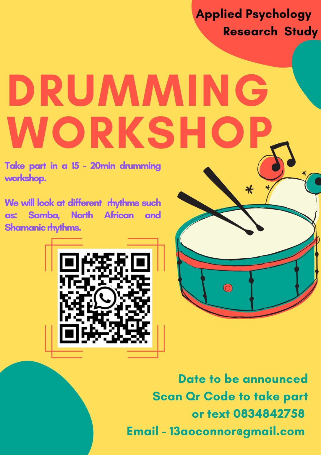 Psychology and the Psychology of Music. The thesis consisted of an experiment which consisted of three drumming workshops. Each workshop explored different styles and rhythms of drumming. The participants in this experiment learned styles such as Samba, Free-Form and Shamanic drumming.