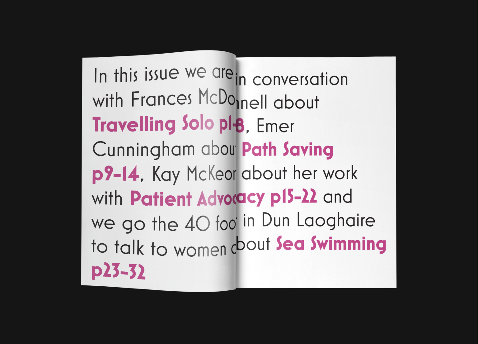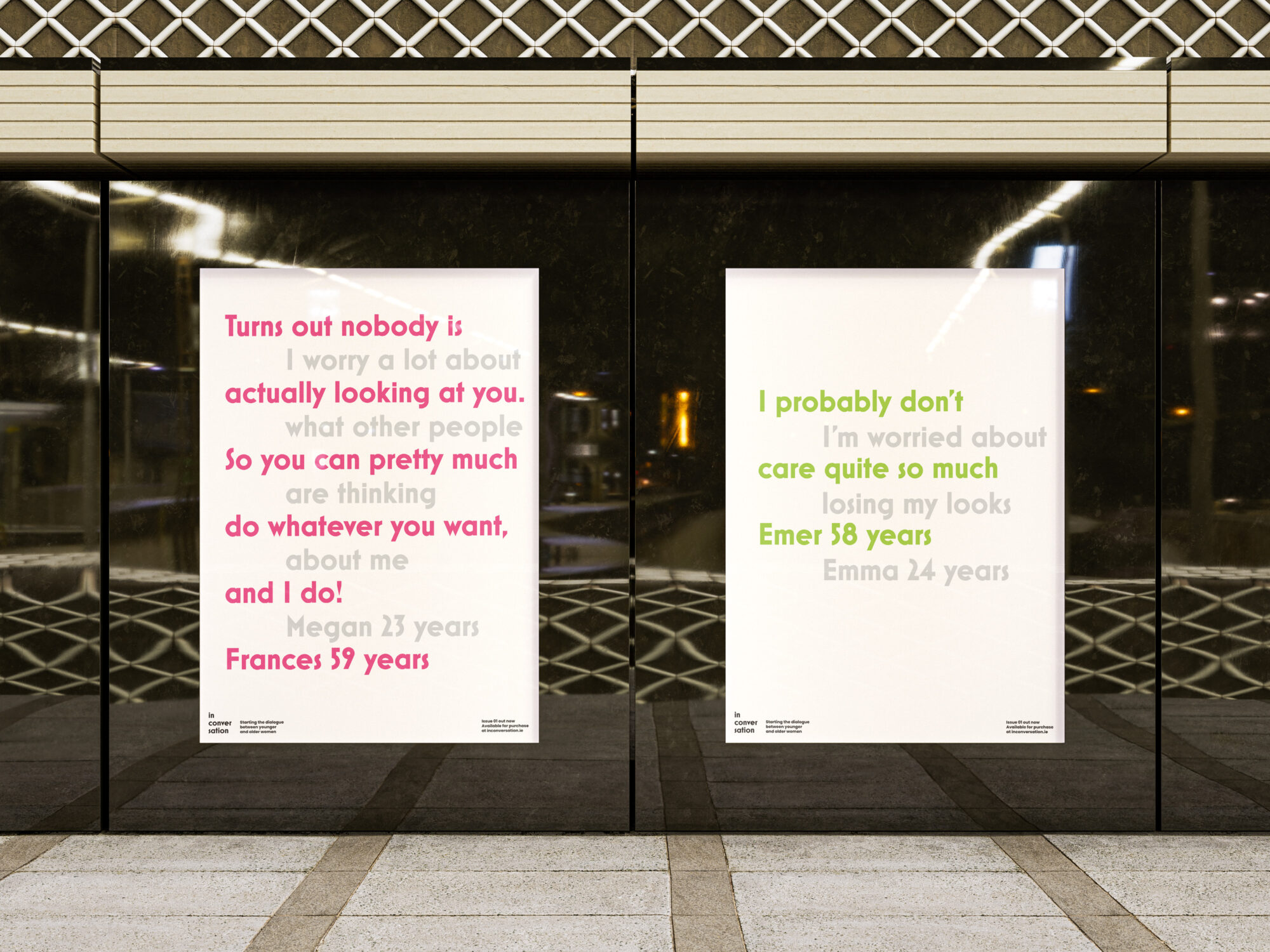 Many young women are worried about getting older. Society stigmatises visible ageing in women. Over a quarter of women under 25 admit that they regularly worry about signs of ageing. 78% of women over 50 believe that beauty focusses on fighting rather than embracing ageing. This project created a magazine, In Conversation, to try to combat this fear of getting older in young women. It is a quarterly magazine which contains articles about women over the age of forty. This issue contains articles on topics such as sea swimming, solo travel, bee keeping and making change. The articles are a mixture of written material, photography and bold typography.