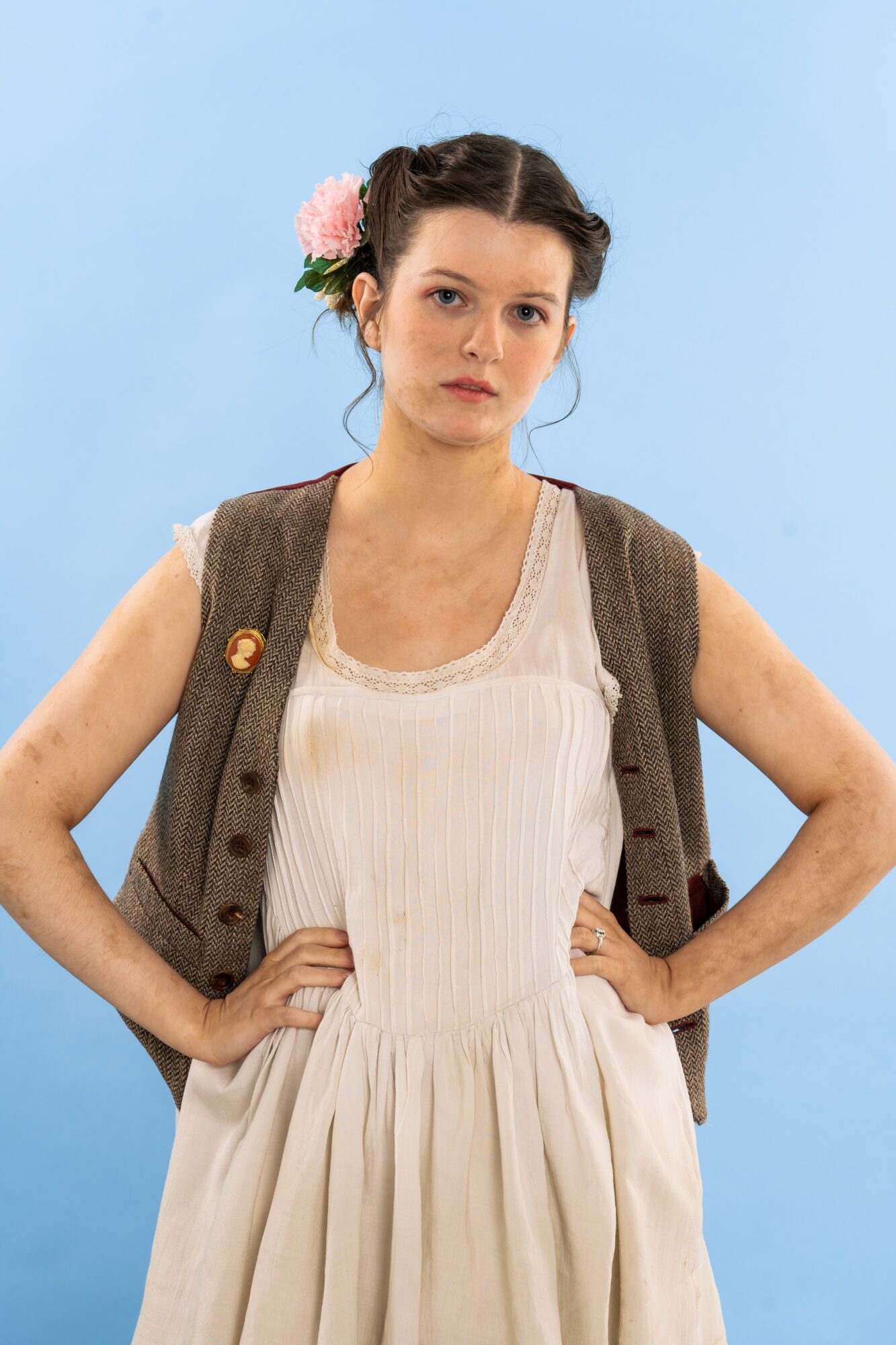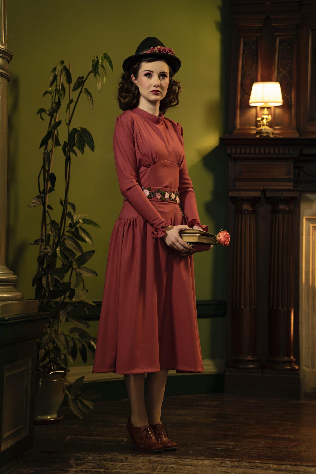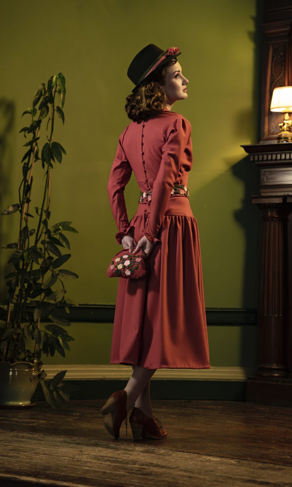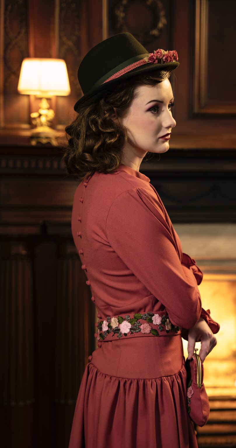 For his final project, Ben designed for the musical She Loves Me, setting it in 1937 Vienna. The technical make was his design for the lead female, Amalia Balast, for the scene where she goes on a blind date to a romantic café. The dress was made in a medium weight viscose crepe, with a gathered skirt falling from a curved yoke at the waist. The bodice is gathered at the bust points, as are the sleeve shoulders, and the sleeves are cuffed with frills. The dress closes at the centre back with a row of covered buttons and loops, and the dress is accessorised with an embroidered belt. The purse was made with the same fabric and embroidery, and the hat was decorated with silk flowers in a matching colour.