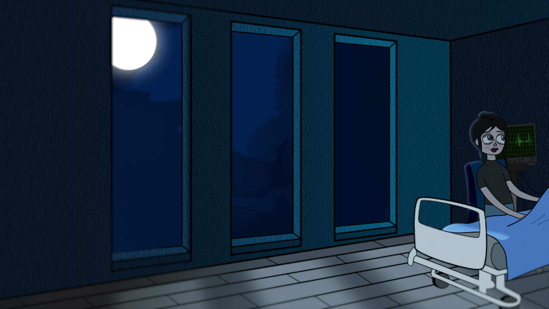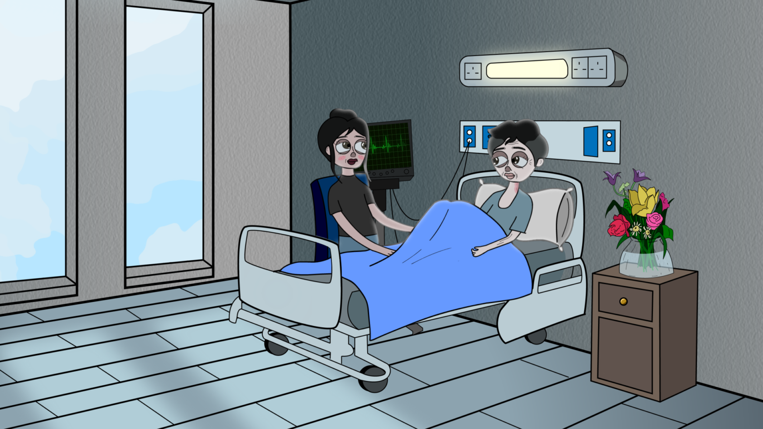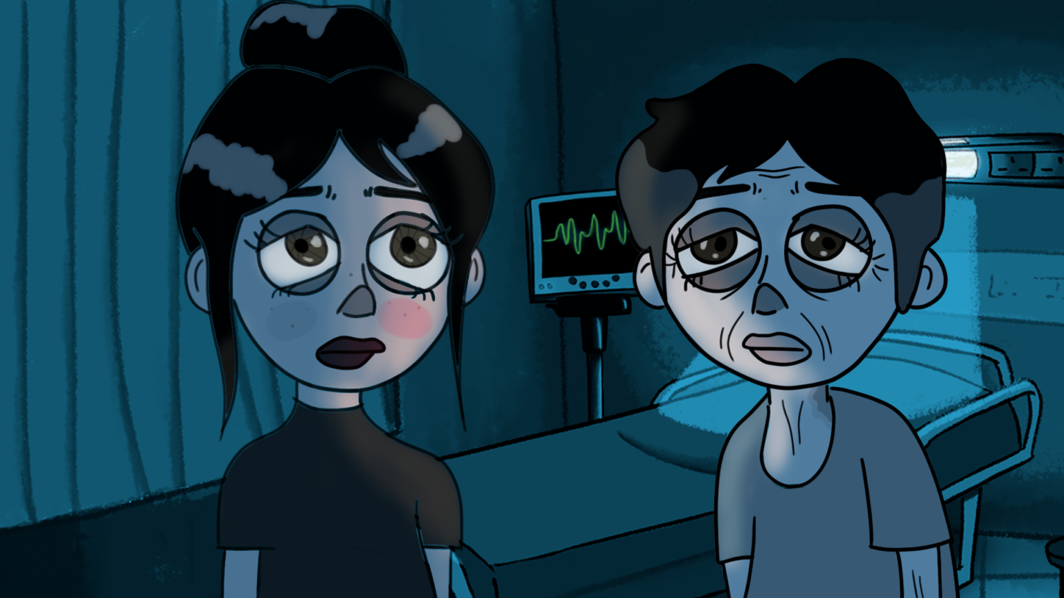 Throughout the film I aim to balance the overwhelming elements of the hospital with the serenity of the characters to create the feeling that this film is an insight into one of many such hospital visits between the two. This project was 2D animated as I found that to be the best fit for the story I was telling.